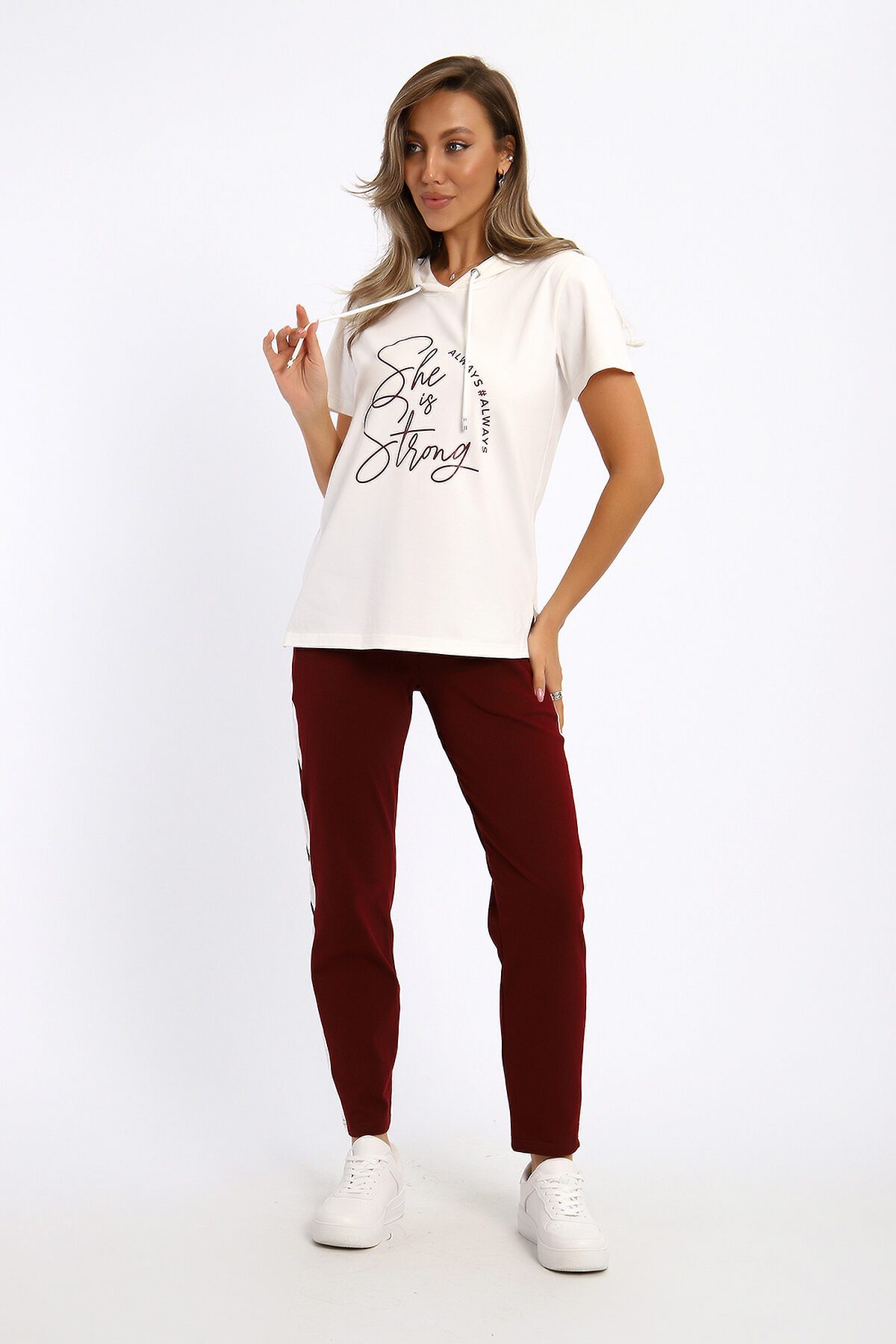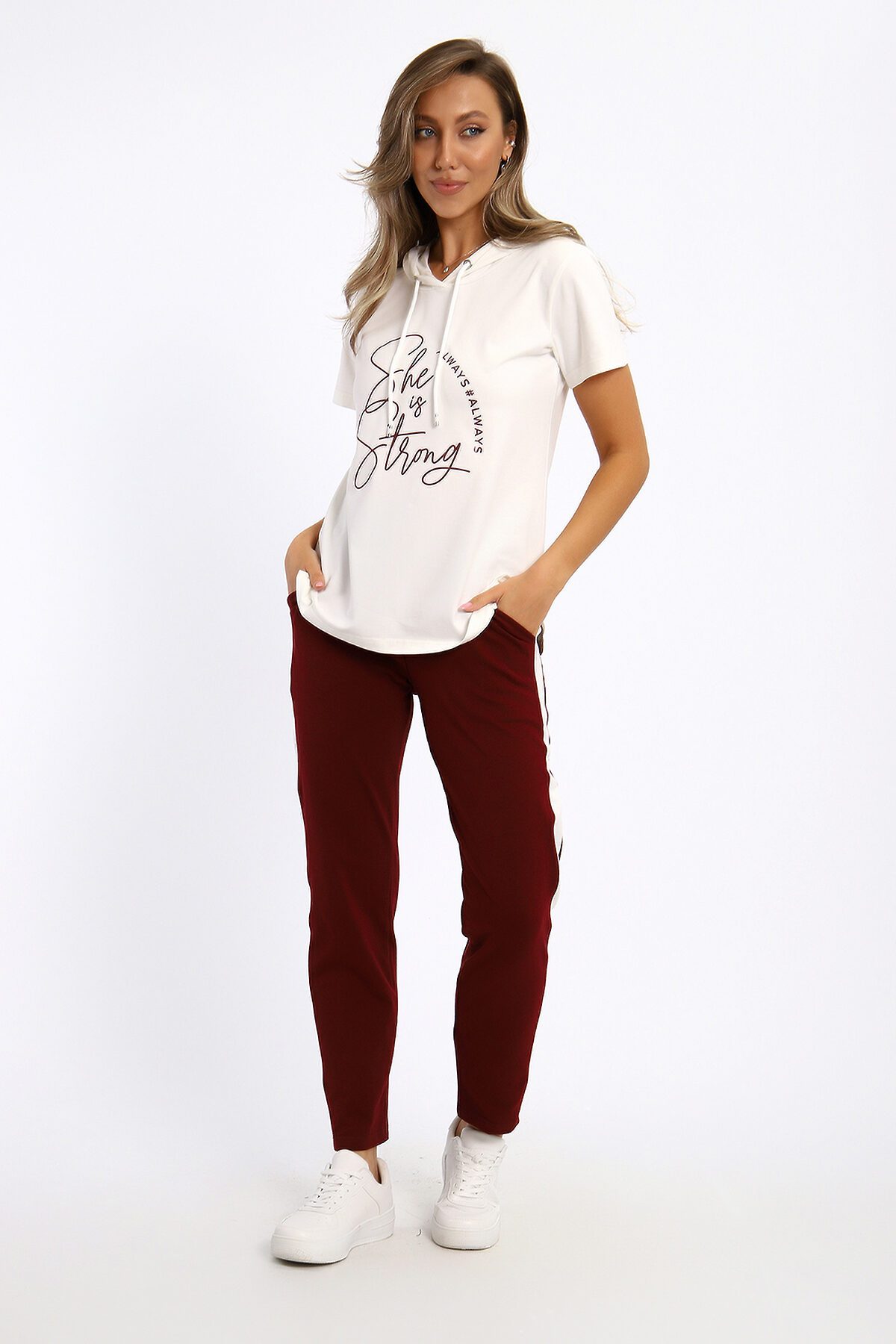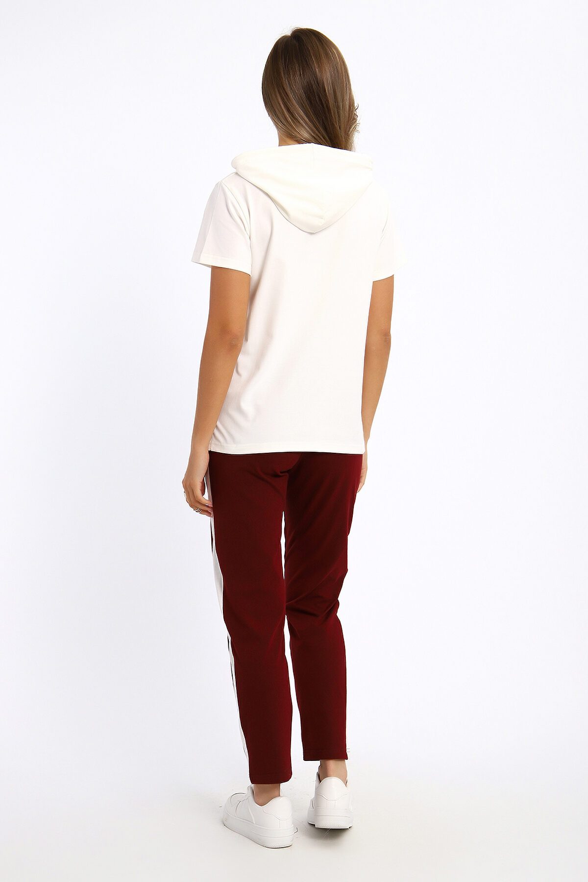 Удобный, женственный трикотажный костюм со спортивной ноткой подарит вам чувство комфорта и позволит выглядеть сногсшибательно в любой ситуации! Костюм прекрасно подойдет для занятий спортом, пробежек или прогулок! Кофта белого цвета, с надписью латинскими буквами в цвет брюк, имеет капюшон, способный защитить волосы от солнечных лучей, ветра или дождя. Объем капюшона регулирует изящный шнурок. На брюках имеются лампасы белого цвета, гармонирующие с цветом кофты.