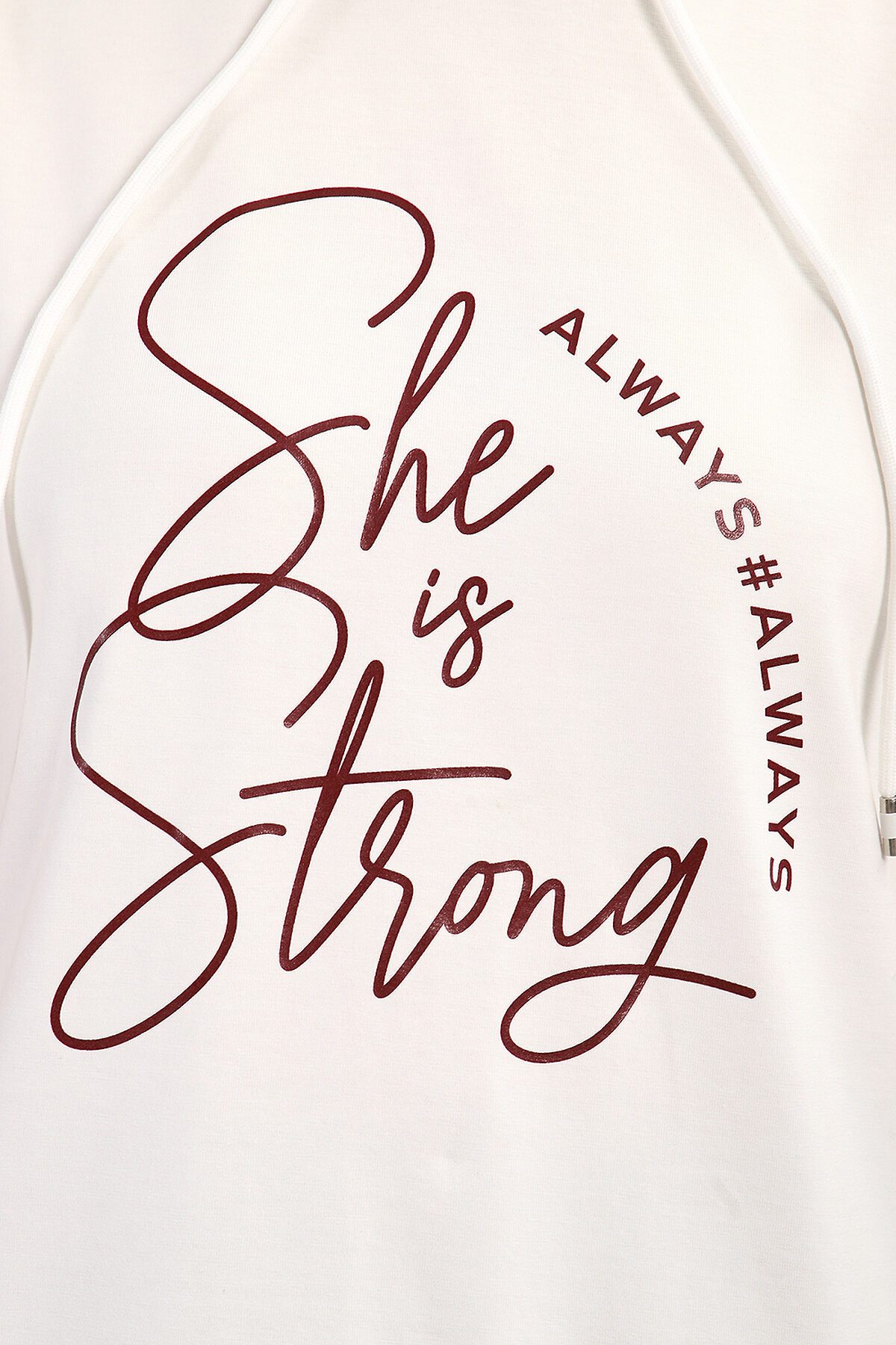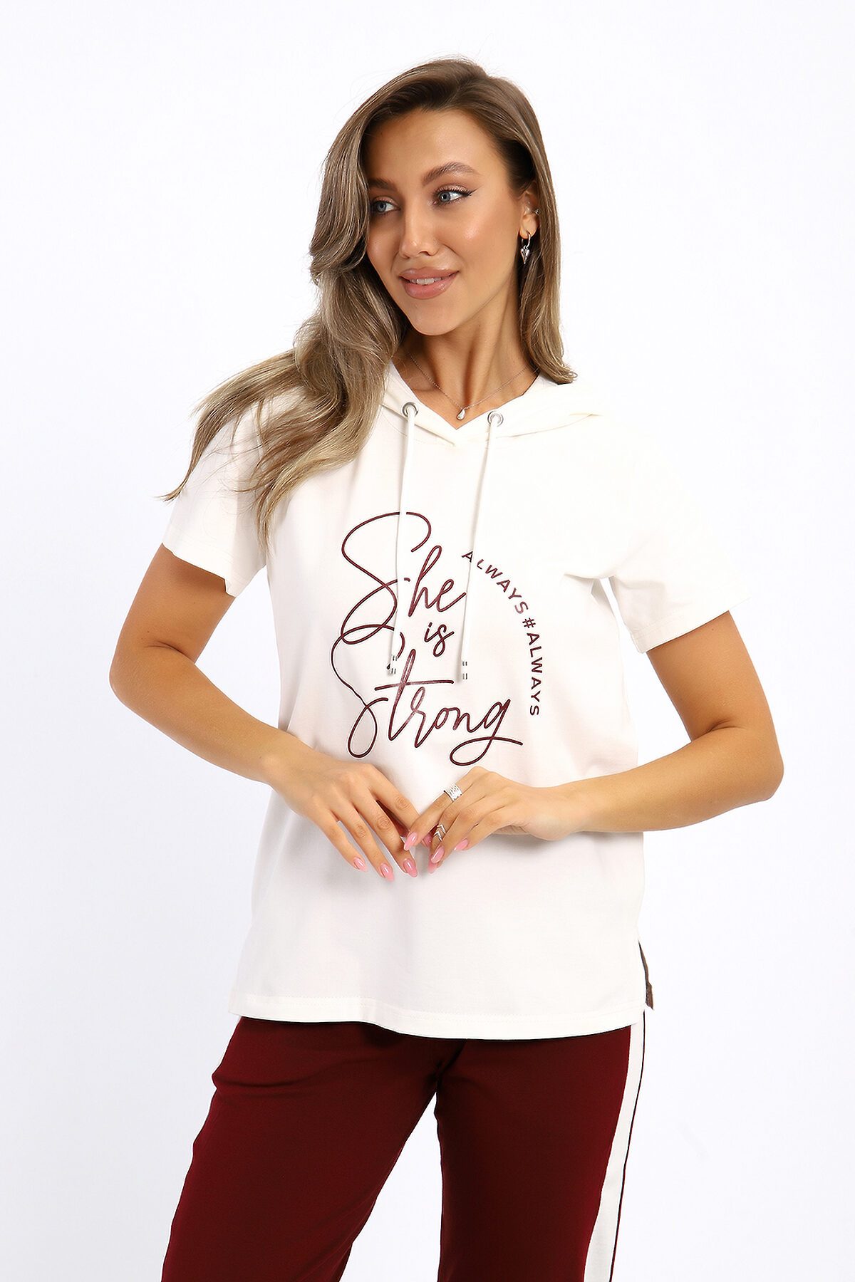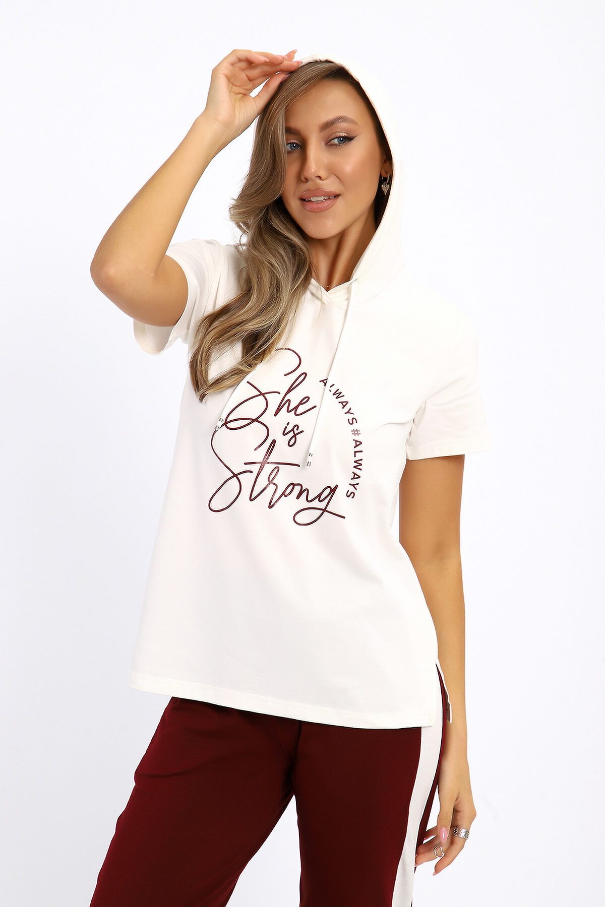 Удобный, женственный трикотажный костюм со спортивной ноткой подарит вам чувство комфорта и позволит выглядеть сногсшибательно в любой ситуации! Костюм прекрасно подойдет для занятий спортом, пробежек или прогулок! Кофта белого цвета, с надписью латинскими буквами в цвет брюк, имеет капюшон, способный защитить волосы от солнечных лучей, ветра или дождя. Объем капюшона регулирует изящный шнурок. На брюках имеются лампасы белого цвета, гармонирующие с цветом кофты.