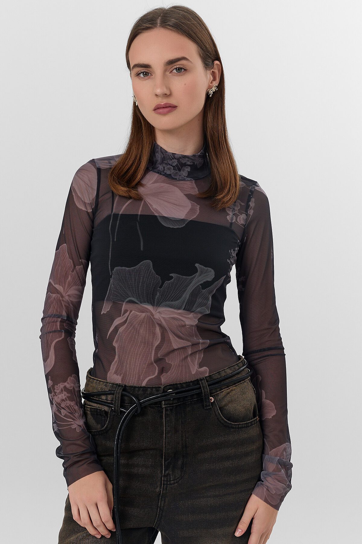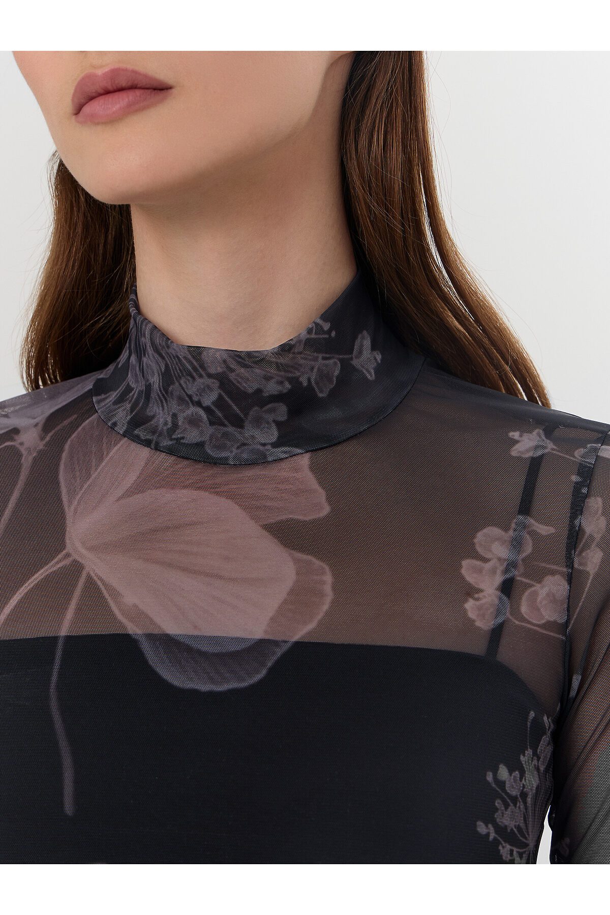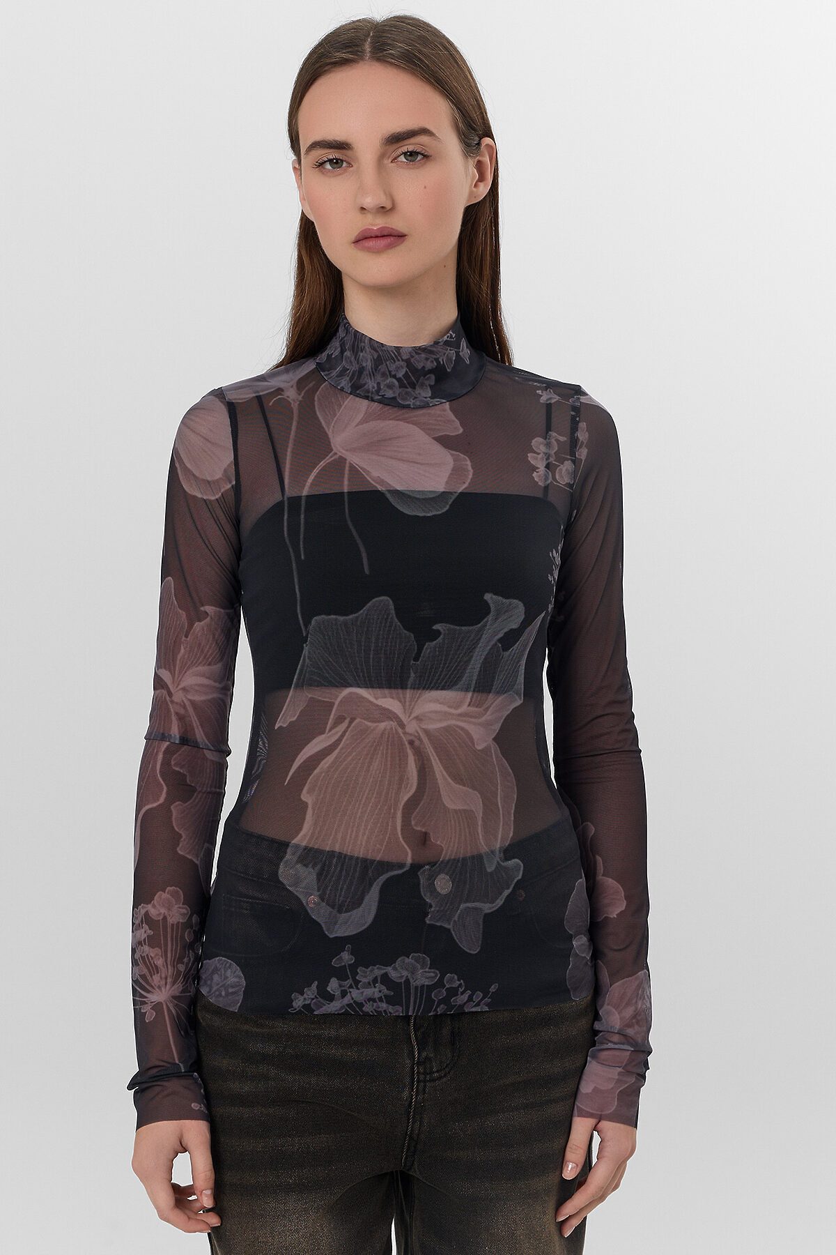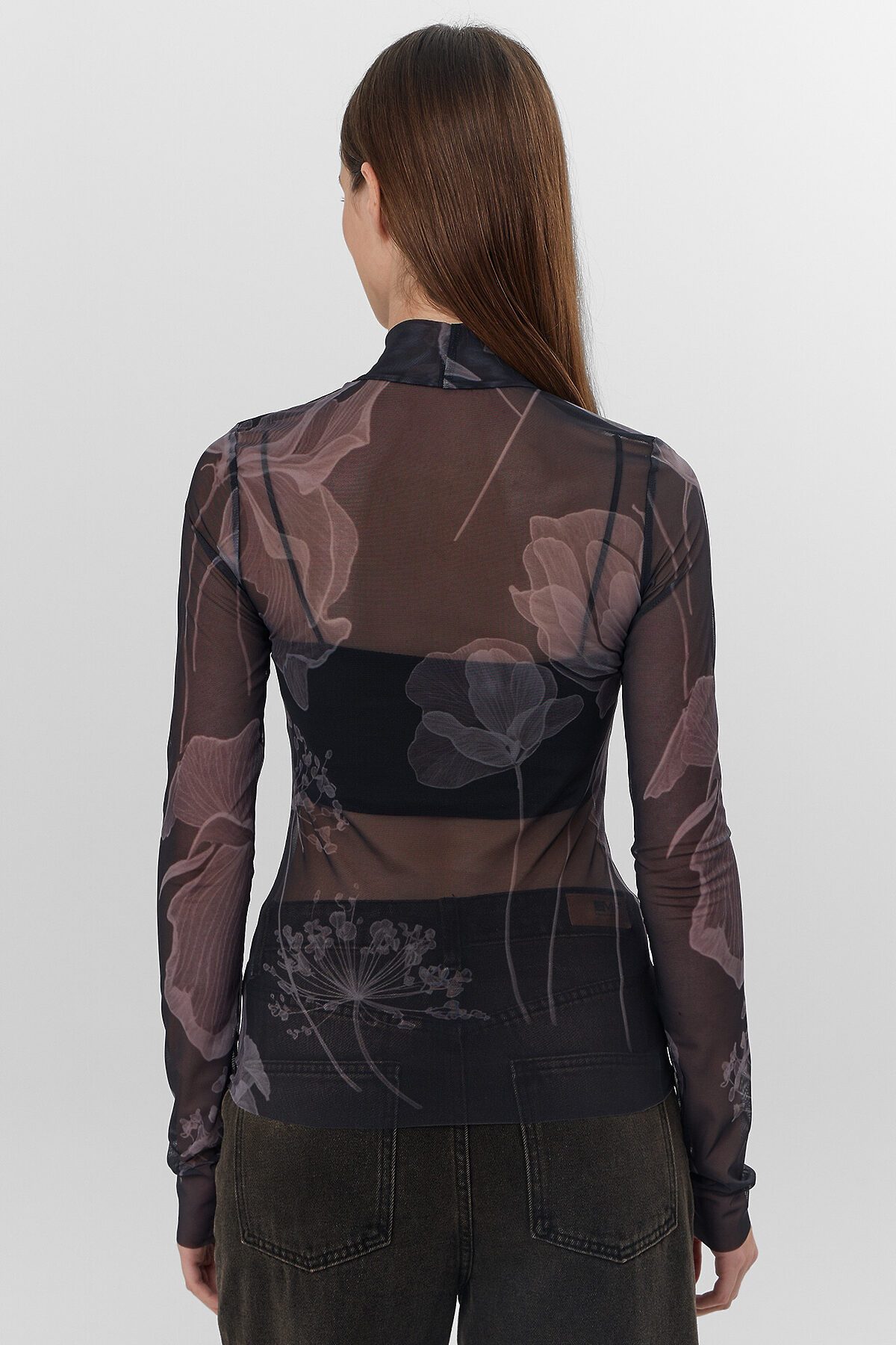 Джемпер женский прилегающего силуэта из трикотажного полотна сетка. Горловина круглой формы, с воротником стойкой. Рукав втачной длинный. Джемпер полной длины. Низ джемпера и рукавов сырой срез.