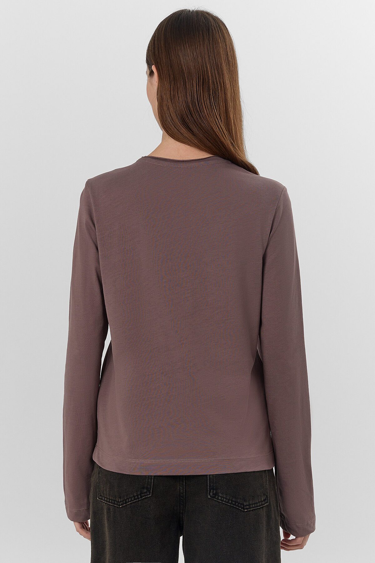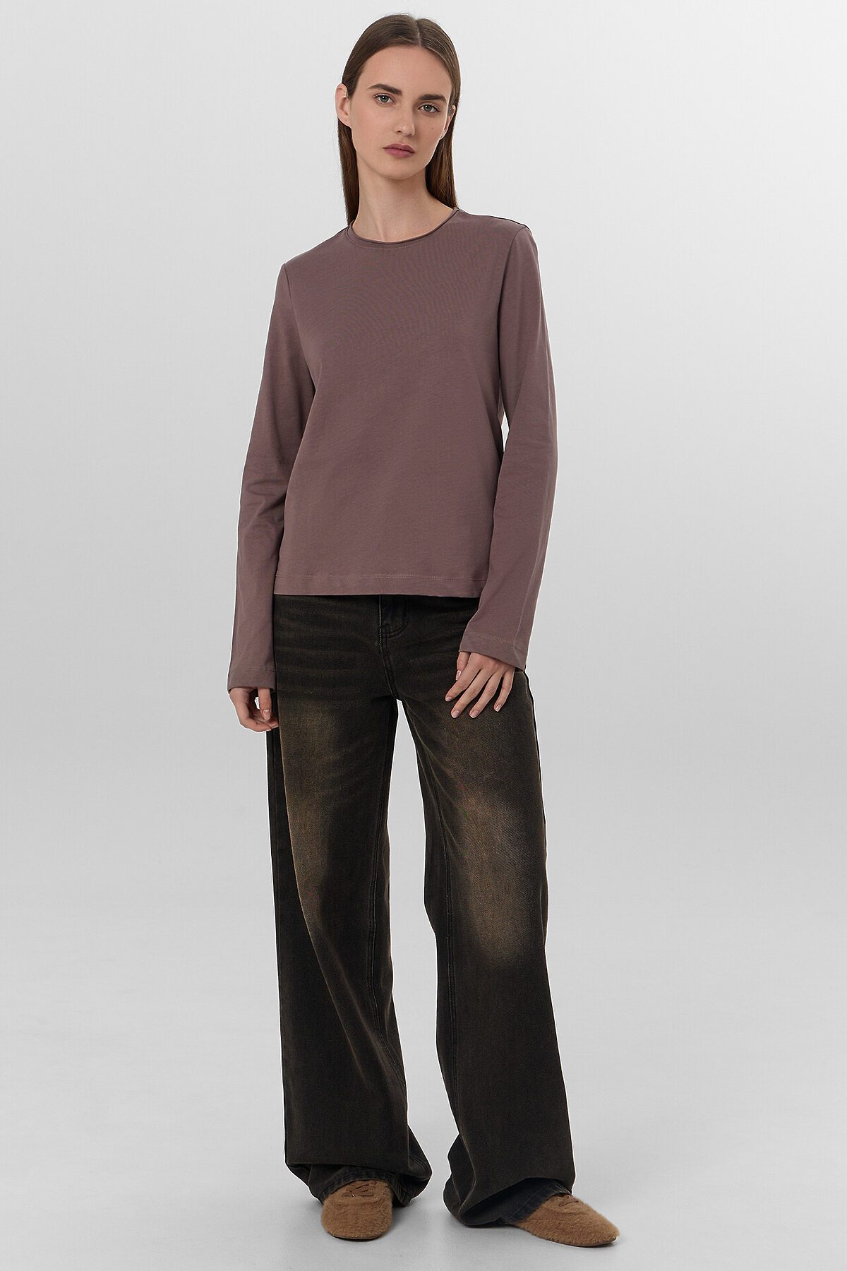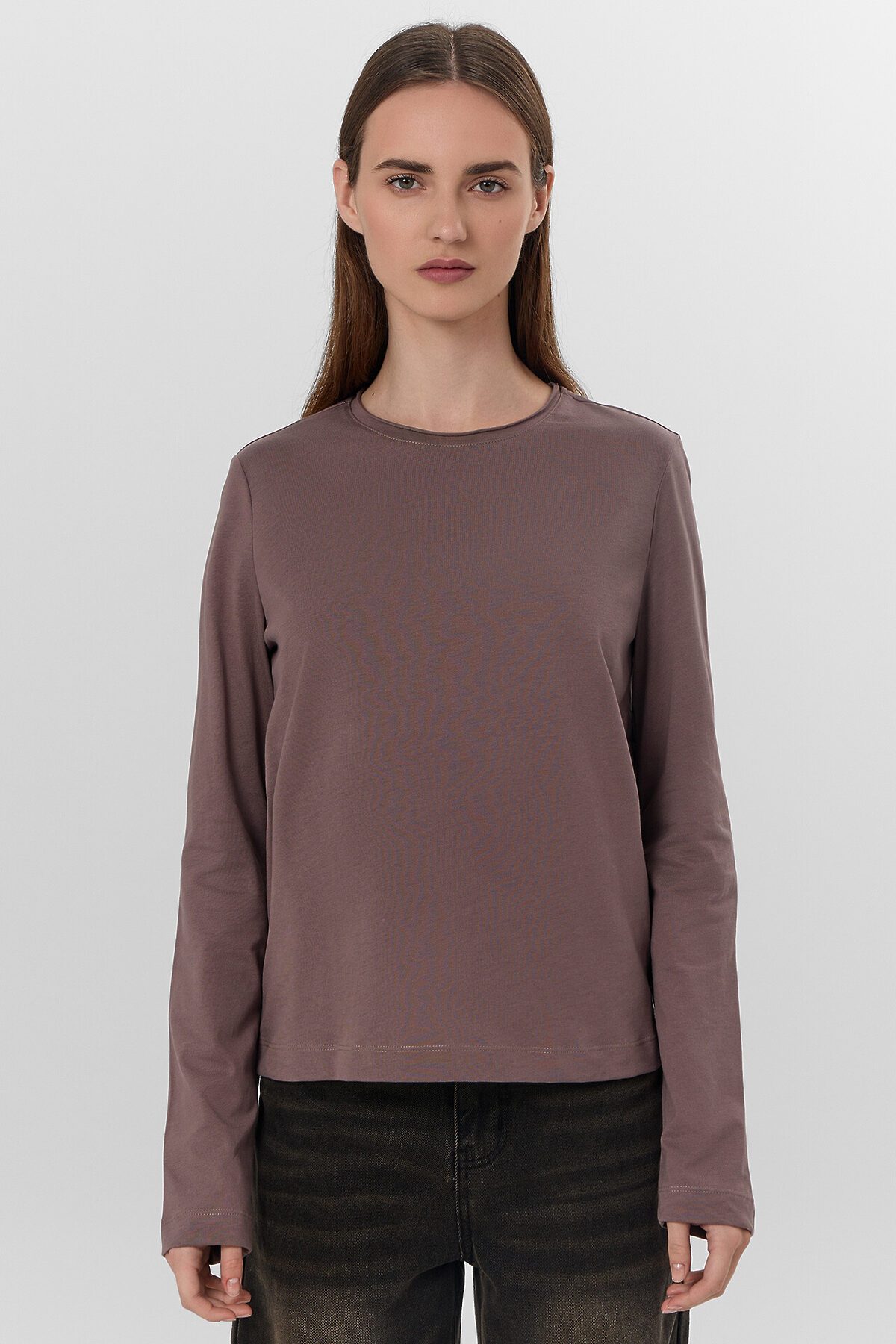 Лонгслив изготовлен из трикотажного полотна кулирка. Лонгсливпрямого силуэта.. Горловина обработана обтачкой с открытым срезом. Шов втачивания обтачки по спинке закрыт бейкой из основного полотна. Рукава втачные длинные. Нижние срезы лонгслива и рукава обработаны швом вподгибку