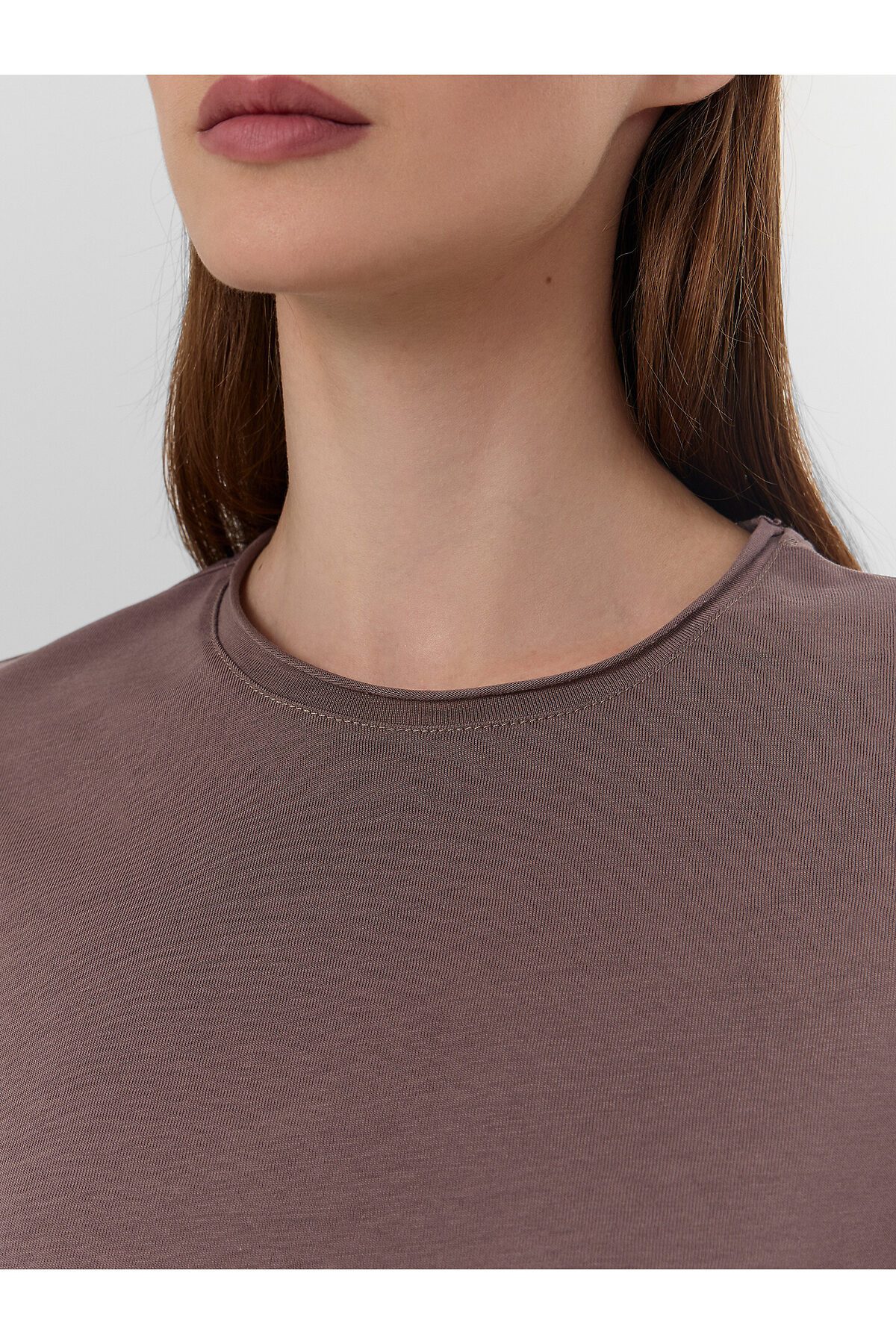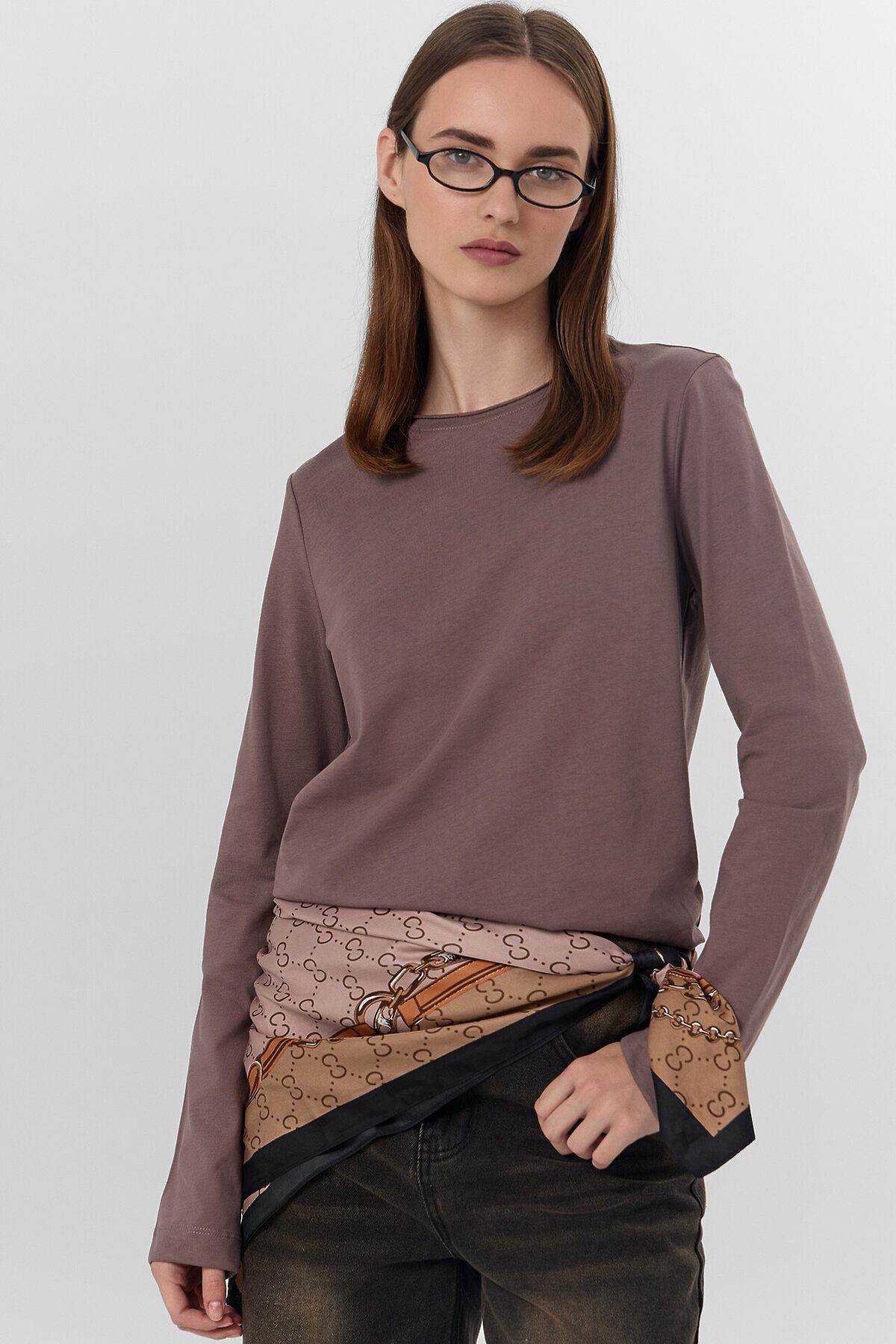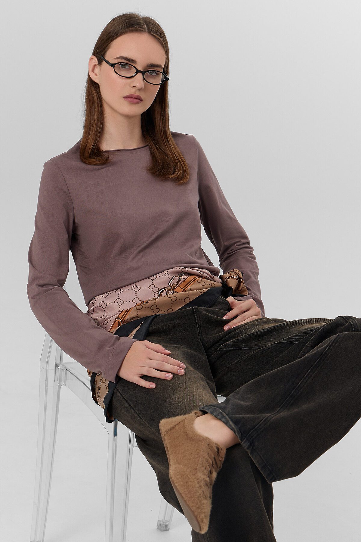 Лонгслив изготовлен из трикотажного полотна кулирка. Лонгсливпрямого силуэта.. Горловина обработана обтачкой с открытым срезом. Шов втачивания обтачки по спинке закрыт бейкой из основного полотна. Рукава втачные длинные. Нижние срезы лонгслива и рукава обработаны швом вподгибку