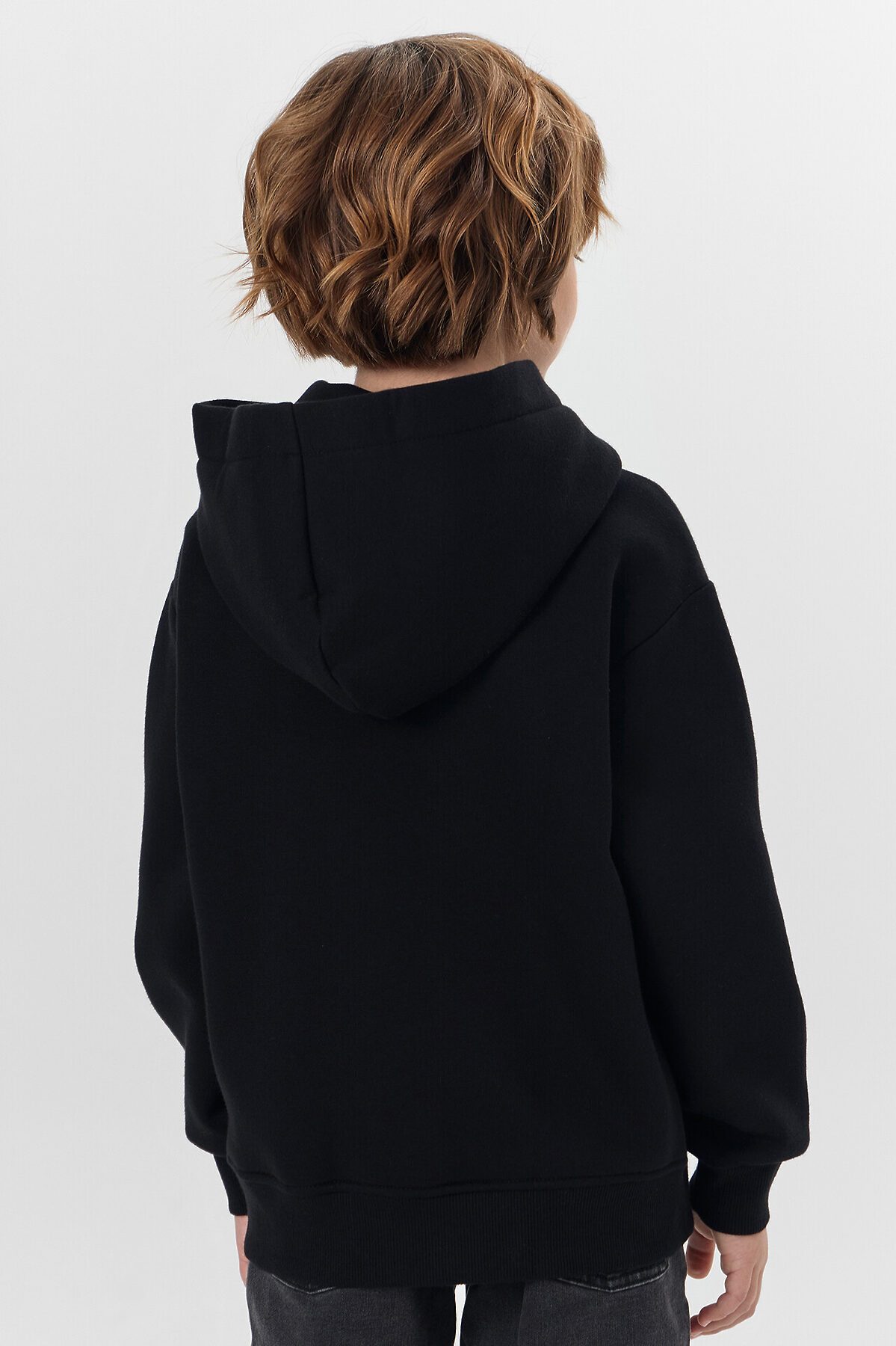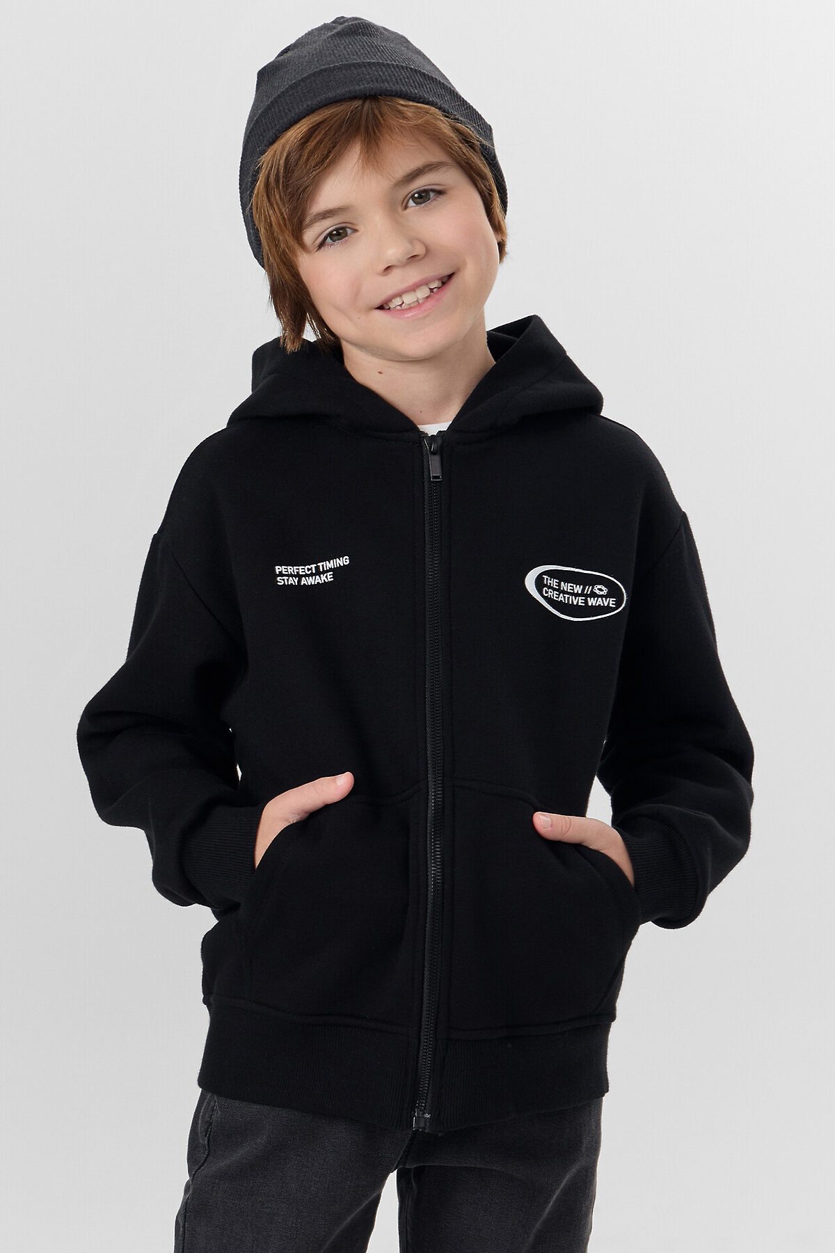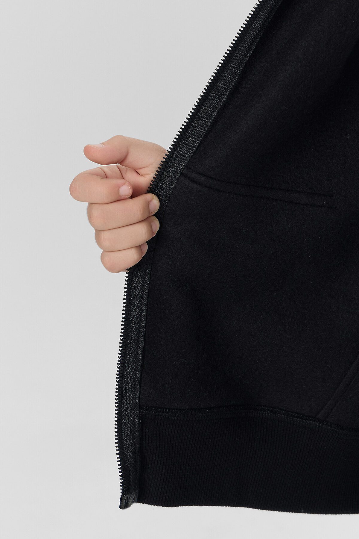 Жакет для мальчиков прямого силуэта с капюшоном. Капюшон на подкладке из основного полотна. Шов втачивания капюшона закрыт х/б тесьмой. Рукава втачные, линия плеча спущена. Притачные манжеты по низу рукавов и притачной пояс из рибаны. По переду застежка молния, карман кенгуру.