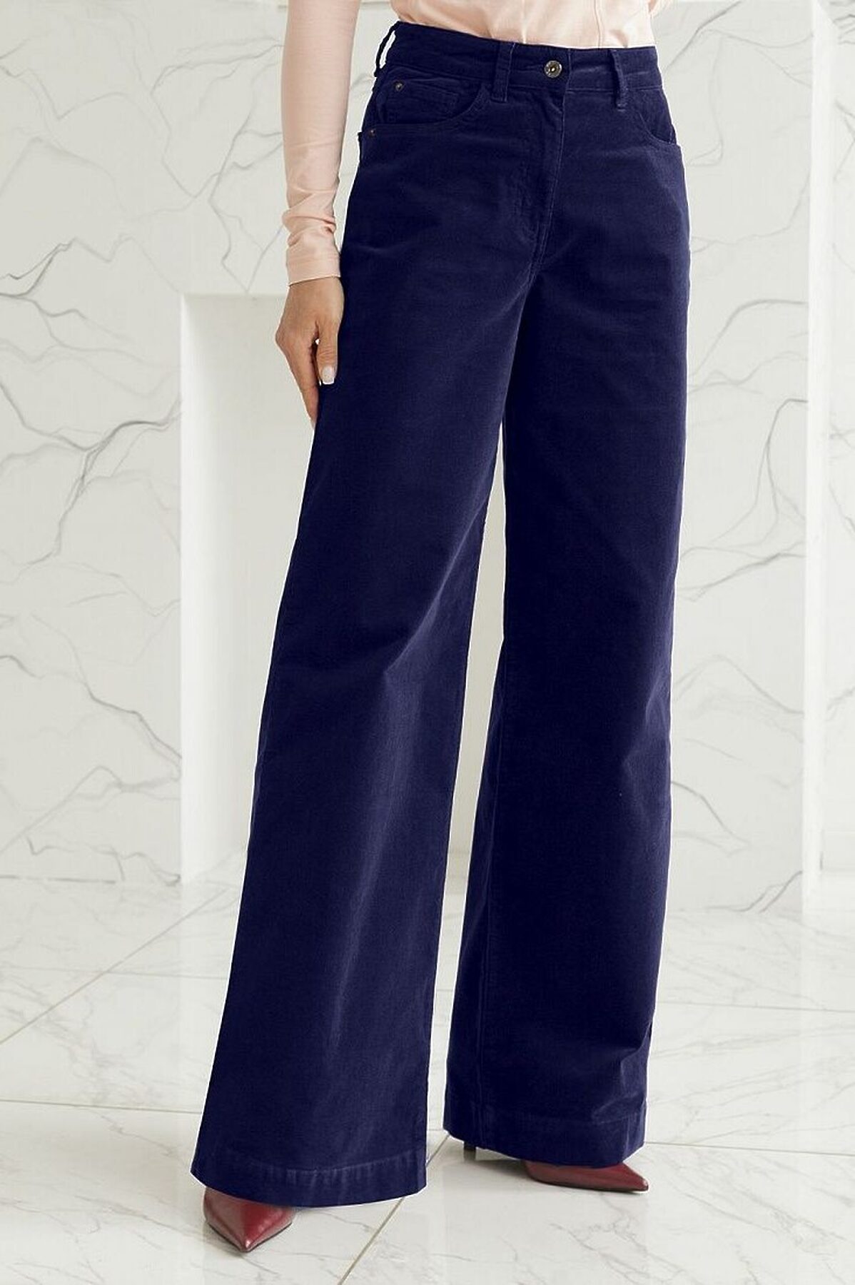 Брюки свободного кроя «трубы» выполнены из мягкого хлопкового микро-вельвета с добавлением эластана. Изделие комфортно садится по фигуре и не сковывает движения. Модель с пятью карманами, как у джинсов дополнена высококачественной фурнитурой с фирменным логотипом бренда. Идеально впишутся в повседневный образ, со свитером крупной вязки, курткой-косухой, ботинками на грубой подошве, челси и казаками.