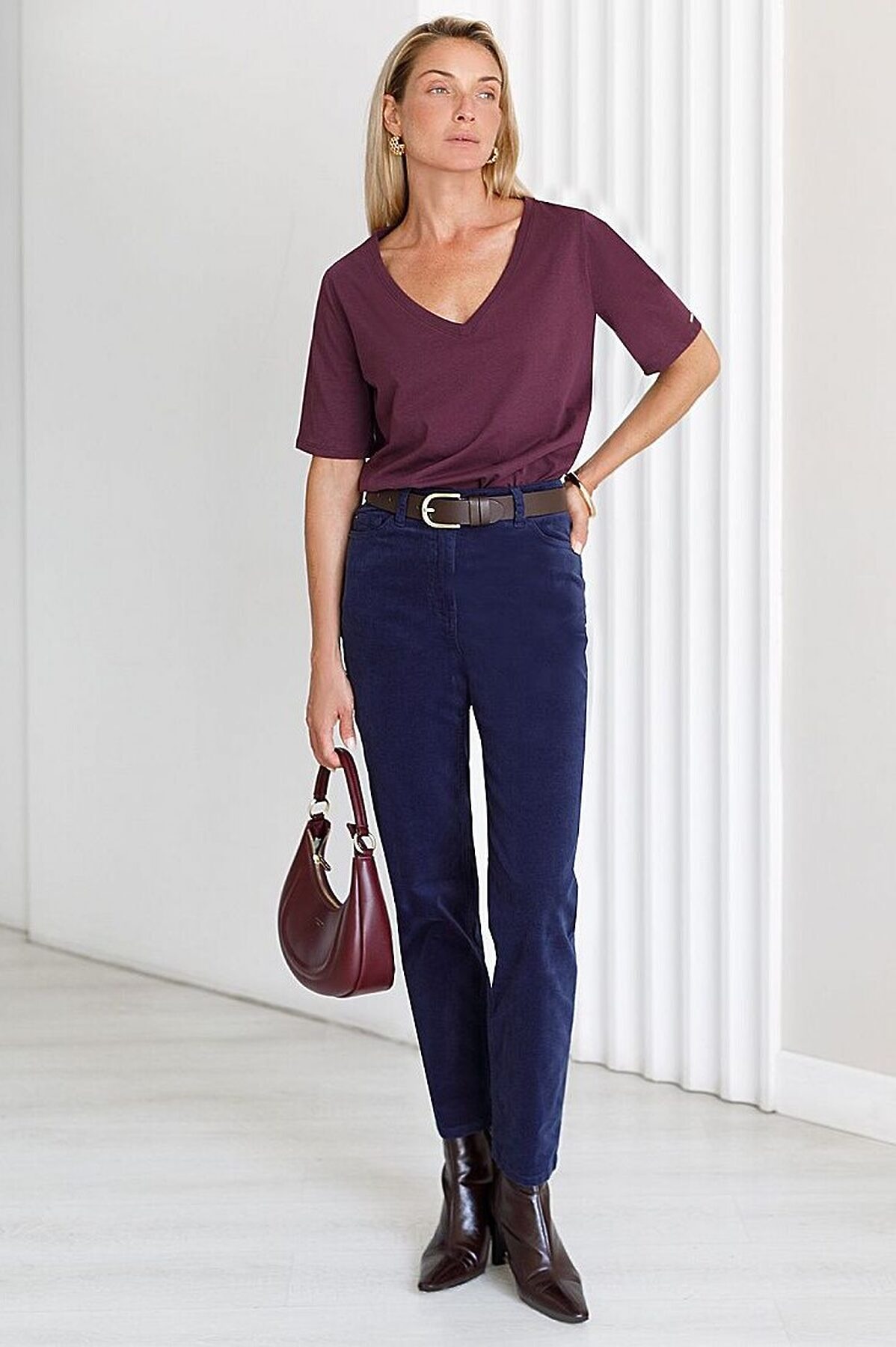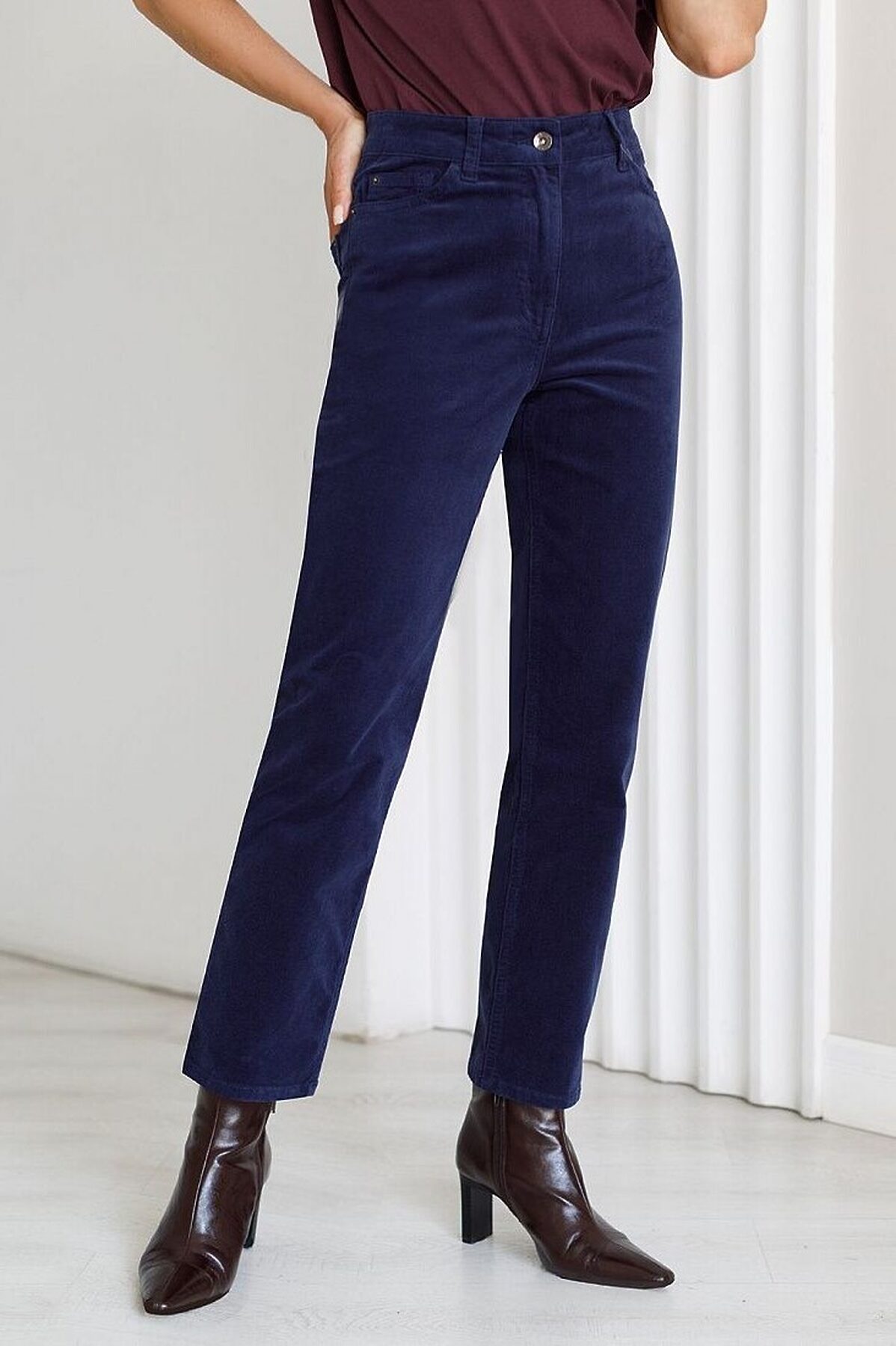 Брюки выполнены из мягкого хлопкового микро-вельвета с добавлением эластана. Изделие комфортно садится по фигуре и не сковывает движения. Модель с пятью карманами, как у джинсов-скинни дополнена высококачественной фурнитурой с фирменным логотипом бренда. Хорошо комбинируется с вязаным трикотажем, блузками и денимом. Как альтернатива брюкам, в нестрогий офисный дресс-код.