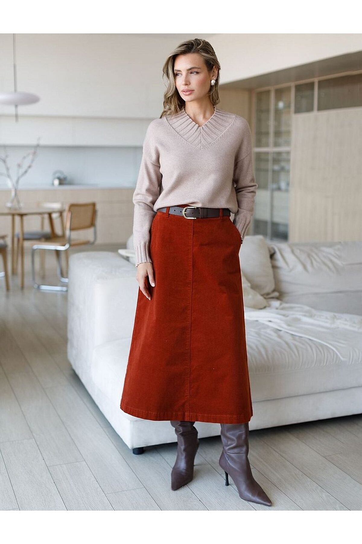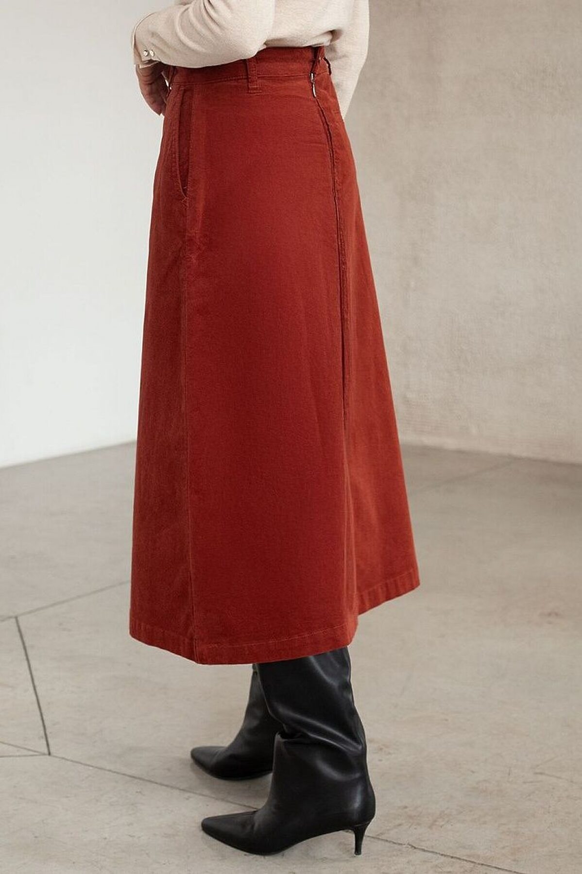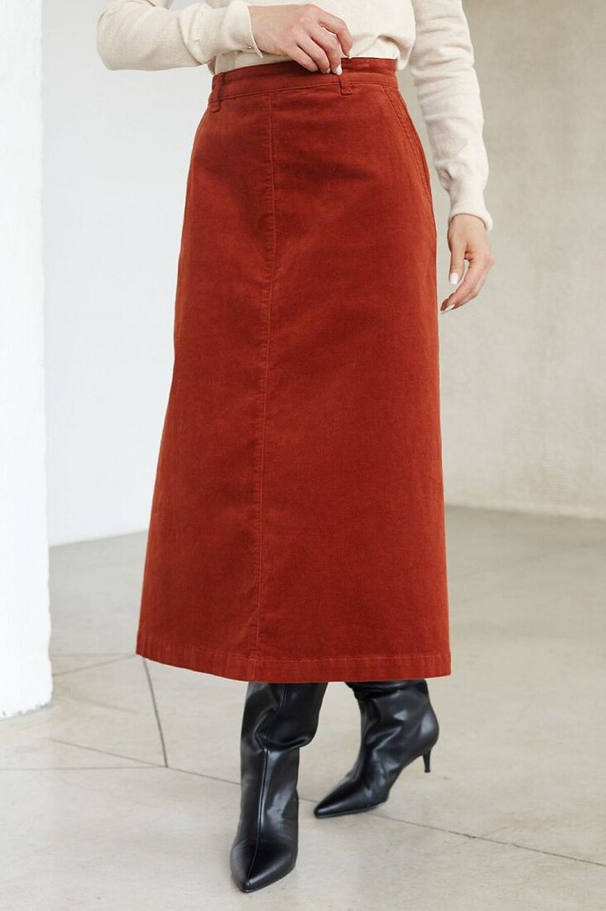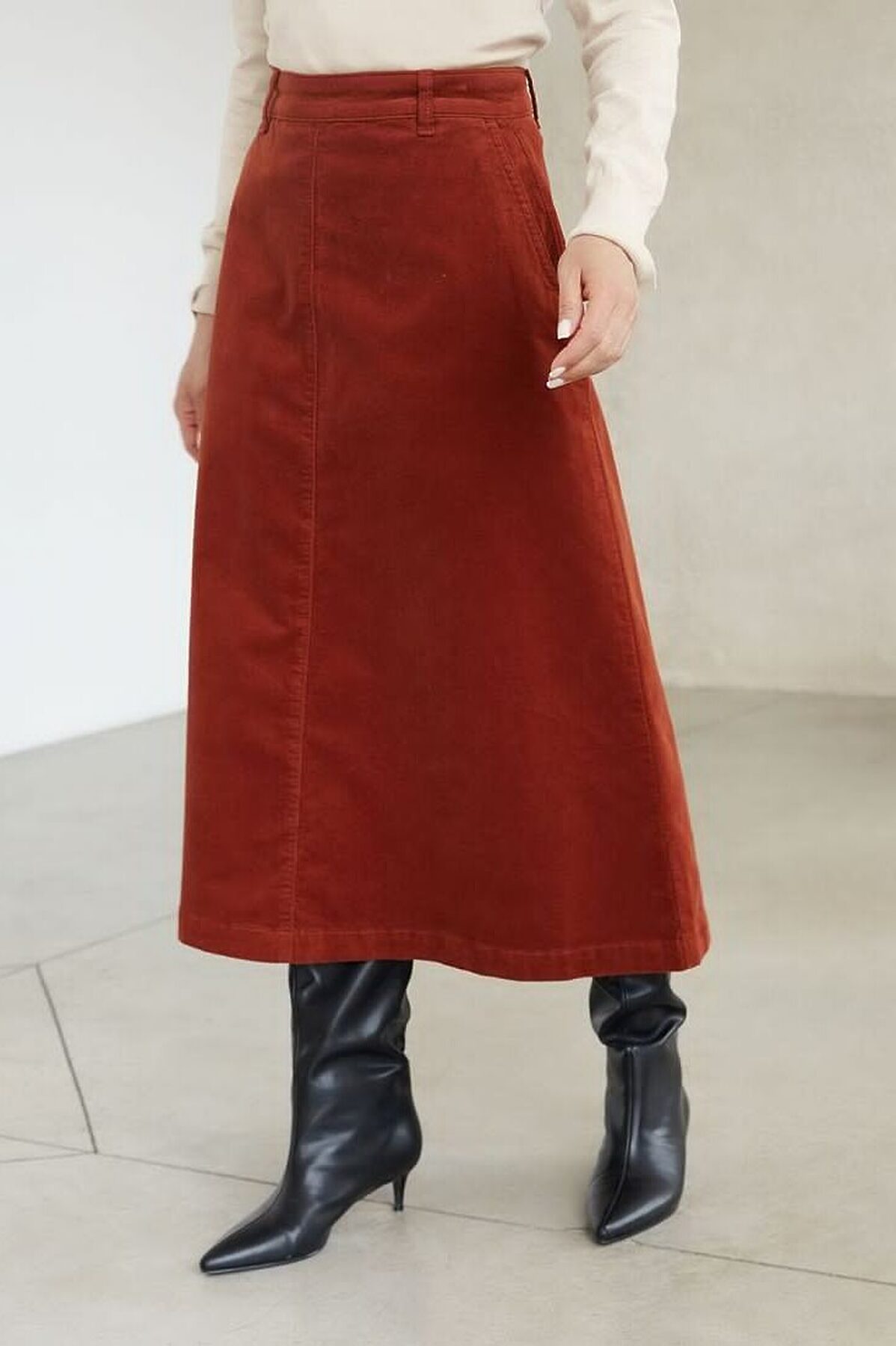 Юбка-миди трапециевидного силуэта выполнена из мягкого хлопкового микро-вельвета с добавлением эластана. Изделие комфортно садится по фигуре и не сковывает движения. Модель дополнена высококачественной фурнитурой с фирменным логотипом бренда. Хорошо комбинируется с вязаным трикотажем, блузками и денимом.Также прекрасно станет альтернативой деловым низам в нестрогом офисном дресс-коде.
