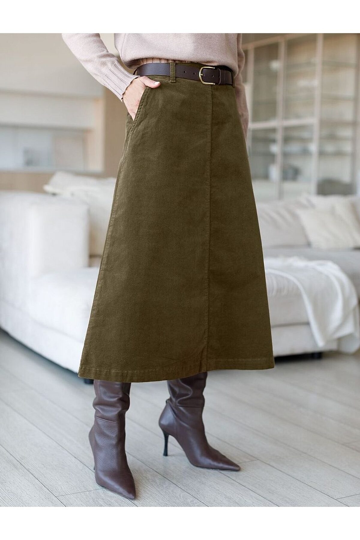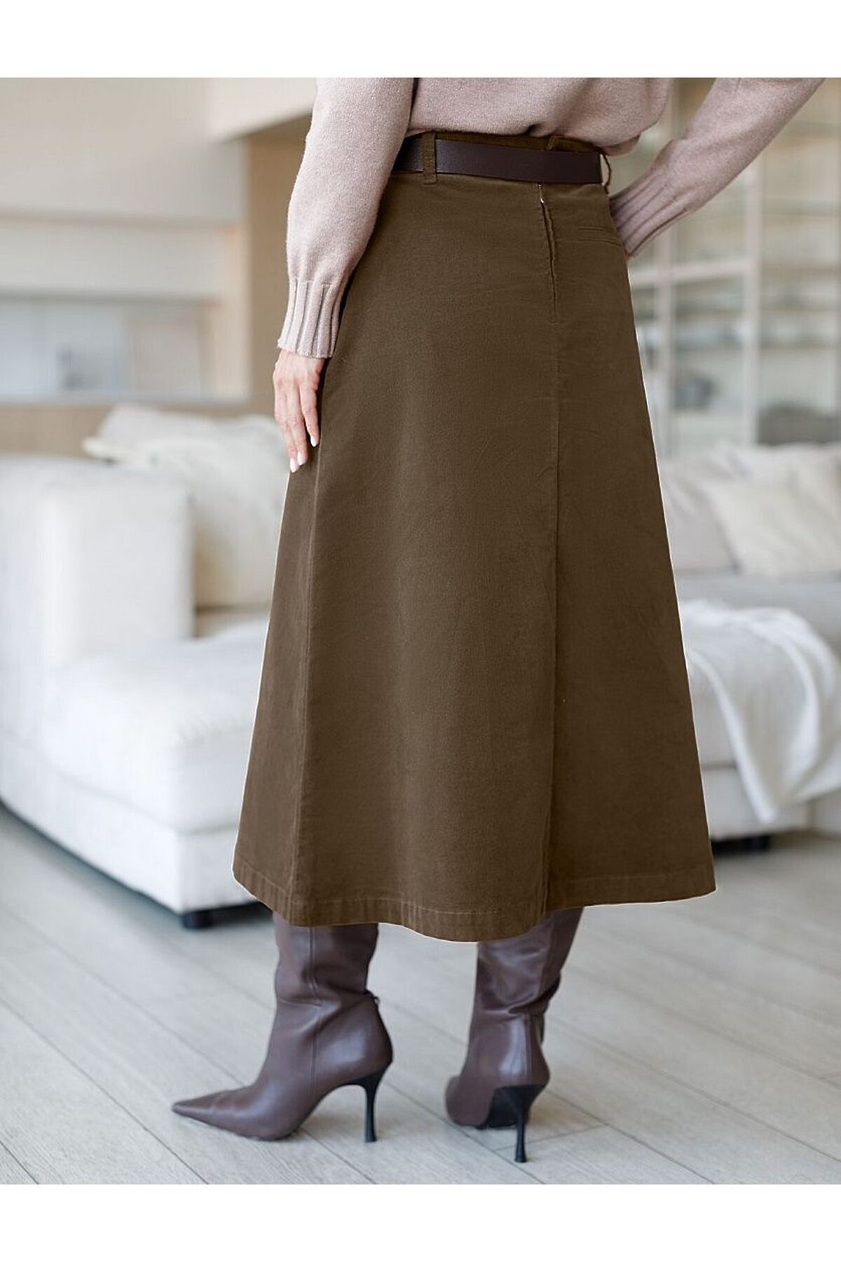 Юбка-миди трапециевидного силуэта выполнена из мягкого хлопкового микро-вельвета с добавлением эластана. Изделие комфортно садится по фигуре и не сковывает движения. Модель дополнена высококачественной фурнитурой с фирменным логотипом бренда. Хорошо комбинируется с вязаным трикотажем, блузками и денимом.Также прекрасно станет альтернативой деловым низам в нестрогом офисном дресс-коде.