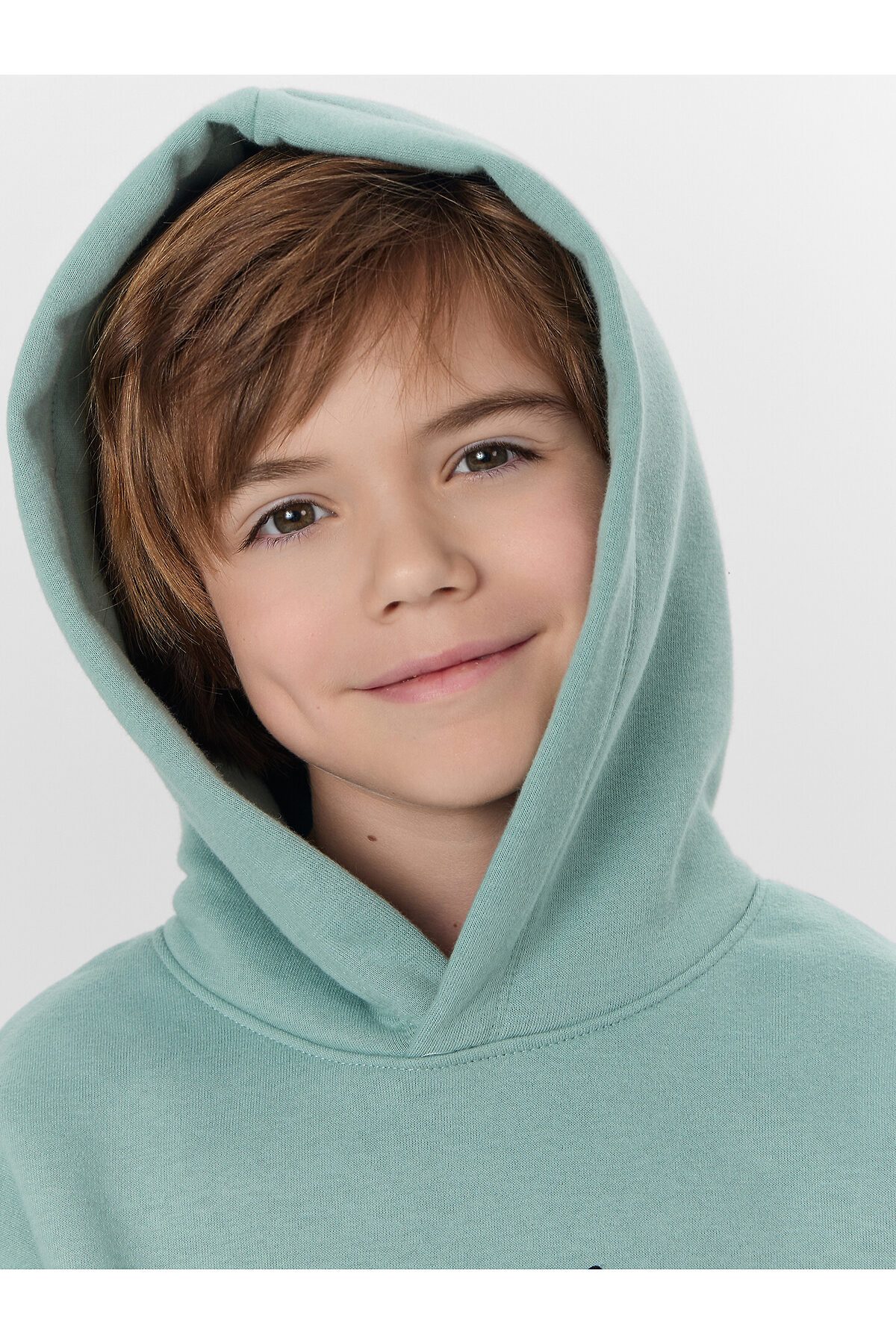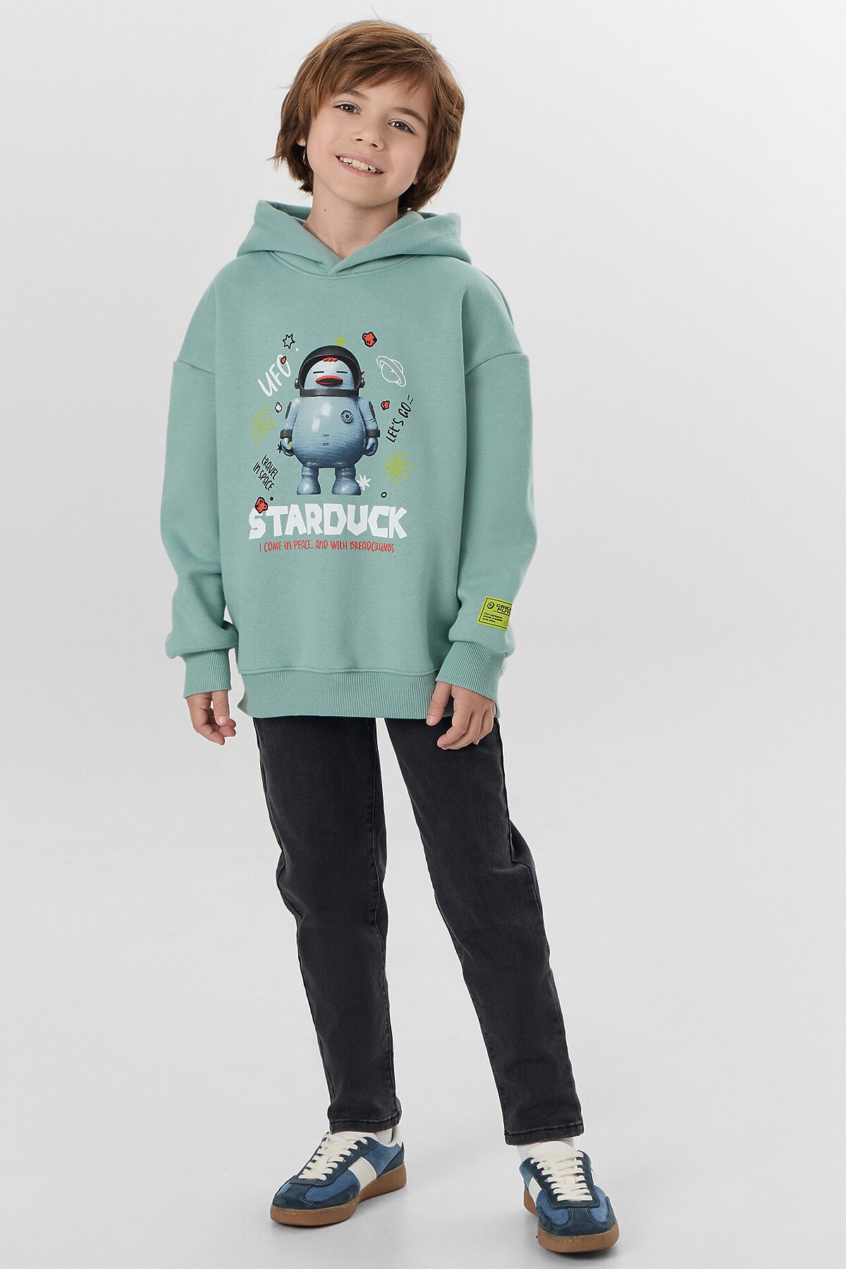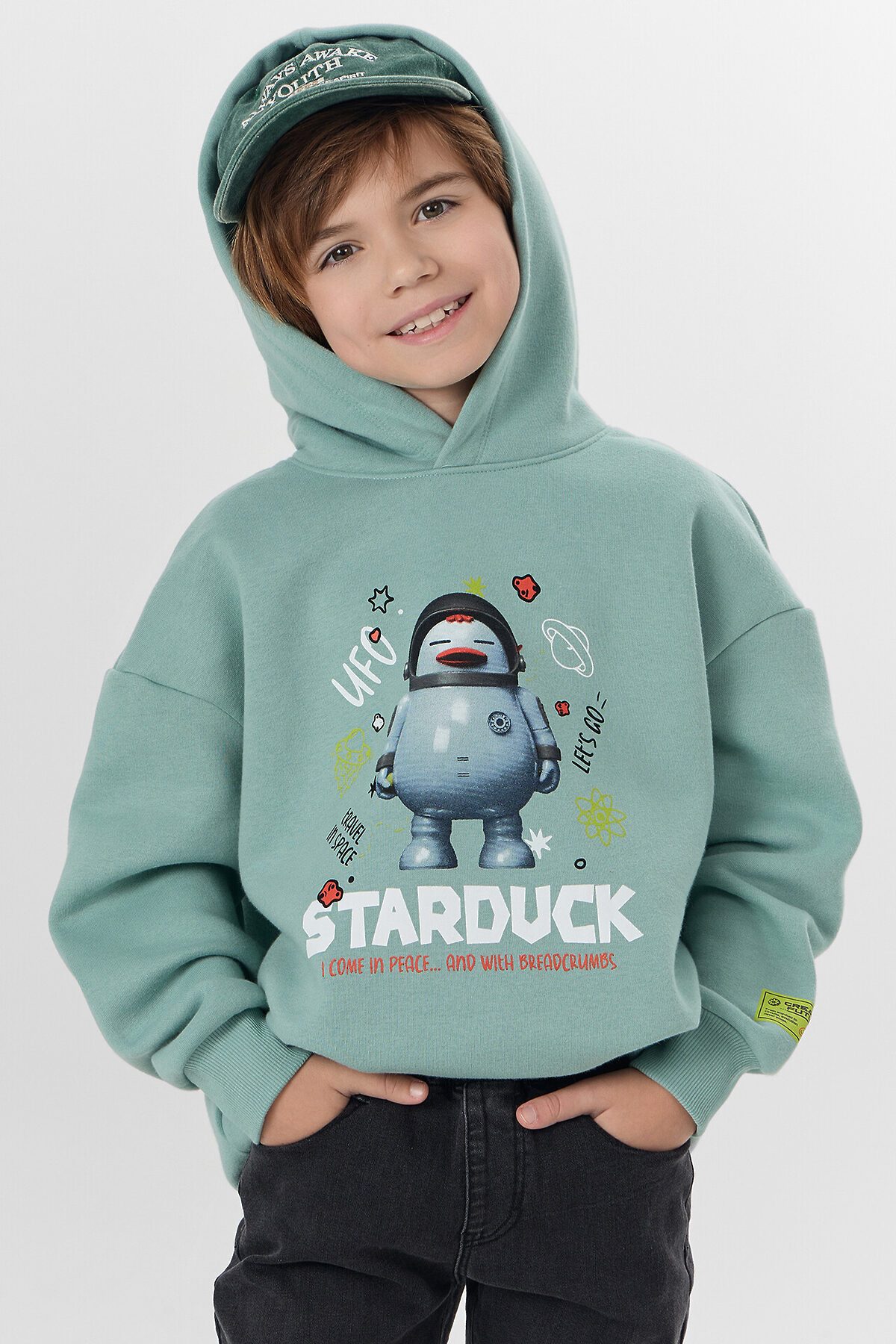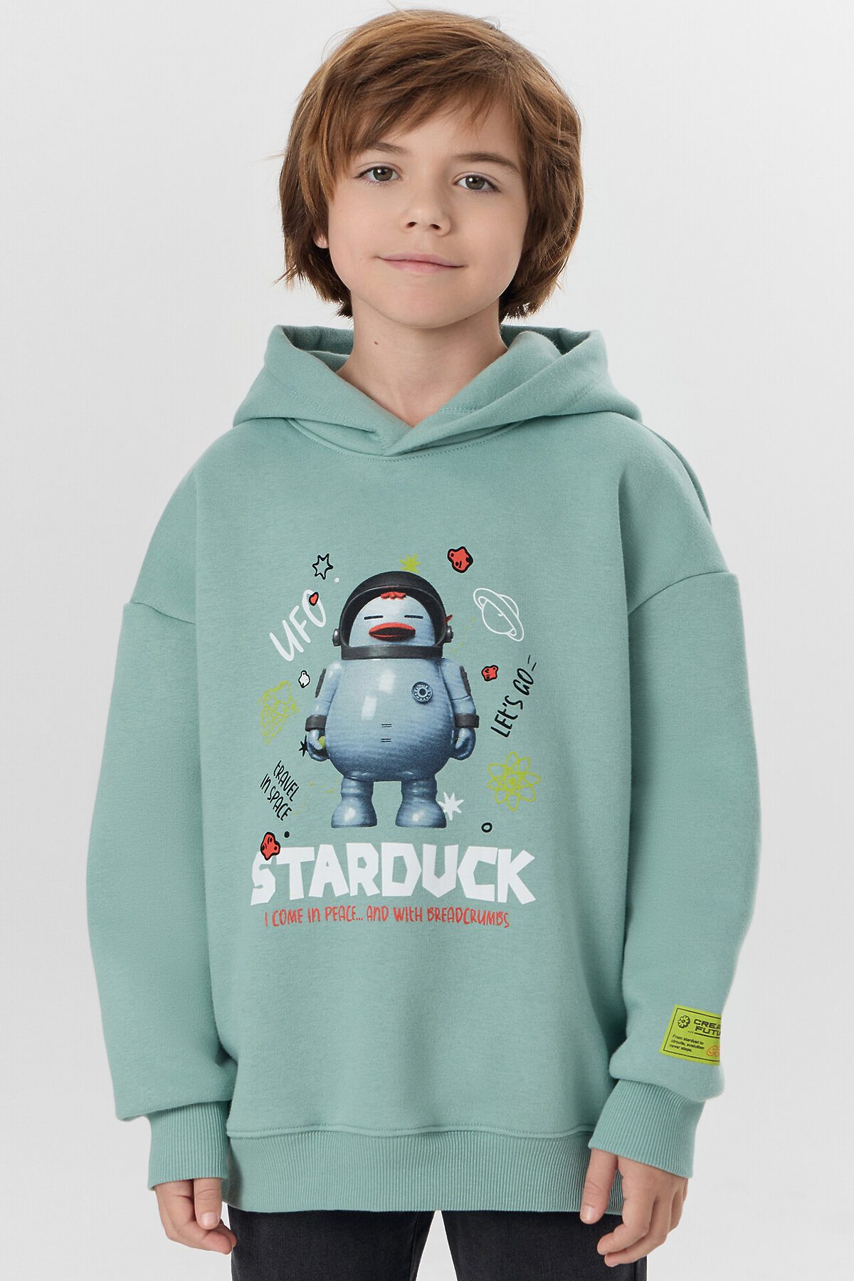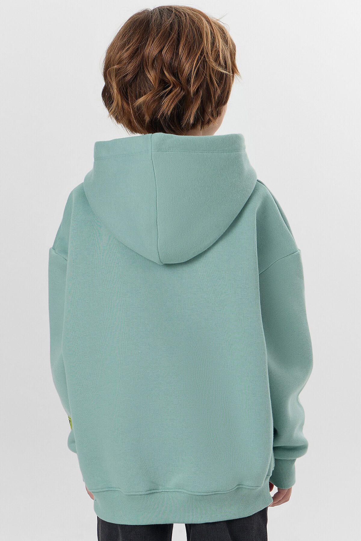 Худи свободного силуэта для мальчиков. Изготовлено из легкого трикотажного футера без подчеса. Есть удобный капюшон, который состоит из двух частей, а спереди идет внахлест. Рукава длинные, на манжетах из рибаны – как и пояс по нижнему срезу. Линия плеча слегка спущена, а плечевые швы перенесены вперед, что гарантирует свободу движений. Изюминкой модели является вместительный карман-кенгуру. Рекомендуем!