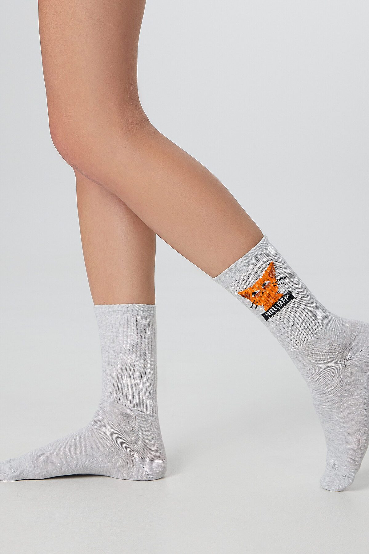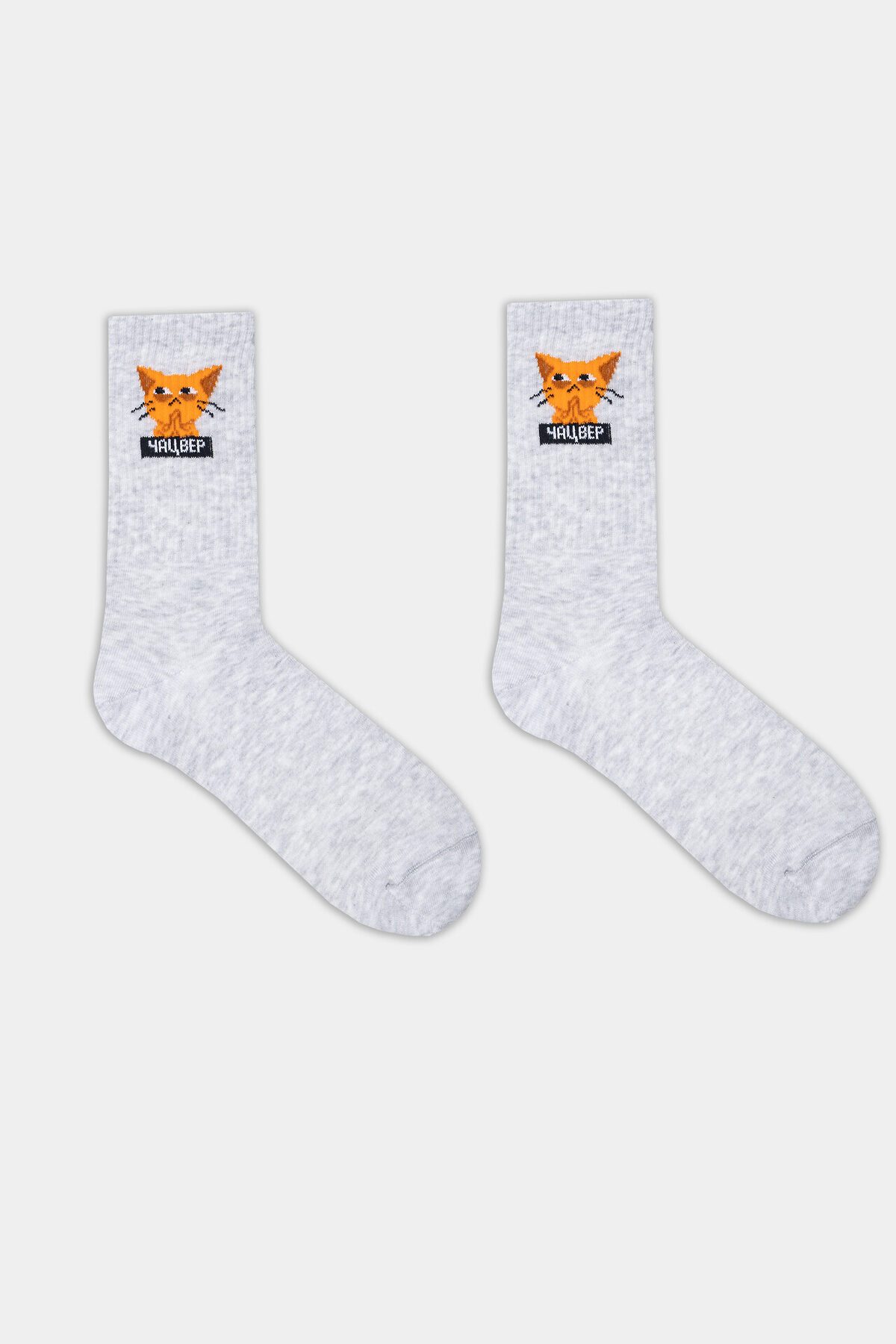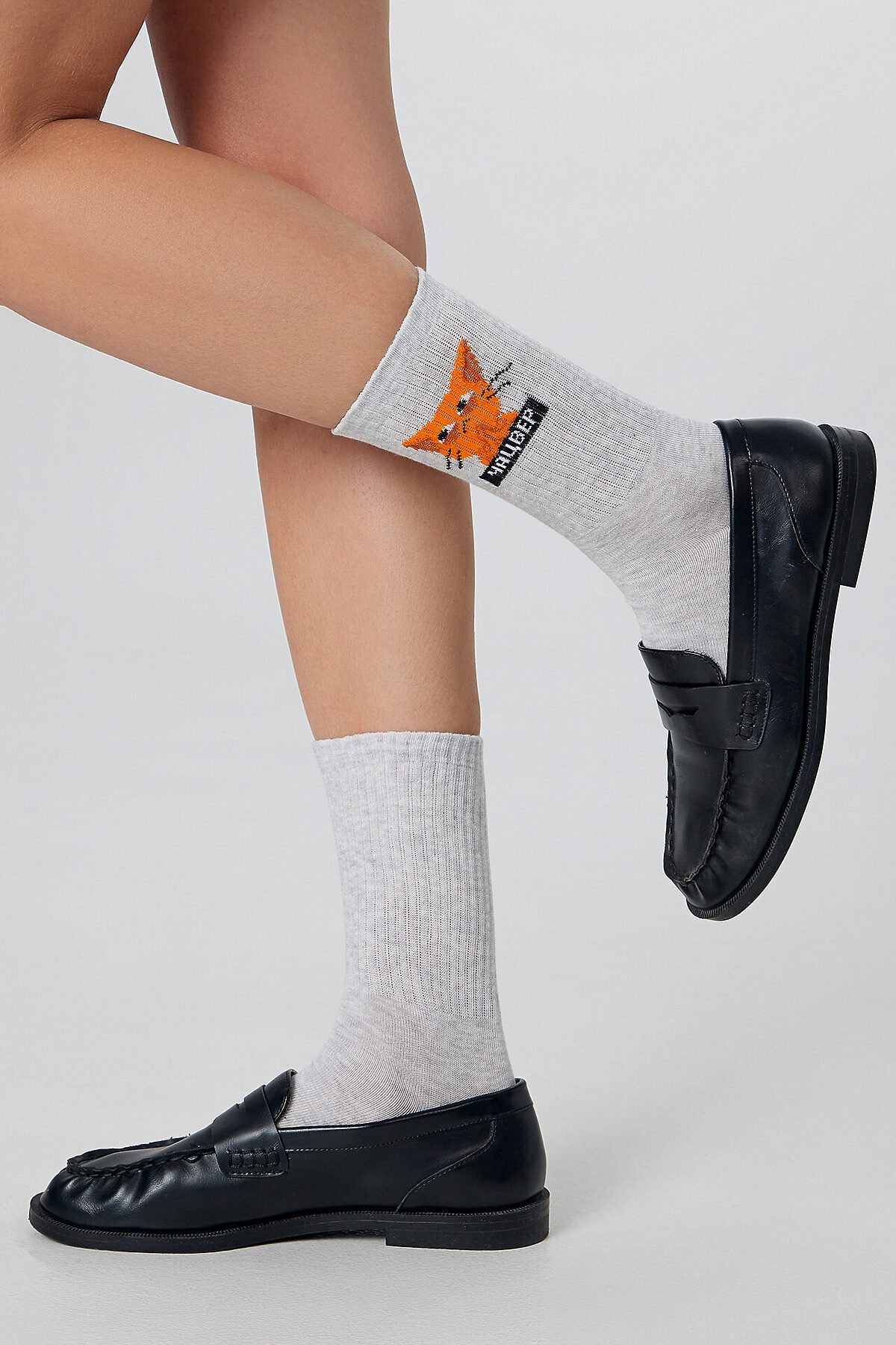 рис.2667 Женский носок с высоким плотным бортом и рисунком в виде котика с надписью.