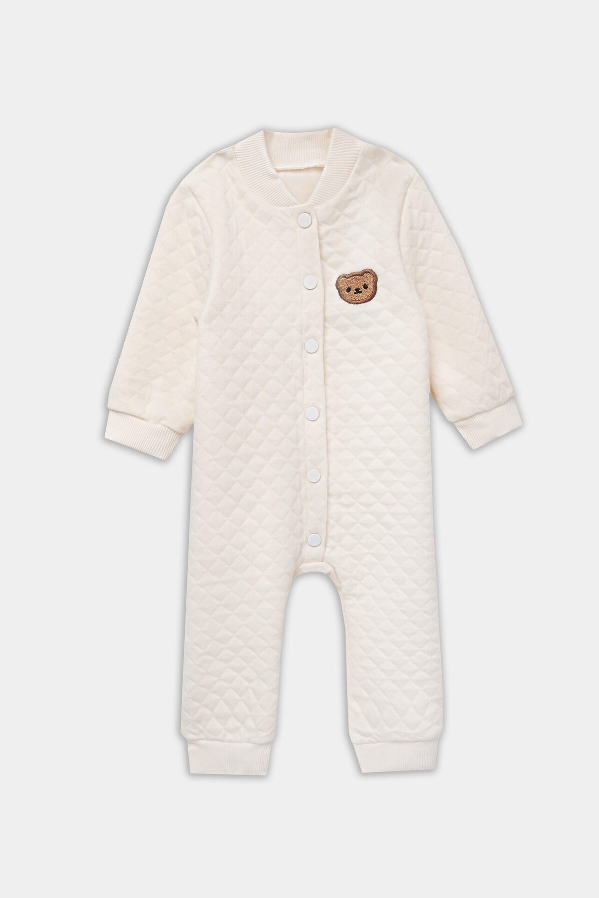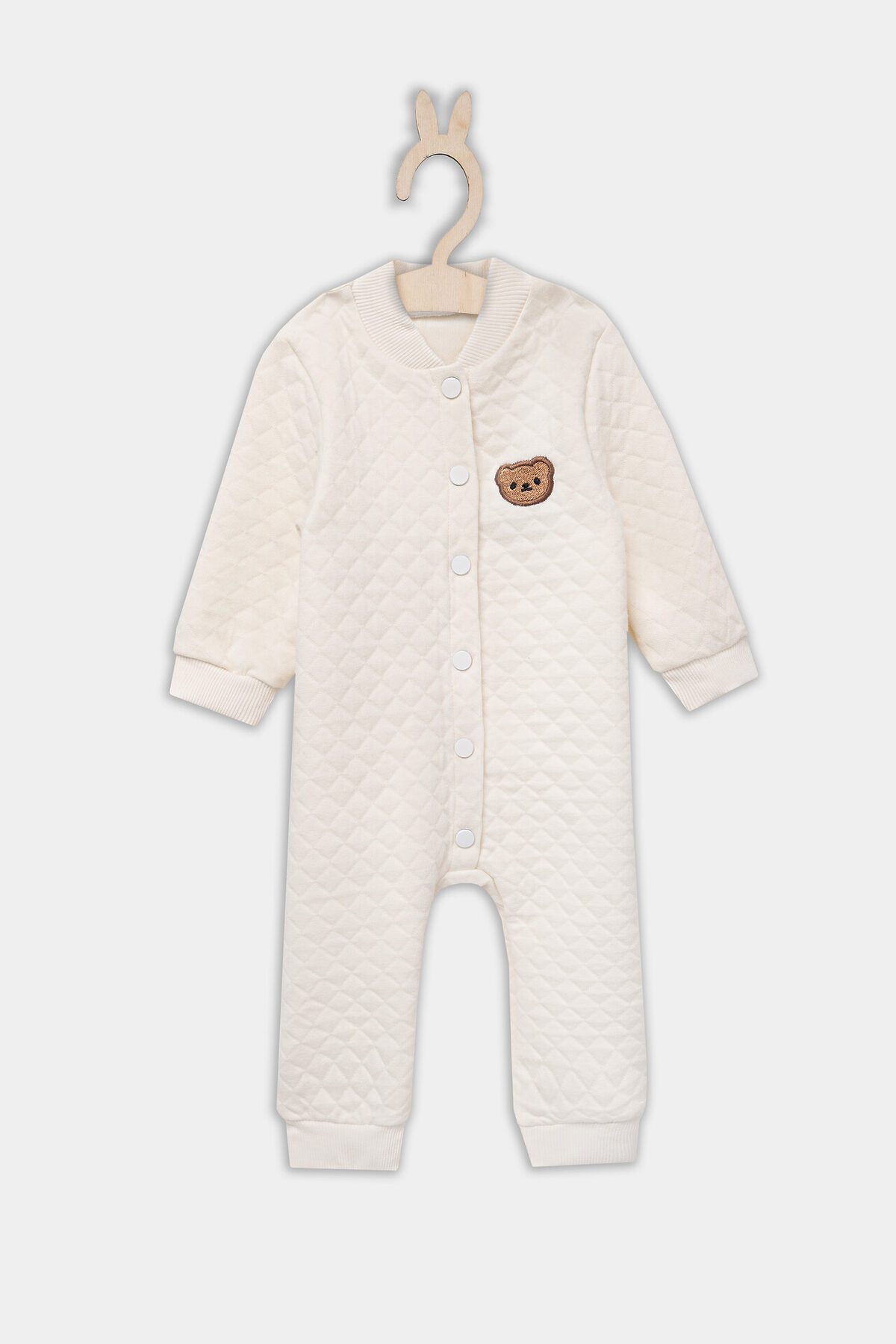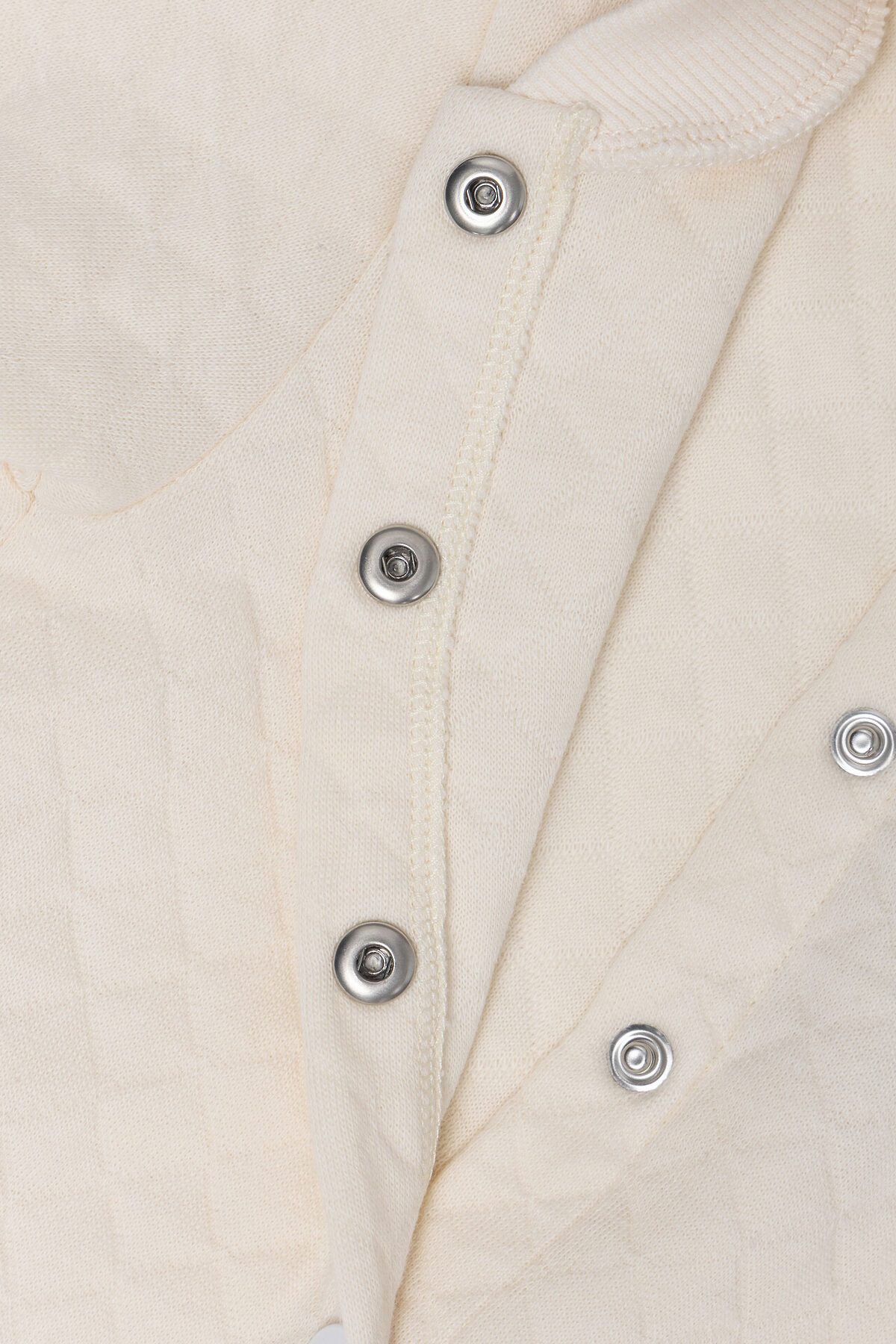 Комбинезон детский выполнен из капитона. Спинка цельнокроенная. Перед с застежкой от горловины до низа комбинезона. Застежка на кнопках - 6 шт (Кнопка ASB20L+486 пружин контакт, прорезин SOFT Touch-12,5 мм). Рукава втачные, длинные, одношовные. Горловина круглая, окантована бейкой из трикотажной рибаны 2*2 R-6, R22-062.01.360, 96% хлопок; 4% эластан, 360 гр/м?, 135 см. По низу рукавов и ножек притачные манжеты из трикотажной рибаны 2*2 R-6, R22-062.01.360, 96% хлопок; 4% эластан, 360 гр/м?, 135 см. По шаговому шву притачная ластовица.
