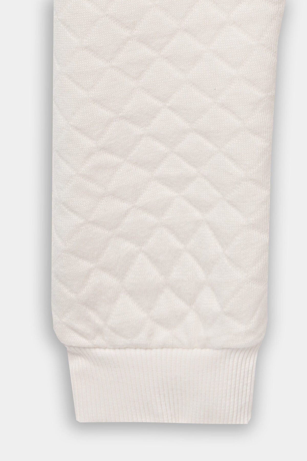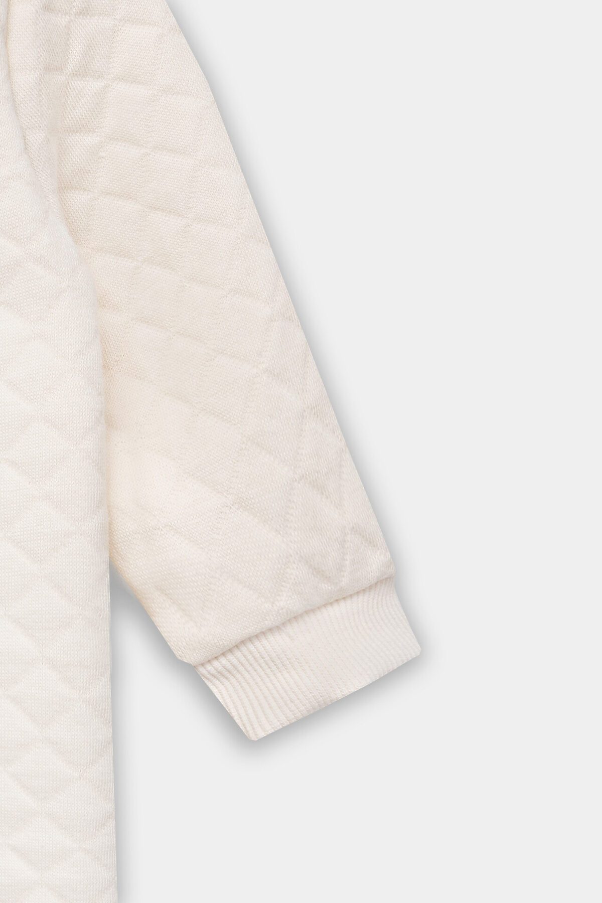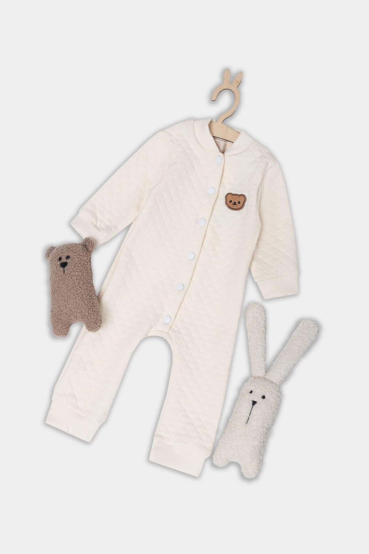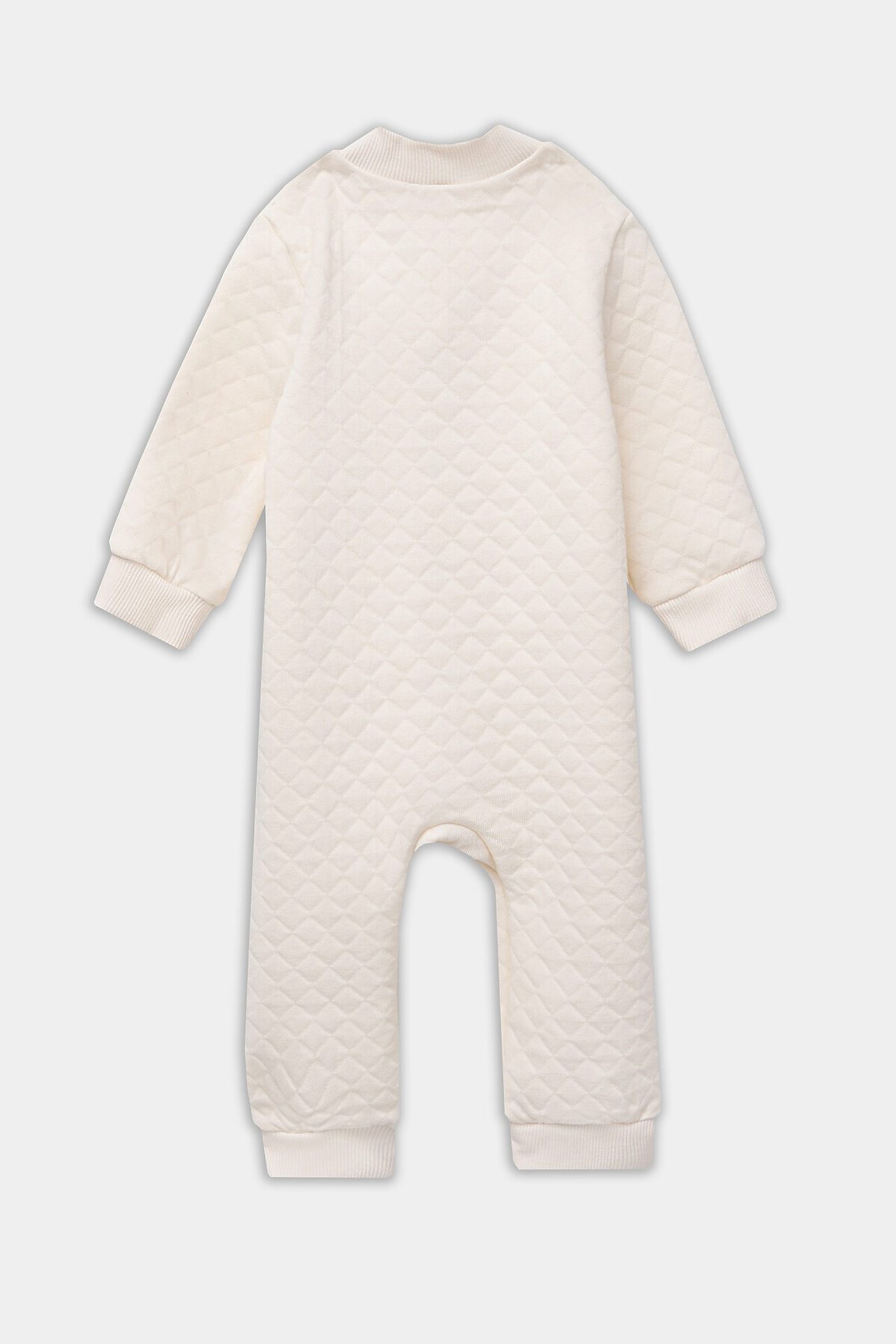 Комбинезон детский выполнен из капитона. Спинка цельнокроенная. Перед с застежкой от горловины до низа комбинезона. Застежка на кнопках - 6 шт (Кнопка ASB20L+486 пружин контакт, прорезин SOFT Touch-12,5 мм). Рукава втачные, длинные, одношовные. Горловина круглая, окантована бейкой из трикотажной рибаны 2*2 R-6, R22-062.01.360, 96% хлопок; 4% эластан, 360 гр/м?, 135 см. По низу рукавов и ножек притачные манжеты из трикотажной рибаны 2*2 R-6, R22-062.01.360, 96% хлопок; 4% эластан, 360 гр/м?, 135 см. По шаговому шву притачная ластовица.