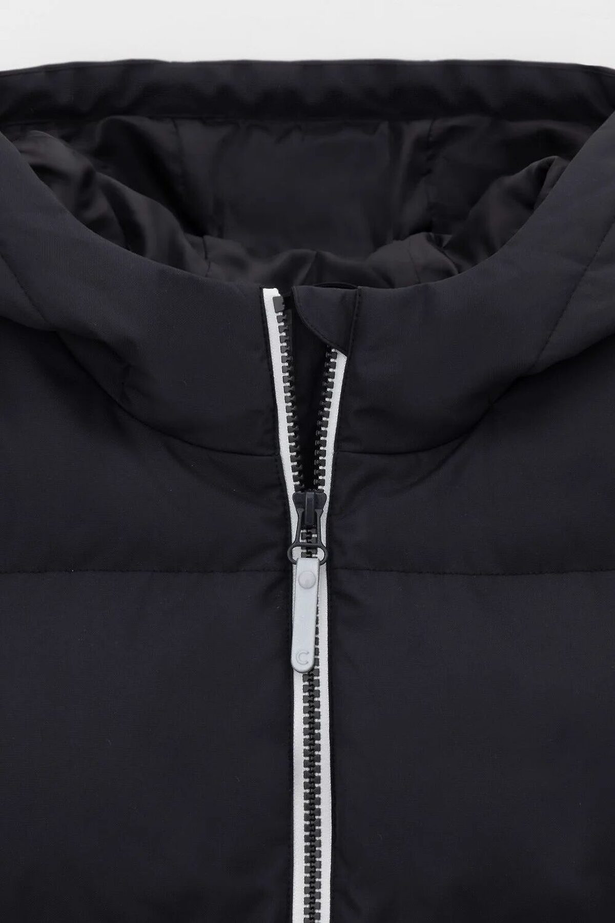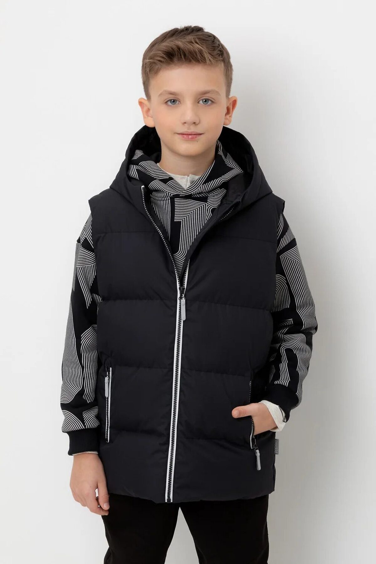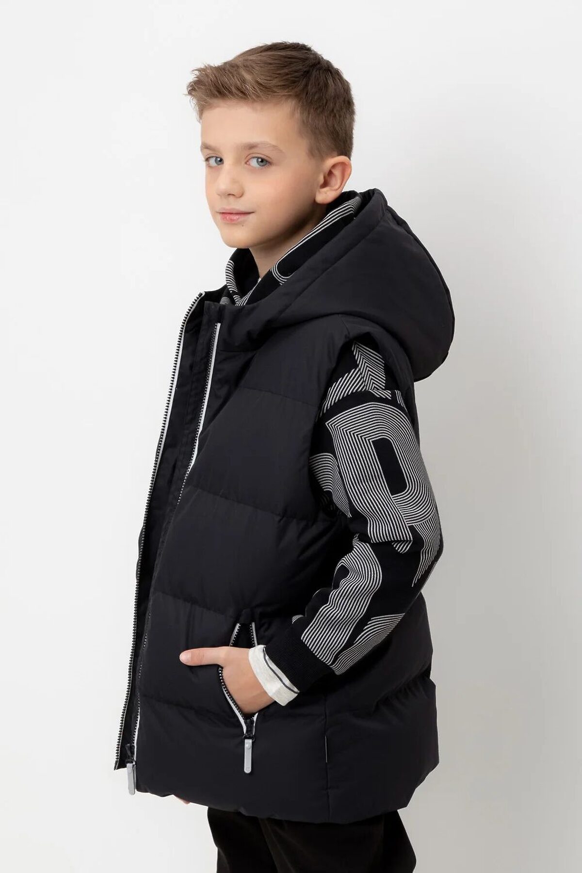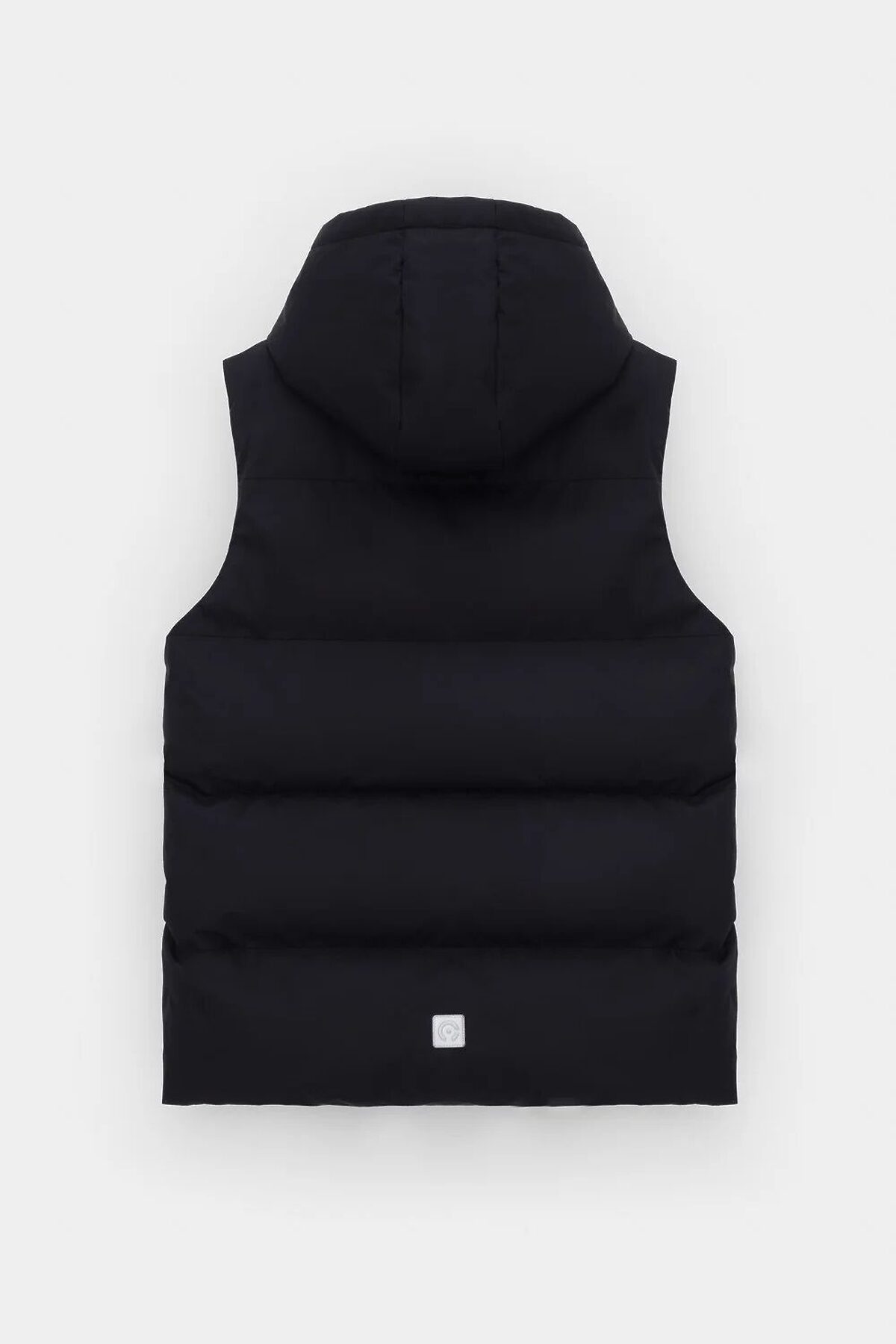 Стеганый жилет с капюшоном для мальчика с утеплителем Fellex®: 120 г/м2. Выполнен из мембранной ткани с дополнительной тефлоновой обработкой. Данный вид обработки предохраняет изделие от загрязнения и лучше отводит влагу. Подклад из 100% полиэстра. Капюшон не снимается. Изделие застёгивается на молнию, предусмотрена защита подбородка. Два кармана по бокам застёгиваются на молнии. Во всех изделиях верхнего ассортимента для безопасности ребенка предусмотрены светоотражающие элементы.