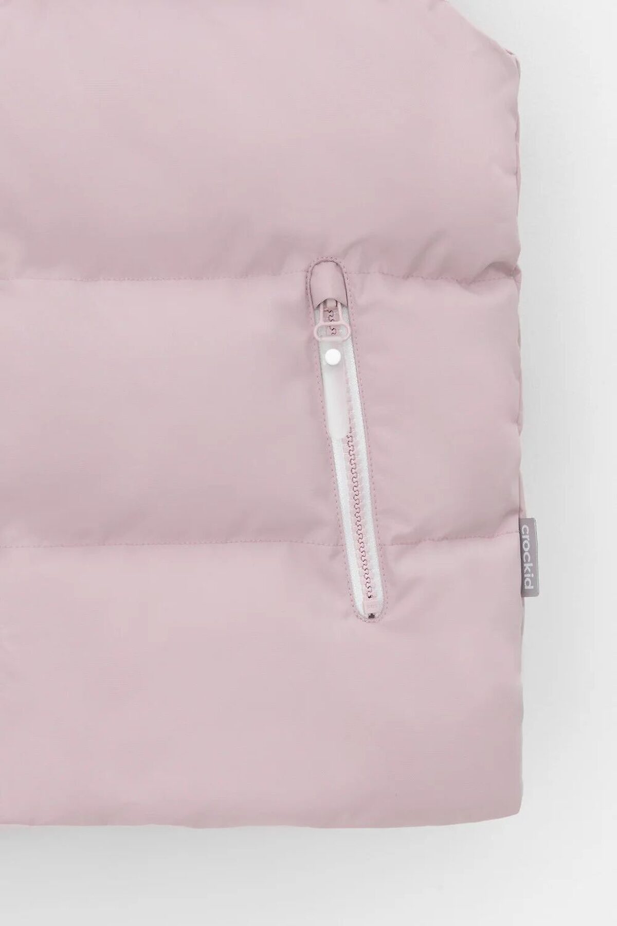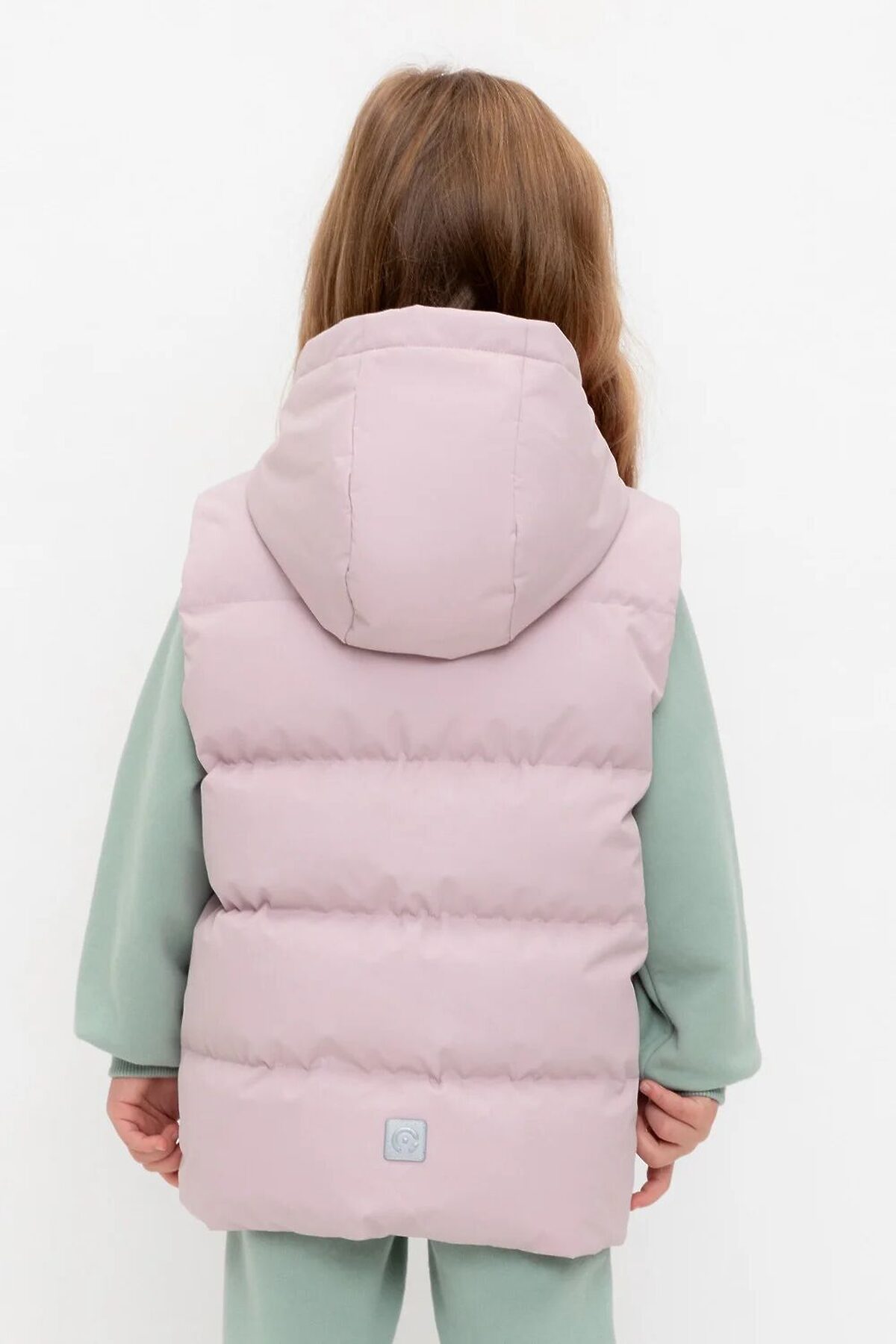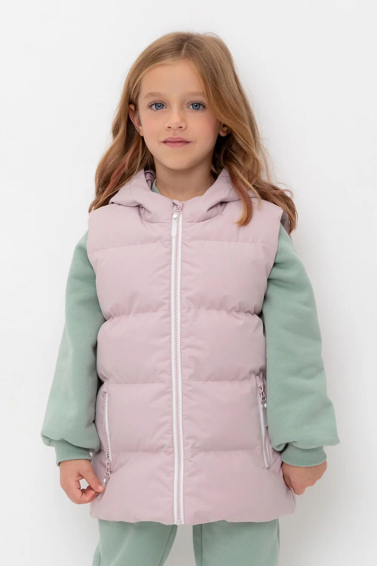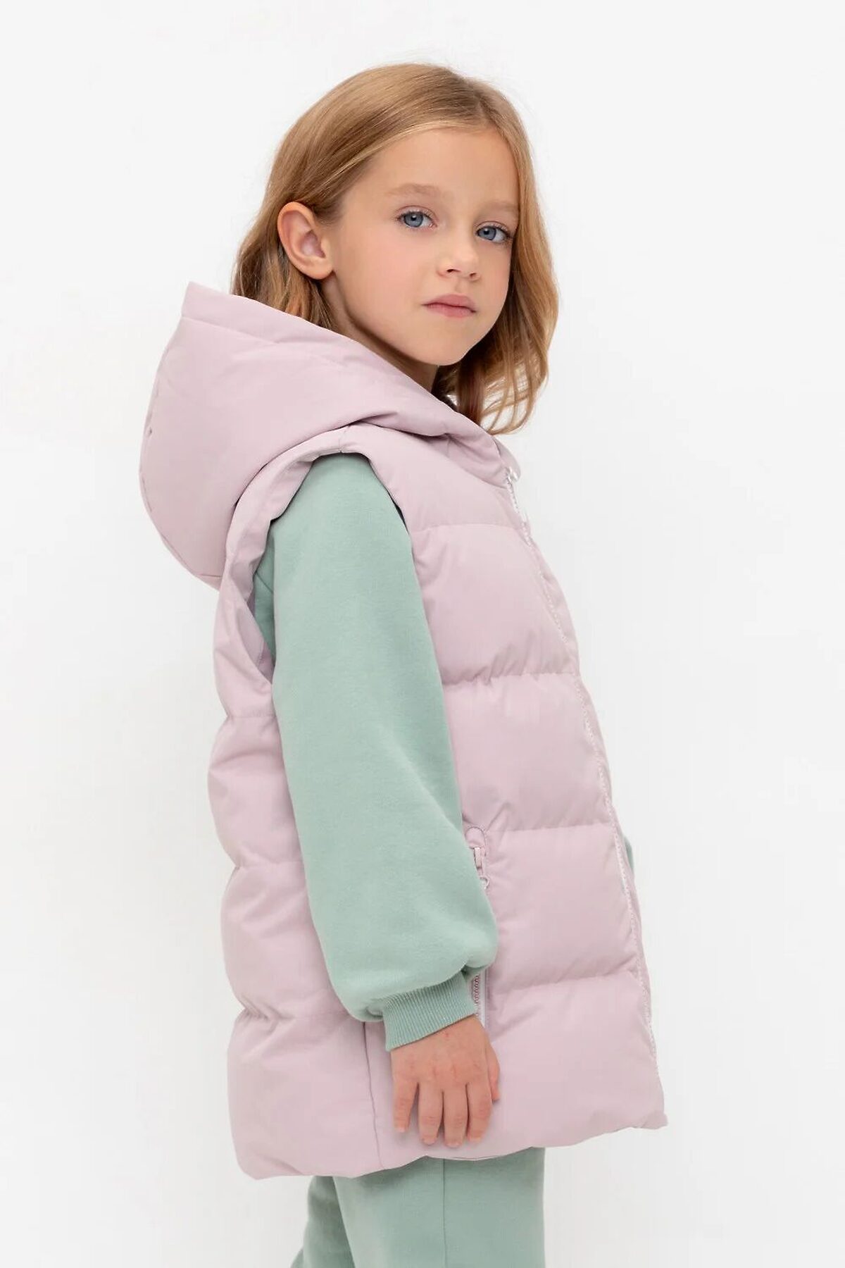 Стеганый жилет с капюшоном для девочки с утеплителем Fellex®: 120 г/м2. Выполнен из мембранной ткани с дополнительной тефлоновой обработкой. Данный вид обработки предохраняет изделие от загрязнения и лучше отводит влагу. Подклад из 100% полиэстра. Капюшон не снимается. Изделие застёгивается на молнию, предусмотрена защита подбородка. Два кармана по бокам застёгиваются на молнии. Во всех изделиях верхнего ассортимента для безопасности ребенка предусмотрены светоотражающие элементы.