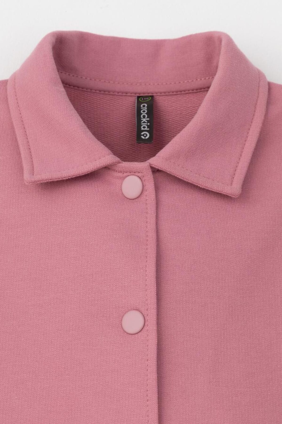 Свободная трикотажная рубашка для девочки из мягкого петельчатого футера. Застёгивается на кнопки. Модель с закругленным низом и спущенным плечом.