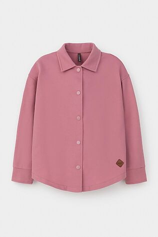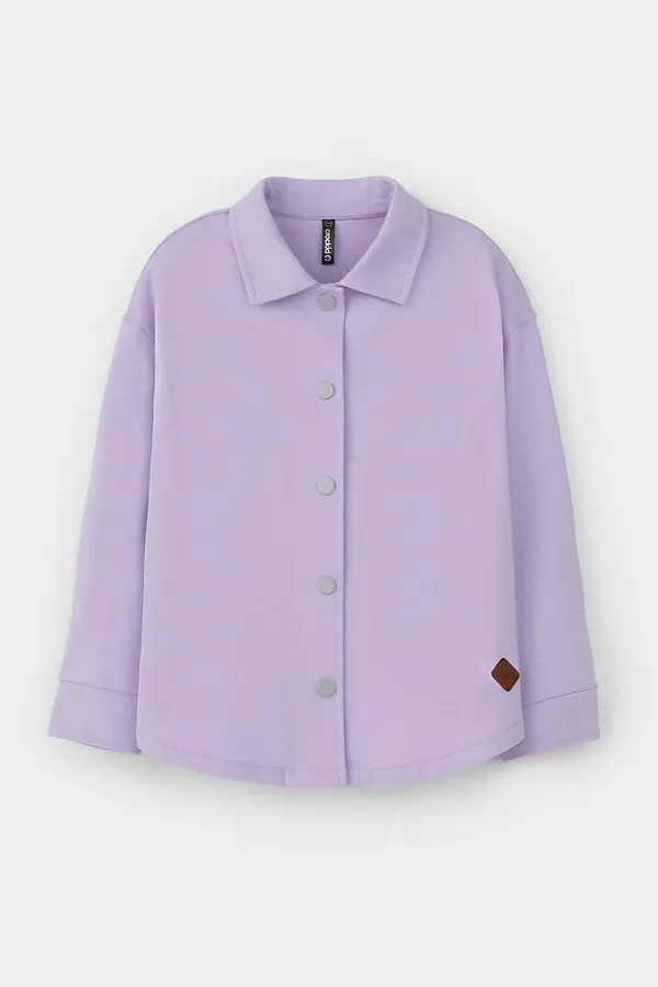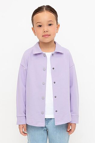 Свободная трикотажная рубашка для девочки из мягкого петельчатого футера. Застёгивается на кнопки. Модель с закругленным низом и спущенным плечом.
