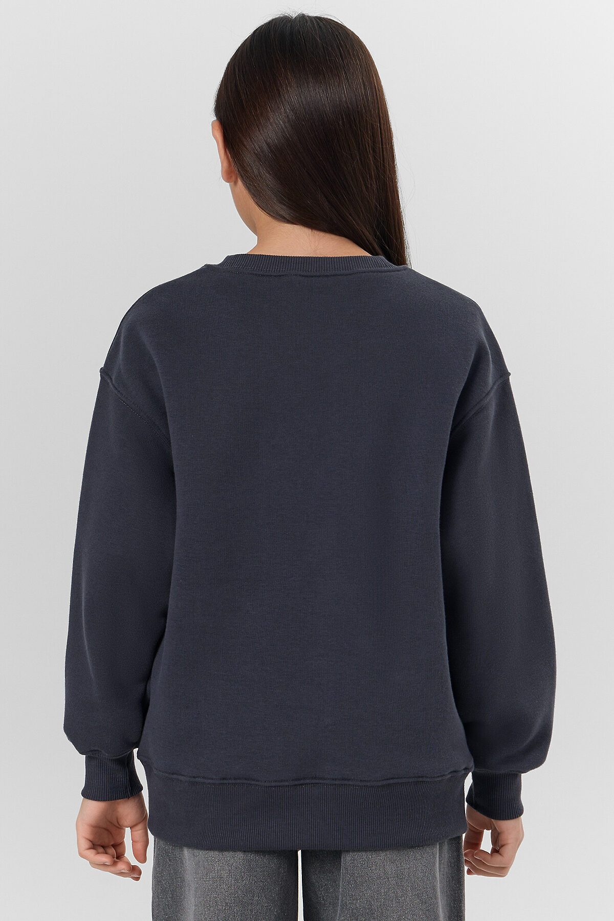 Джемпер свободного силуэта. Рукава длинные, втачные. Линия плеча спущена. Перед и спинка цельнокроенные. Горловина круглой формы обработана обтачкой из рибаны. Шов притачивания обтачки распошит. По низу рукавов и джемпера притачены манжеты и пояс из рибаны.