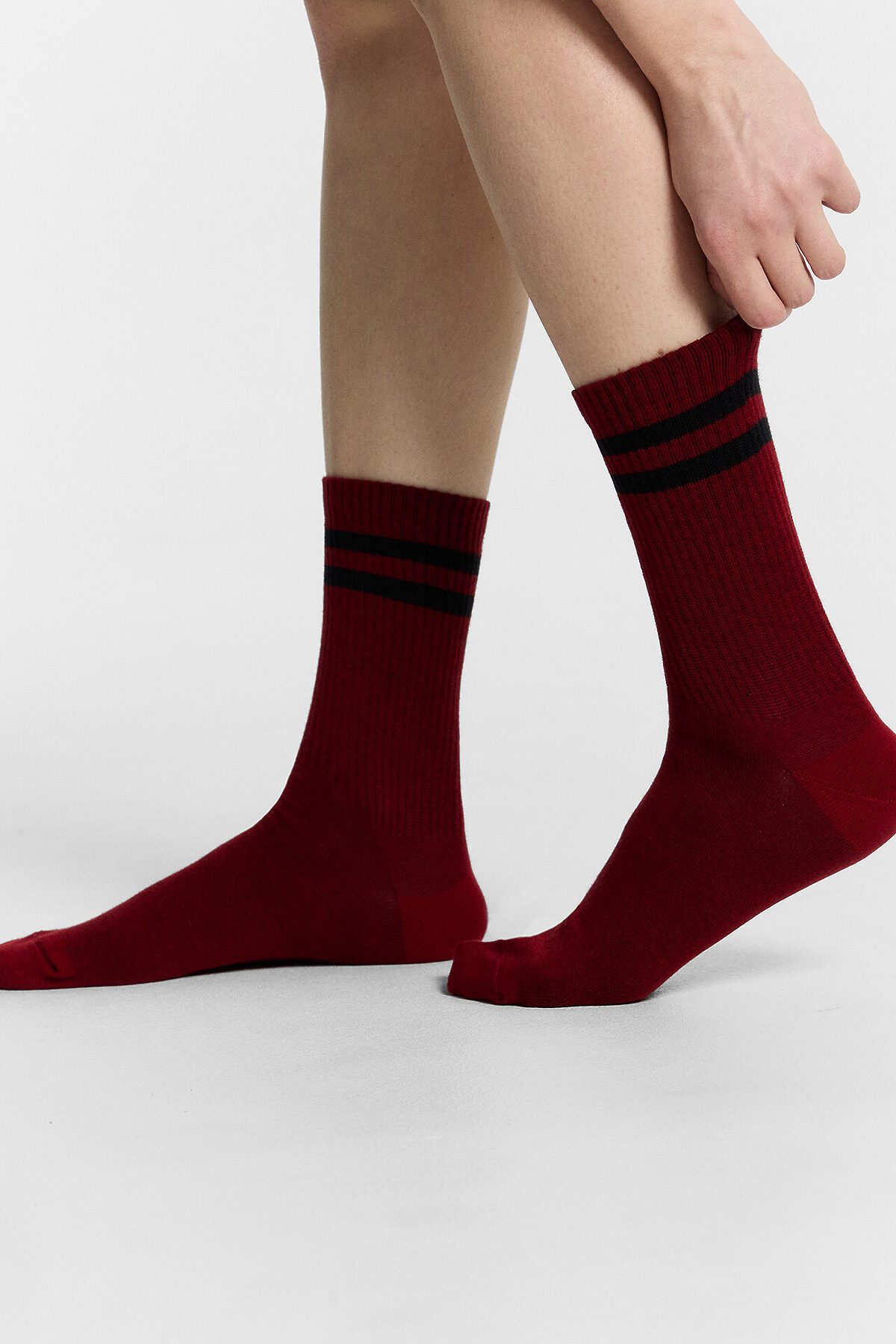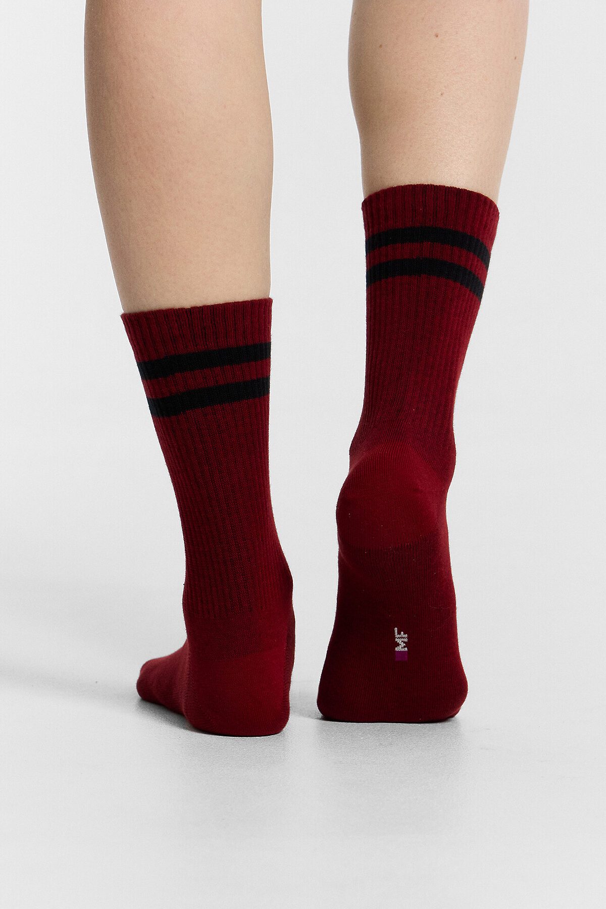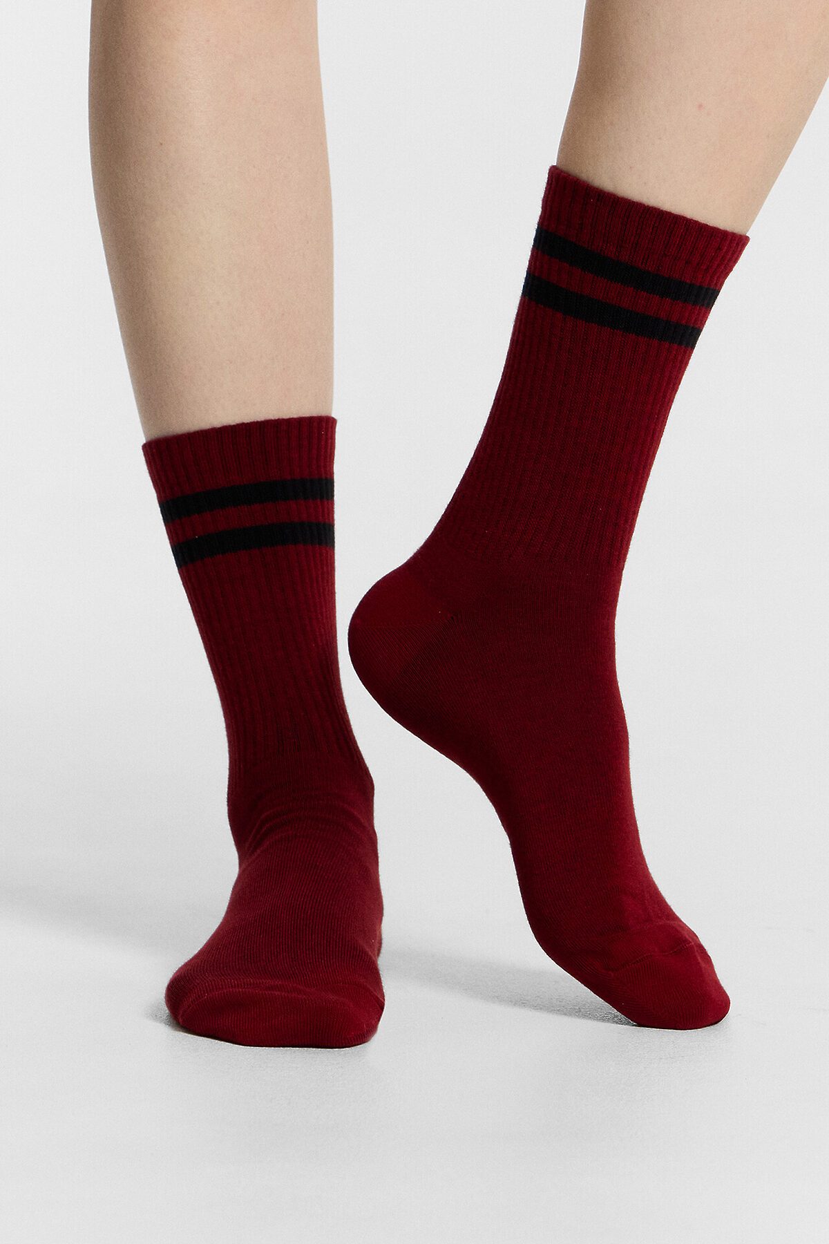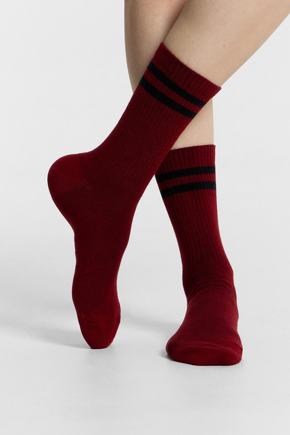 Высокие классические носки женские с плотной высокой резинкой и яркими контрастными полосками. Носки женские выполнены из высококачественного гребенного хлопка — тонкого, прочного и эластичного. Натуральные волокна отлично пропускают воздух и впитывают влагу, обеспечивают ощущение комфорта в течение дня. Благодаря небольшому количеству эластана в составе, носочки хорошо облегают и сохраняют форму, практичны и долговечны. Пятка и мысок дополнительно усилены для защиты от протирания при активном движении. Резинка мягко, но надежно удерживает носки, не передавливая ногу и не оставляя на коже следов. Отличный вариант на каждый день!
