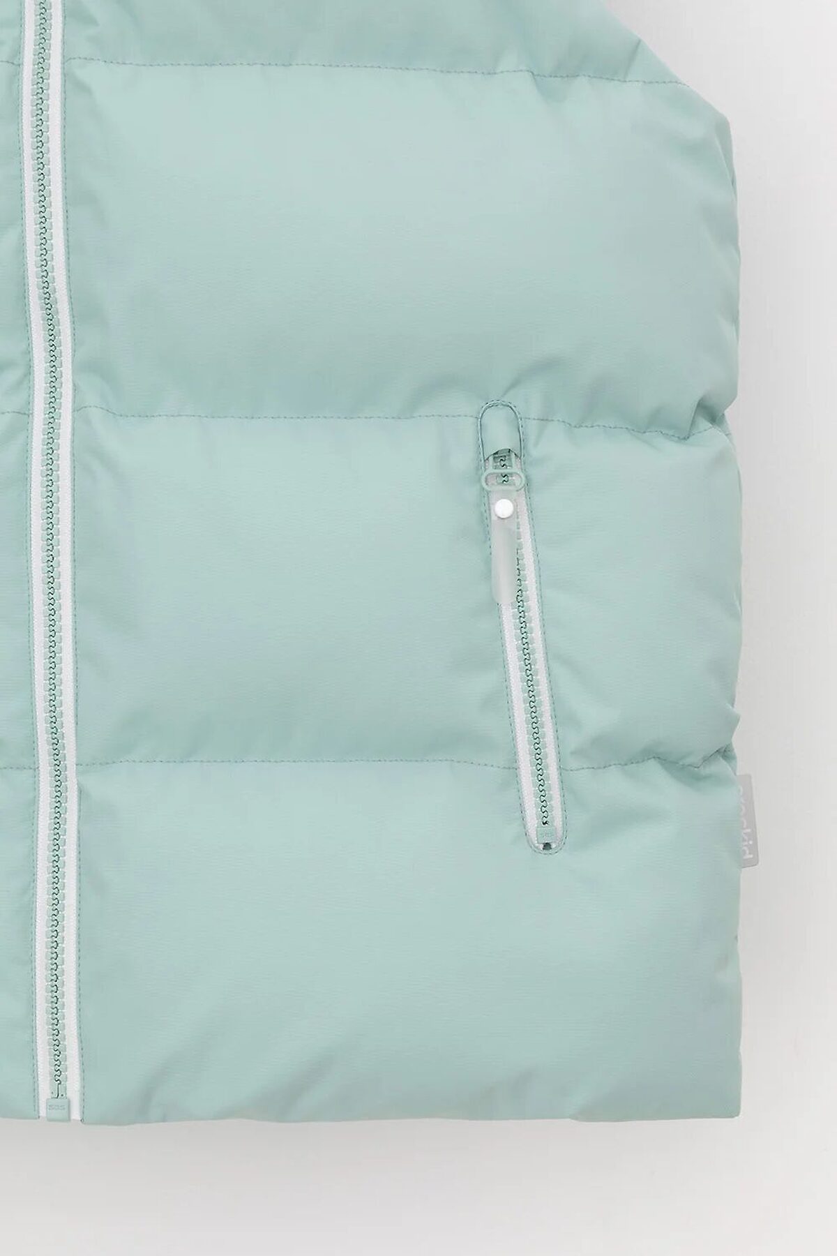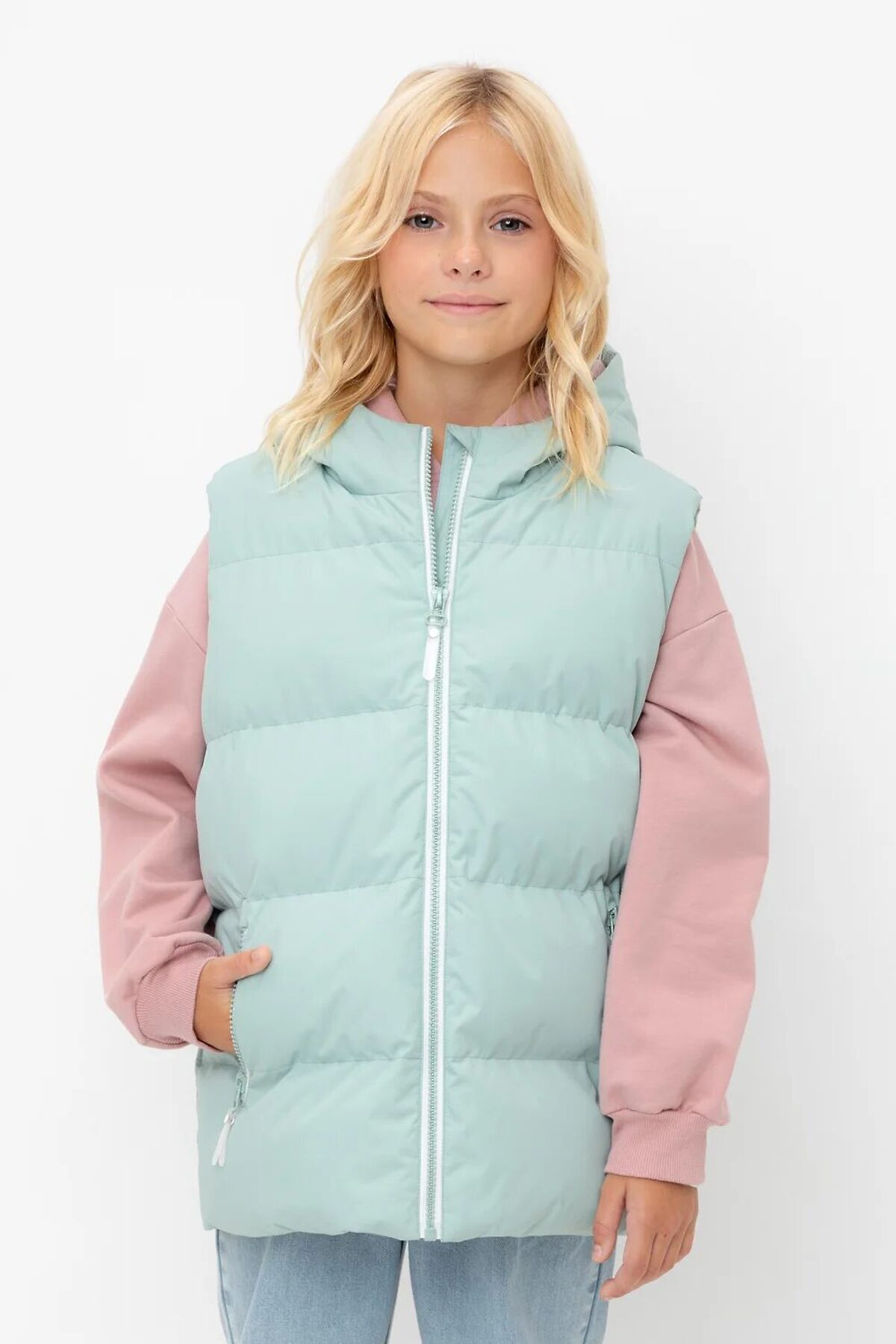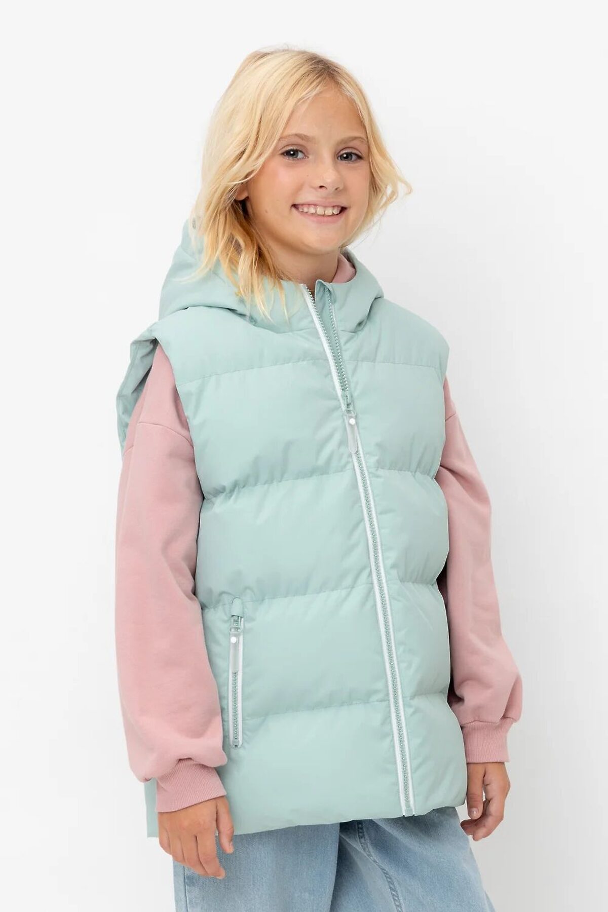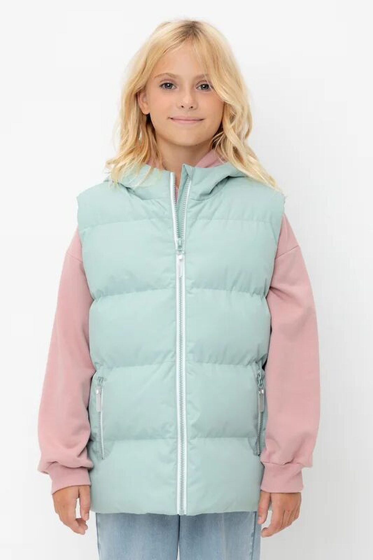 Стеганый жилет с капюшоном для девочки с утеплителем Fellex®: 120 г/м2. Выполнен из мембранной ткани с дополнительной тефлоновой обработкой. Данный вид обработки предохраняет изделие от загрязнения и лучше отводит влагу. Подклад из 100% полиэстра. Капюшон не снимается. Изделие застёгивается на молнию, предусмотрена защита подбородка. Два кармана по бокам застёгиваются на молнии. Во всех изделиях верхнего ассортимента для безопасности ребенка предусмотрены светоотражающие элементы.