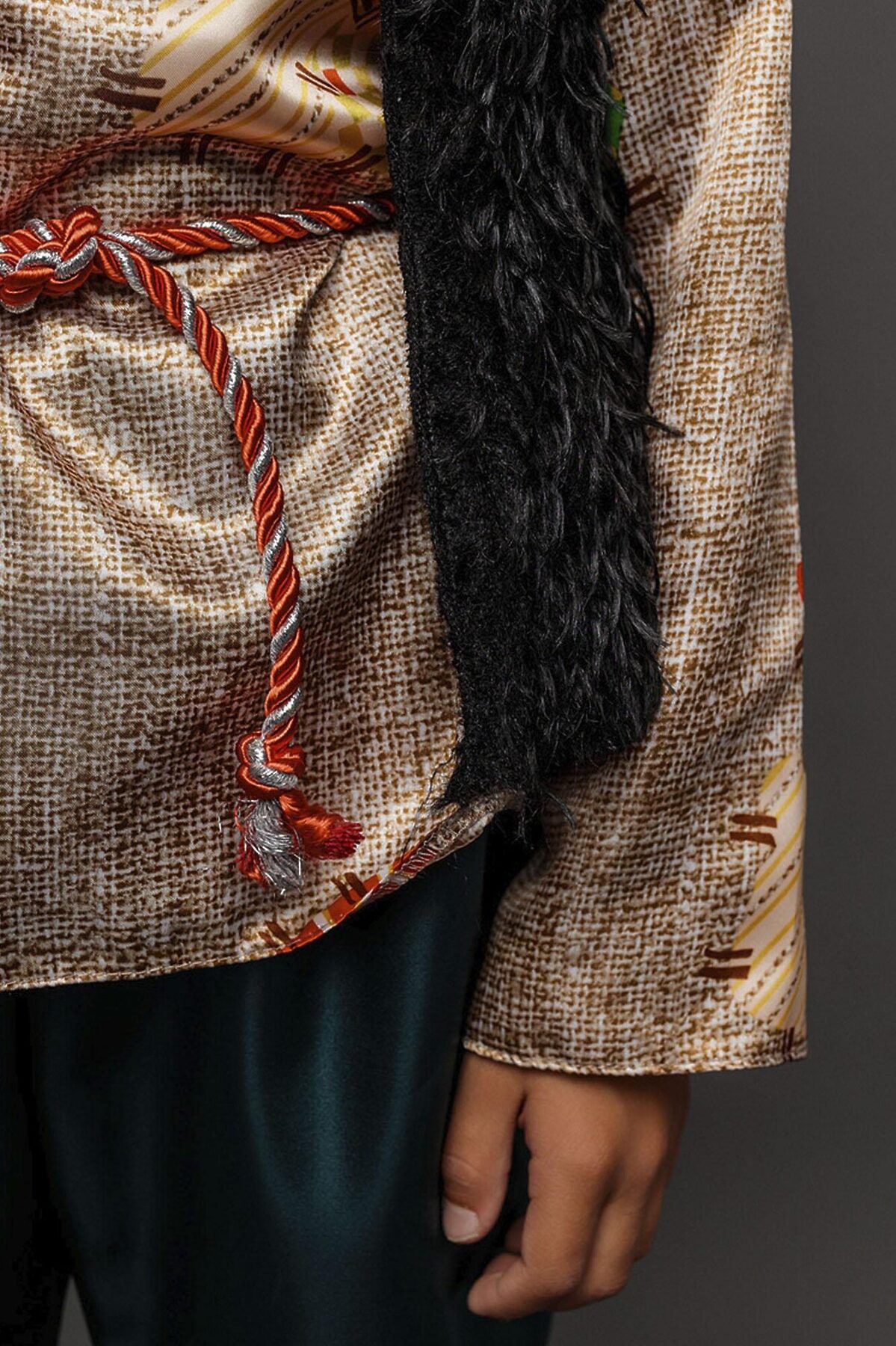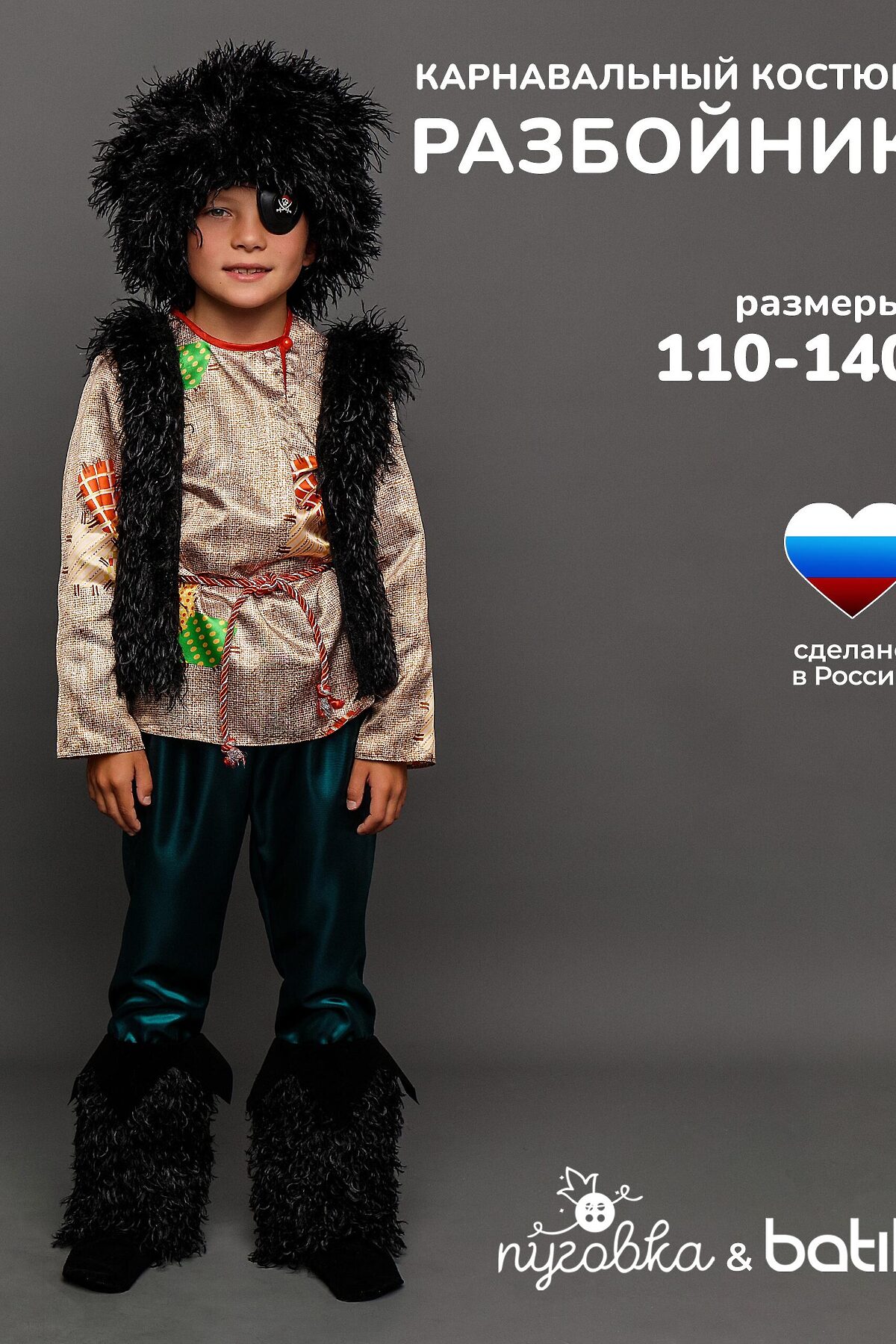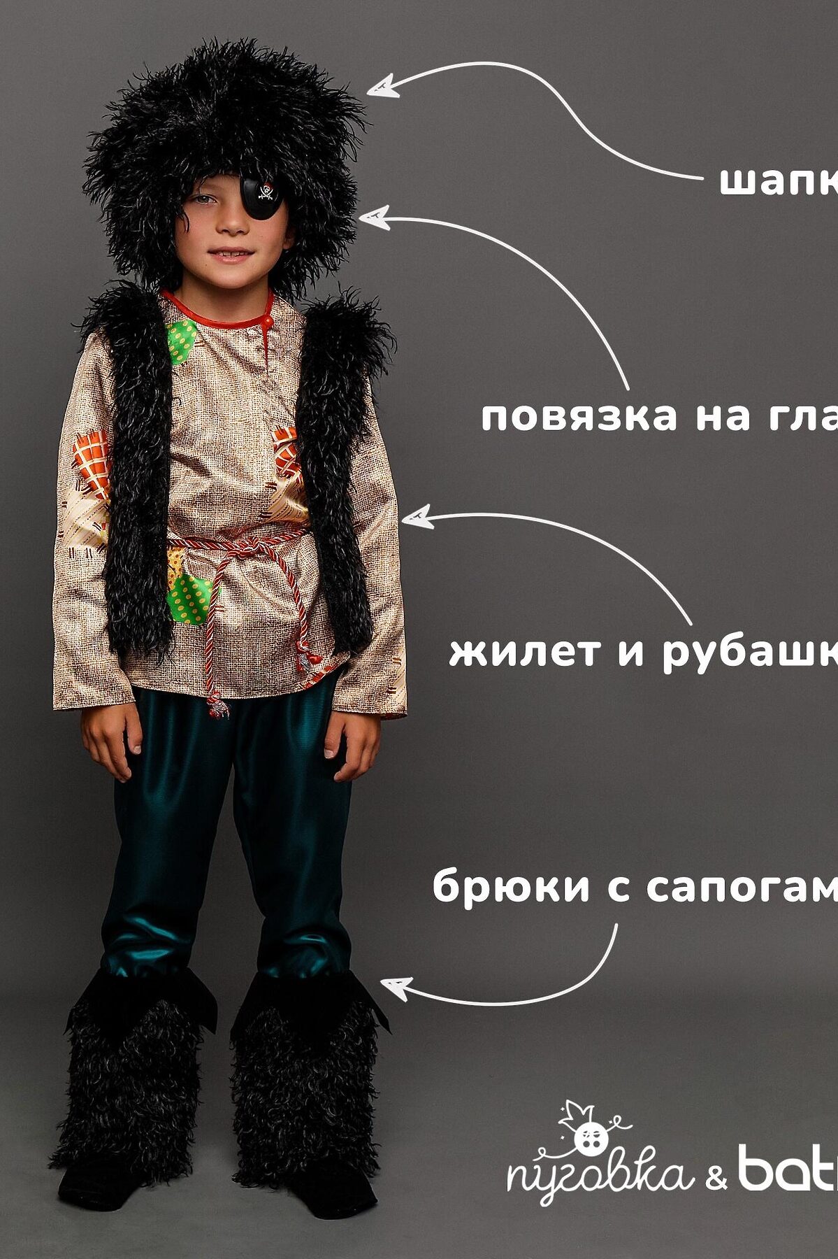 Карнавальный костюм Разбойник — отличный выбор для мальчиков, мечтающих о приключениях и ярких перевоплощениях! Подойдет для праздников, утренников и театральных постановок. В таком образе можно немного пошалить и почувствовать себя настоящим героем сказки. В комплект входит: рубаха, жилетка, брюки с сапогами, шапка и повязка на глаз.