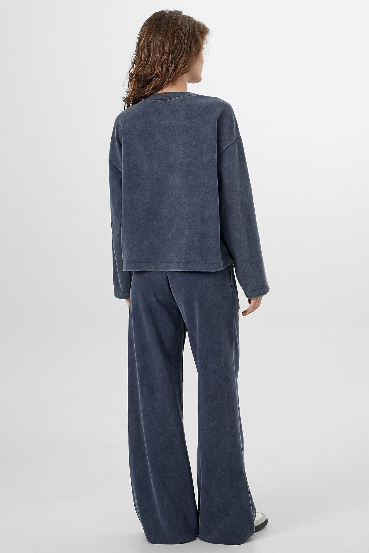 Комплект состоит из свитшота (122866) и брюк (182562). Свитшот прямой, свободный, укороченный. Горловина круглой формы обработана обтачками из основного полотна. Рукава втачные, длинные, широкие.Нижние срезы свитшота и рукавов обработаны швом вподгибку. Брюки женские выполнены из трикотажного полотна интерлок. Брюки прямые, свободные. Посадка средняя, сидение опущено. Пояс цельнокроеный с эластичной тесьмой внутри (внутр. 30мм 30RV). В боковых швах обработаны карманы. Подкладка кармана из основного полотна. Нижние срезы обработаны швом вподгибку.
