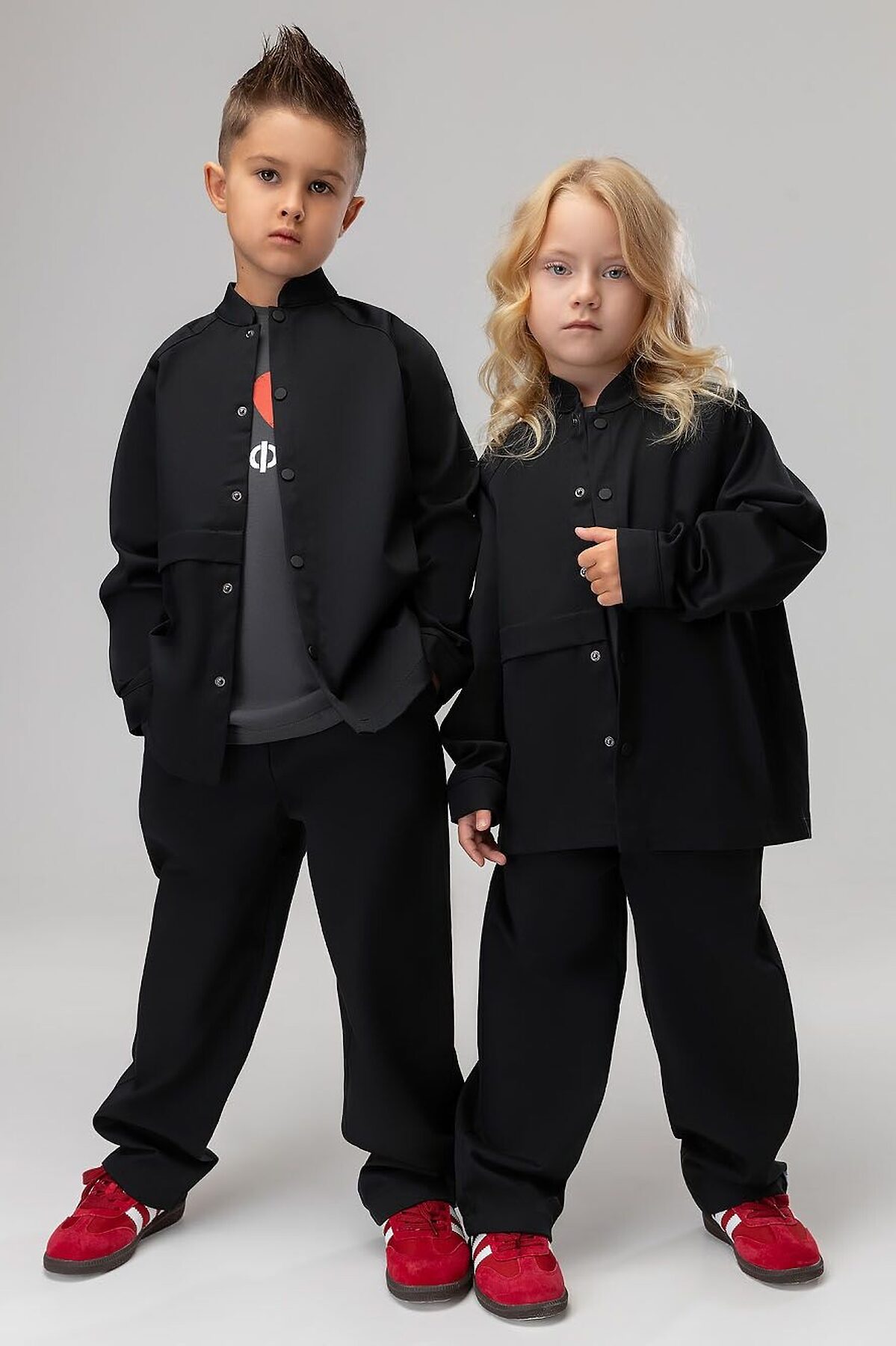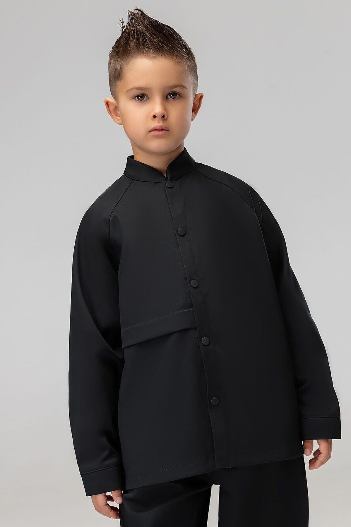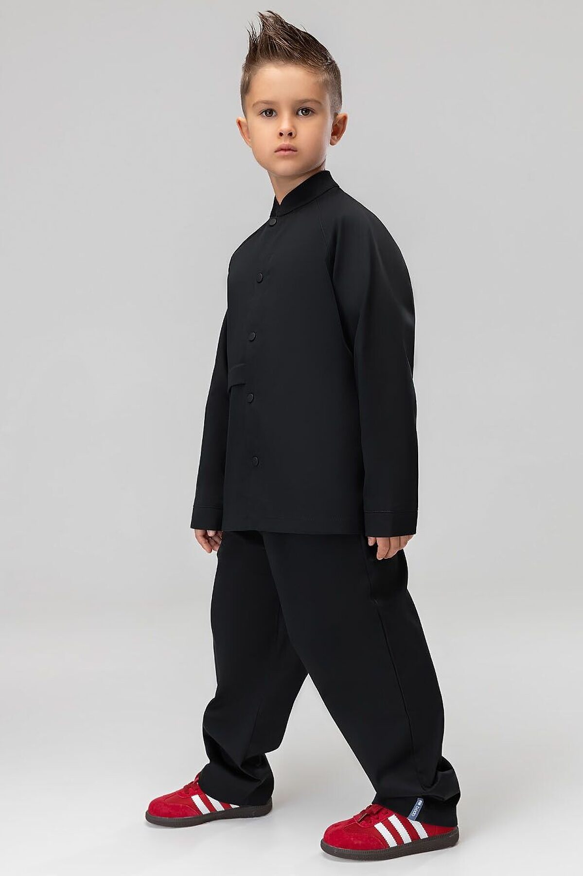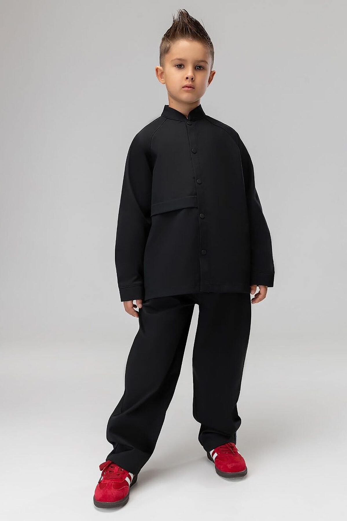 Рубашка свободного силуэта на кнопках, с воротником стойка, с рукавами с манжетой на кнопках. Низ изделия прямой. Одна полочка разрезная с клапаном. Свободные брюки, расширенные в бёдрах и заужены к низу, на поясе с внутренней резинкой, брюки с боковыми карманами. Костюм из смесовой ткани саржевого плетения плотностью 240 гр