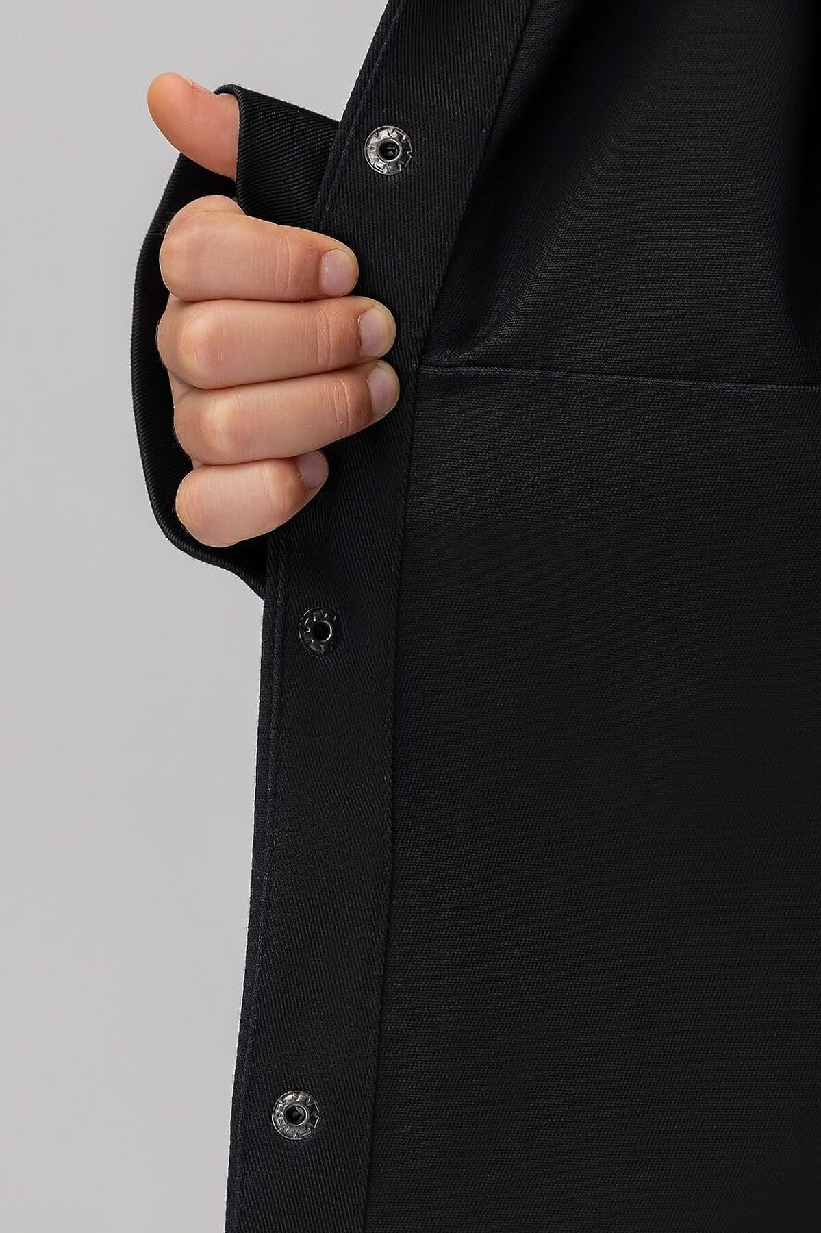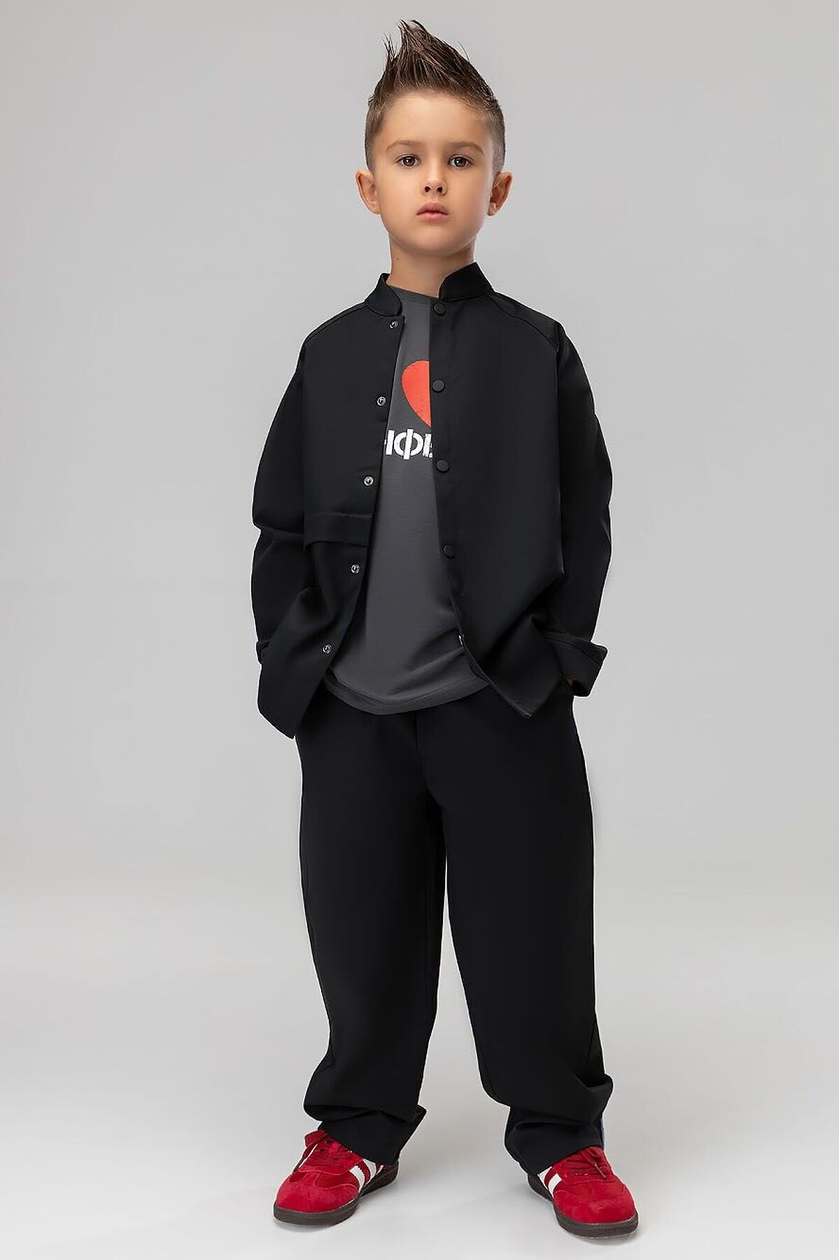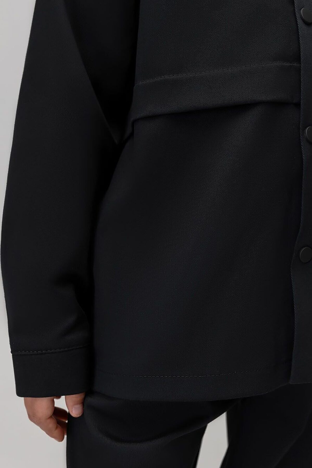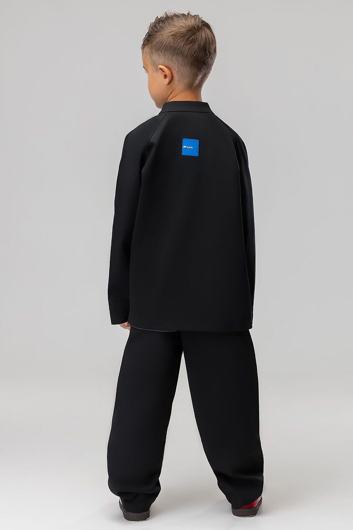 Рубашка свободного силуэта на кнопках, с воротником стойка, с рукавами с манжетой на кнопках. Низ изделия прямой. Одна полочка разрезная с клапаном. Свободные брюки, расширенные в бёдрах и заужены к низу, на поясе с внутренней резинкой, брюки с боковыми карманами. Костюм из смесовой ткани саржевого плетения плотностью 240 гр