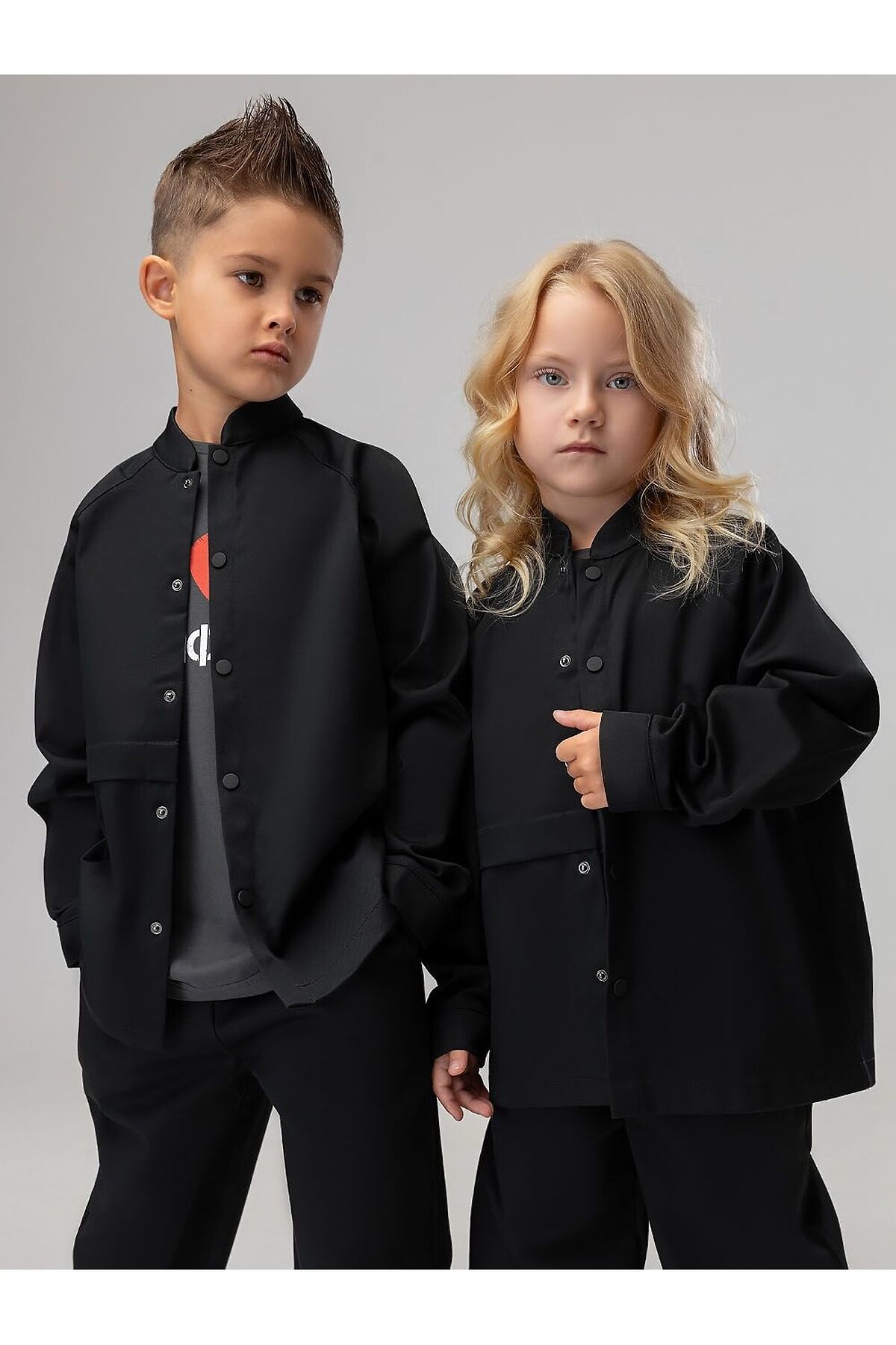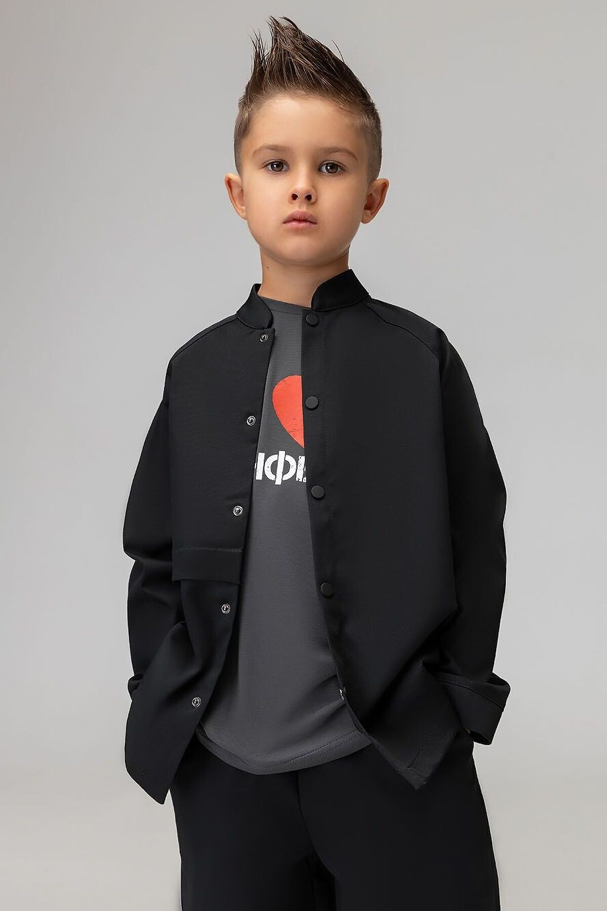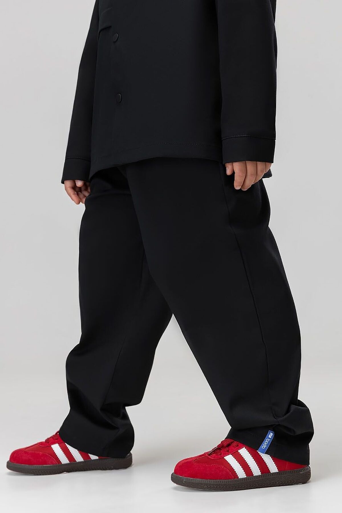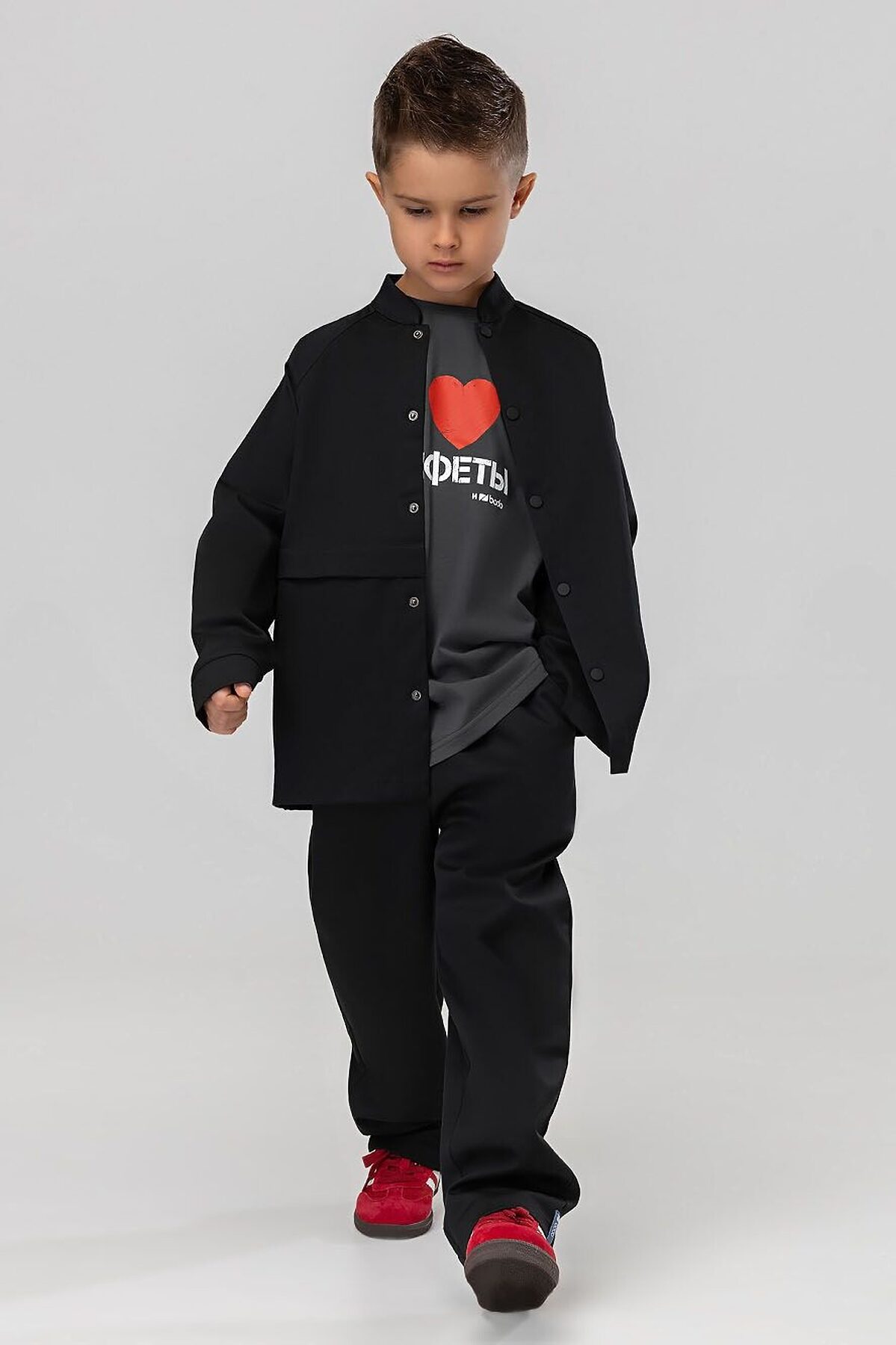 Рубашка свободного силуэта на кнопках, с воротником стойка, с рукавами с манжетой на кнопках. Низ изделия прямой. Одна полочка разрезная с клапаном. Свободные брюки, расширенные в бёдрах и заужены к низу, на поясе с внутренней резинкой, брюки с боковыми карманами. Костюм из смесовой ткани саржевого плетения плотностью 240 гр