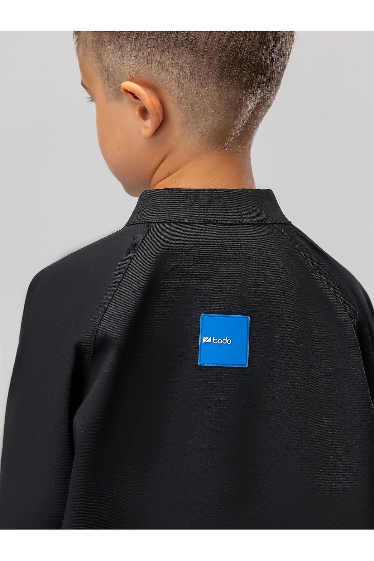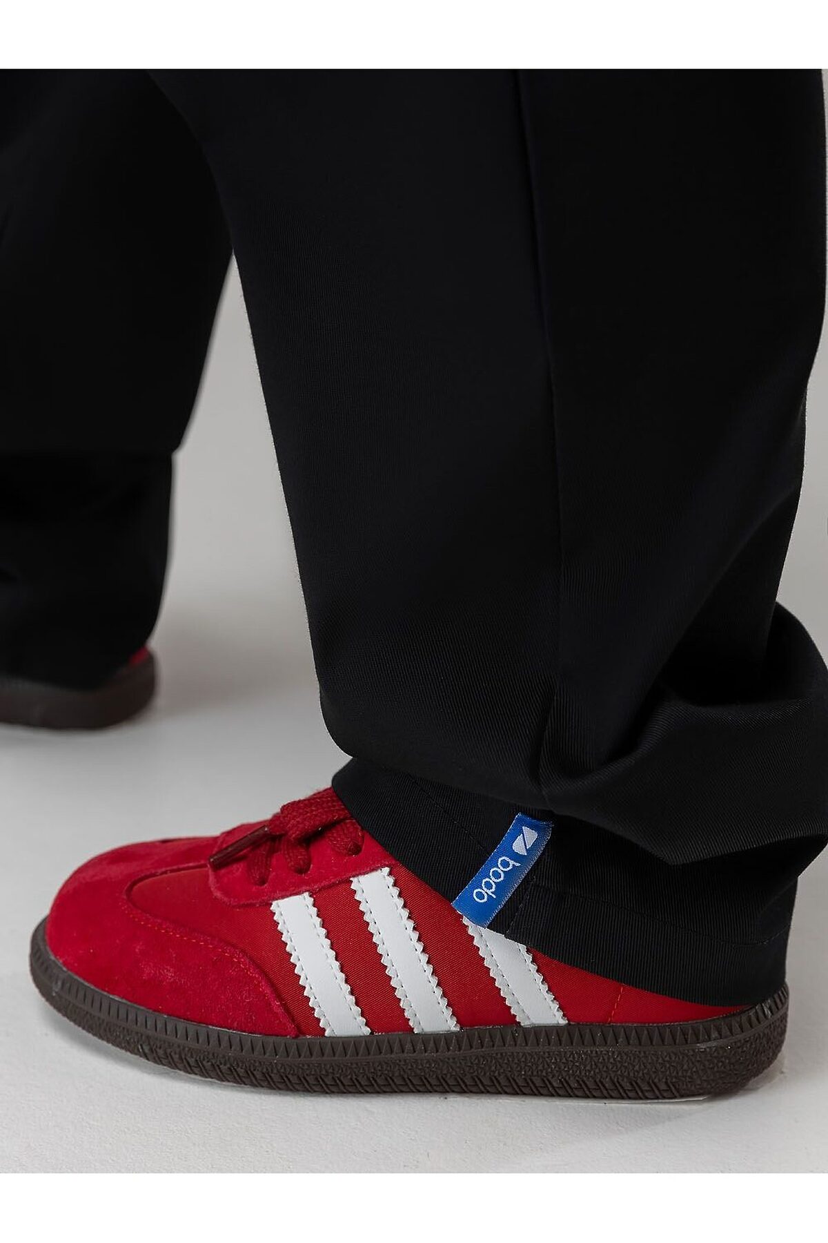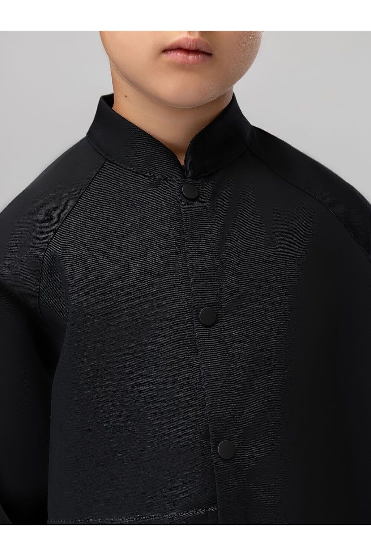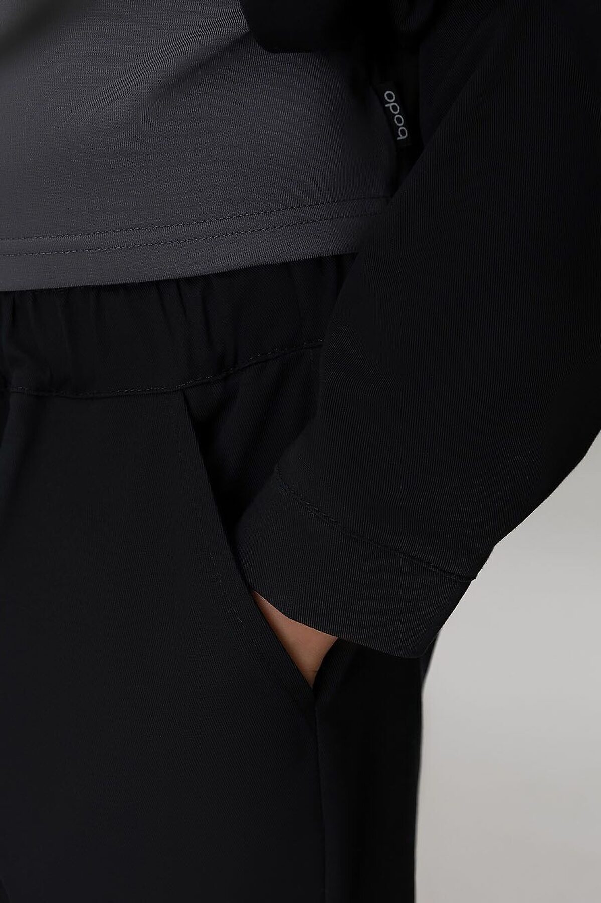 Рубашка свободного силуэта на кнопках, с воротником стойка, с рукавами с манжетой на кнопках. Низ изделия прямой. Одна полочка разрезная с клапаном. Свободные брюки, расширенные в бёдрах и заужены к низу, на поясе с внутренней резинкой, брюки с боковыми карманами. Костюм из смесовой ткани саржевого плетения плотностью 240 гр