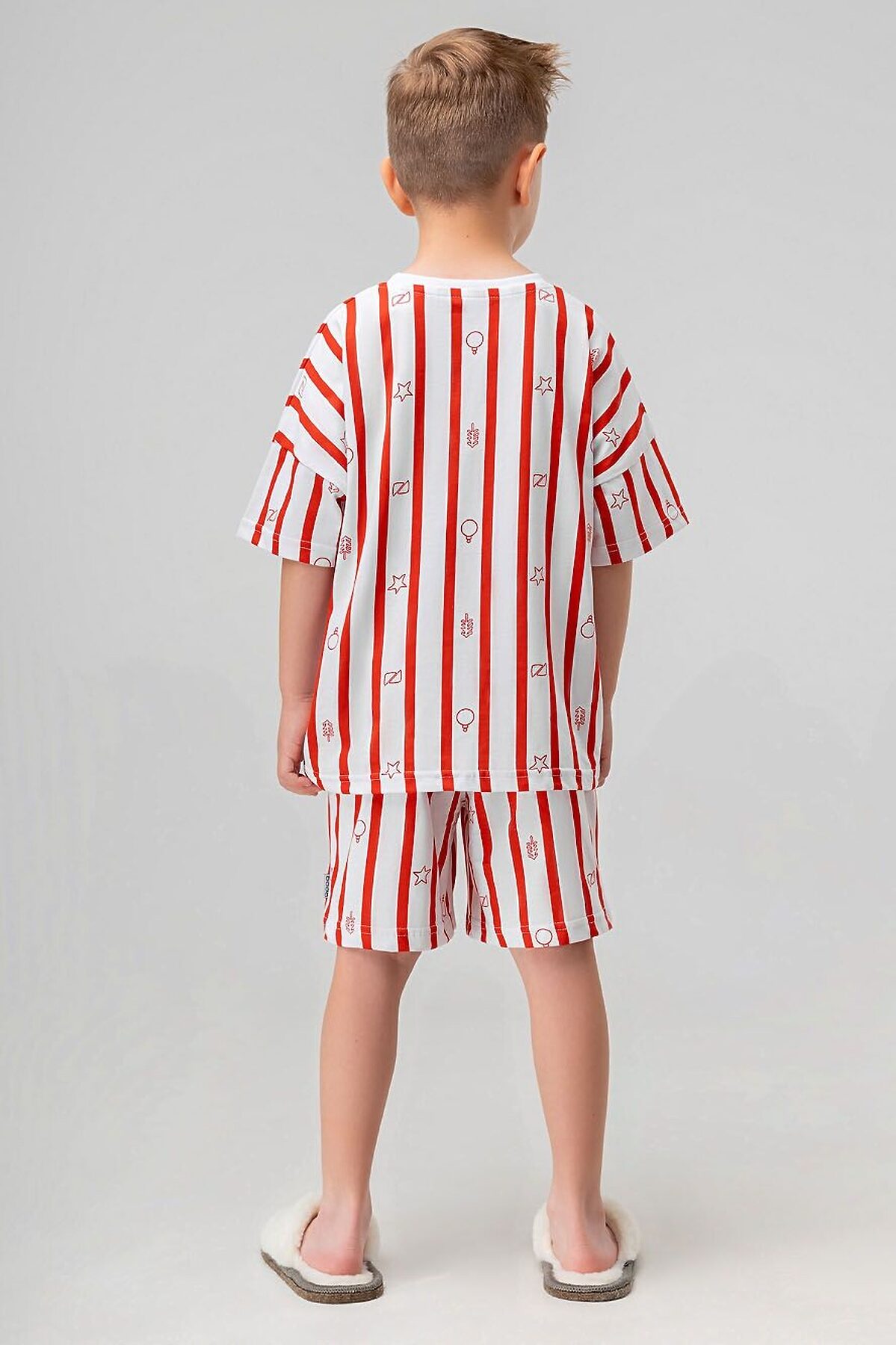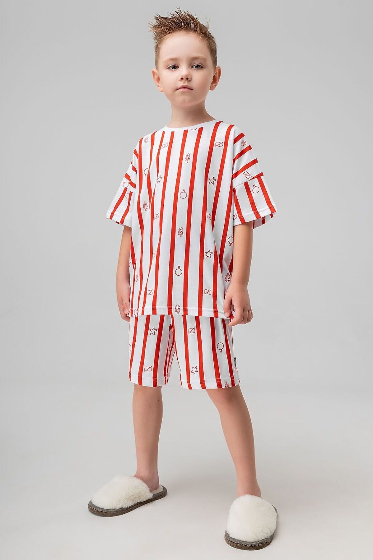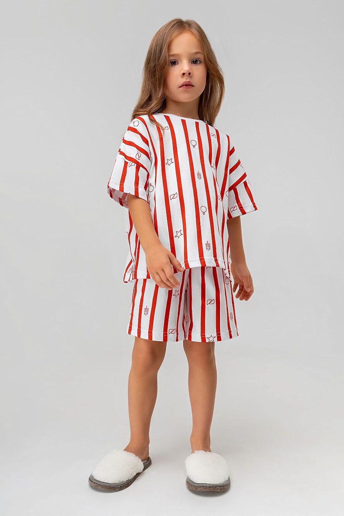 Футболка свободного силуэта с коротким рукавом. Горловина футболки округлой формы. Низ изделия прямой. Шорты свободного силуэта, на поясе, без карманов, низ изделия прямой.