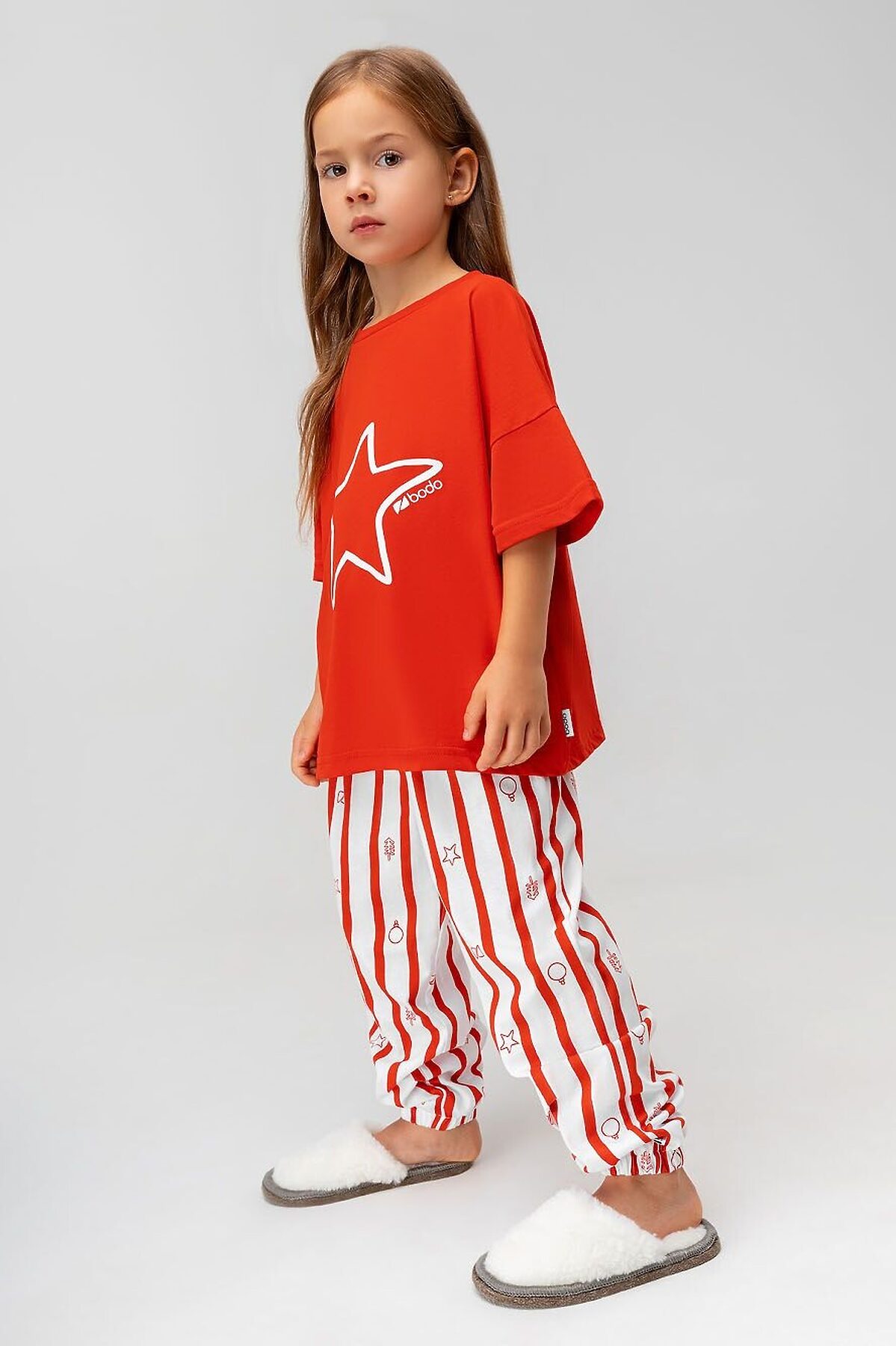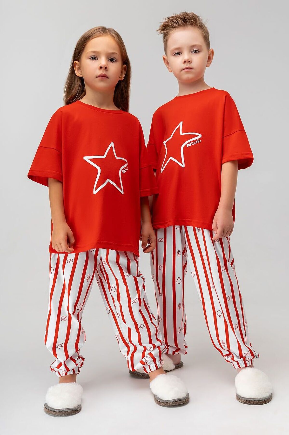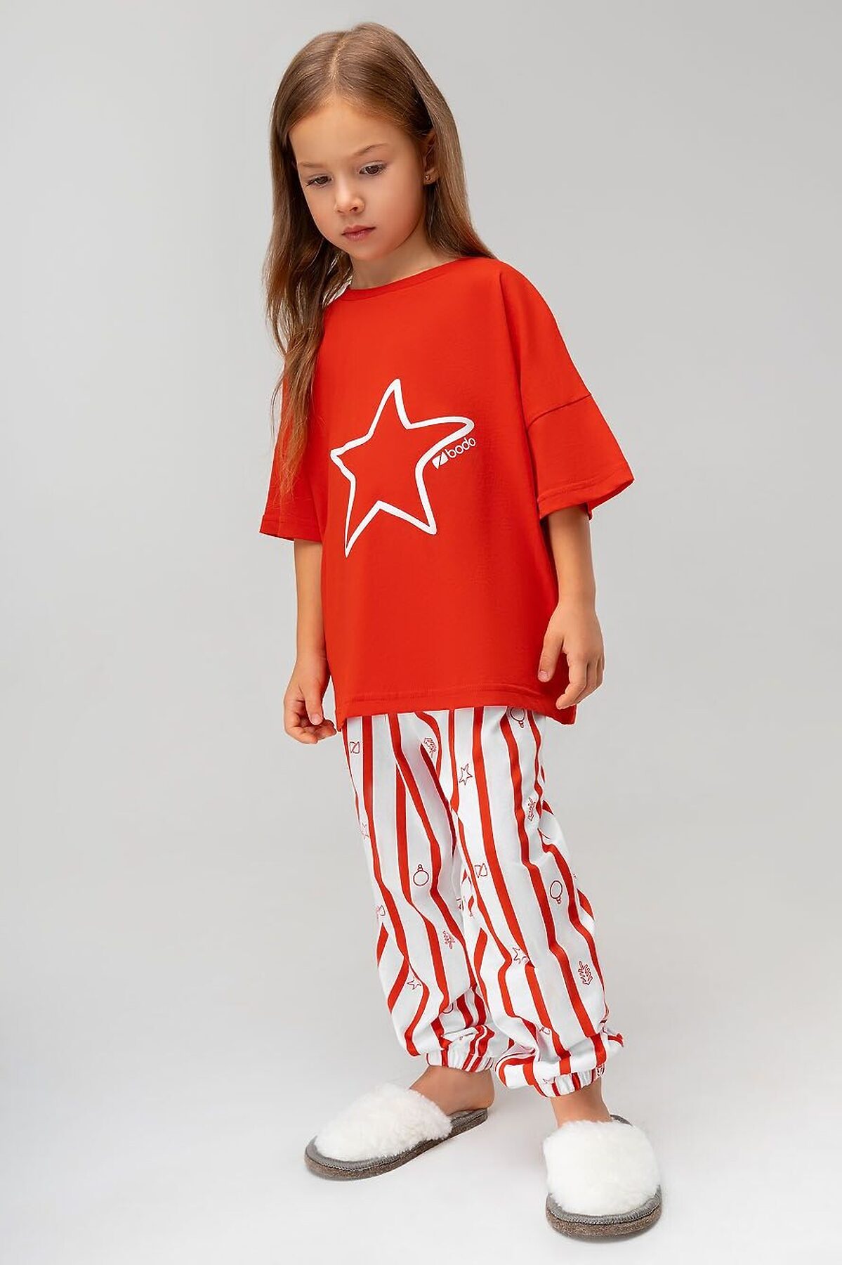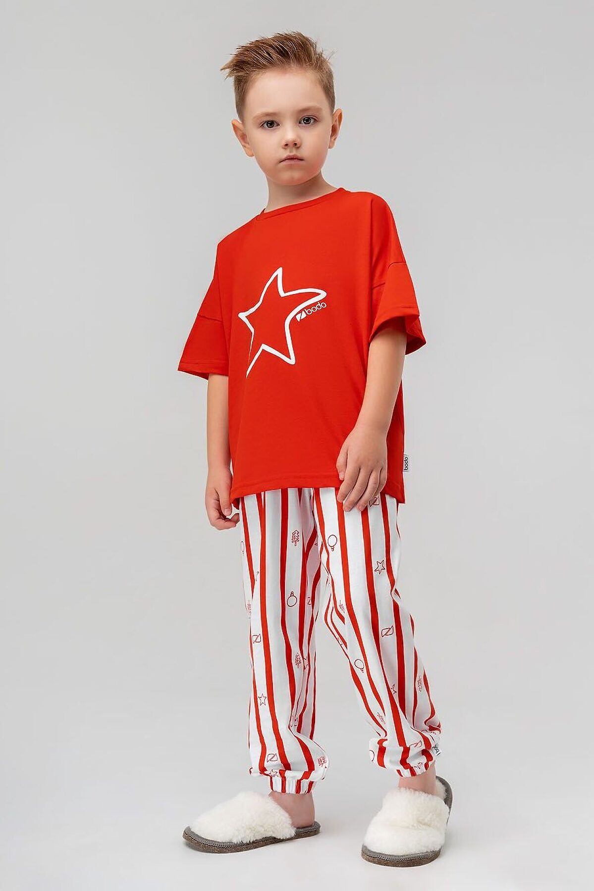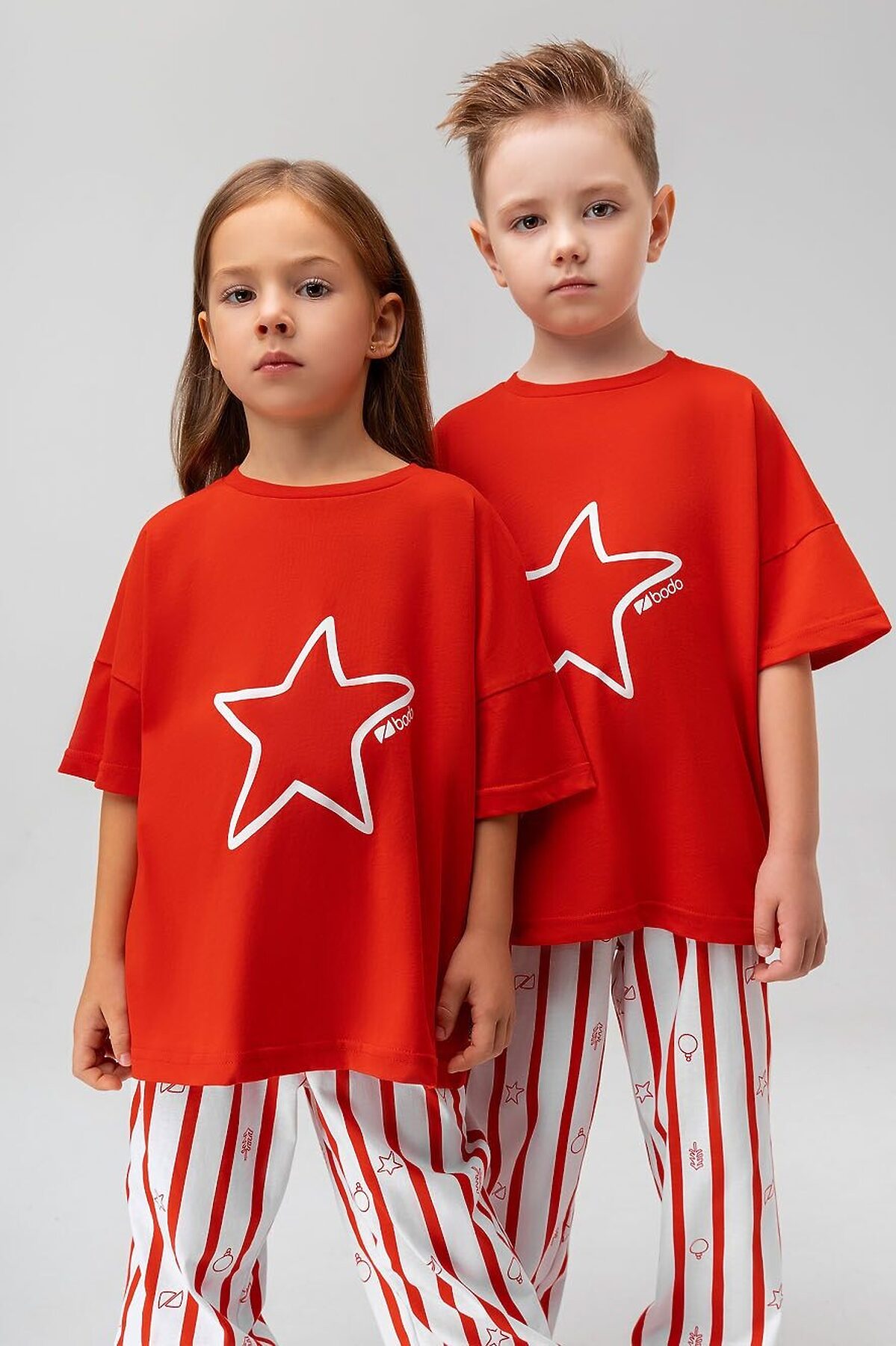 Футболка свободного силуэта с коротким рукавом. Горловина футболки округлой формы. Низ изделия прямой. На полочке расположен принт "Звезда". Брюки свободного силуэта, без карманов, низ изделия на резинке.