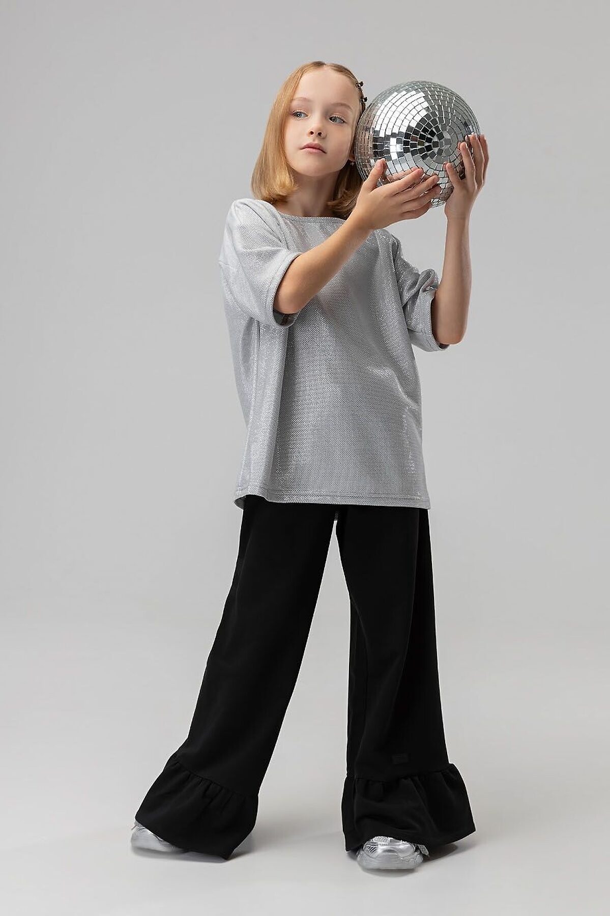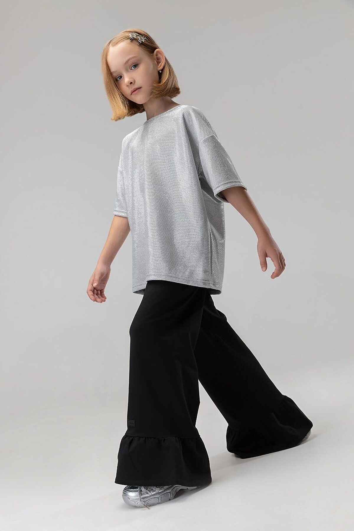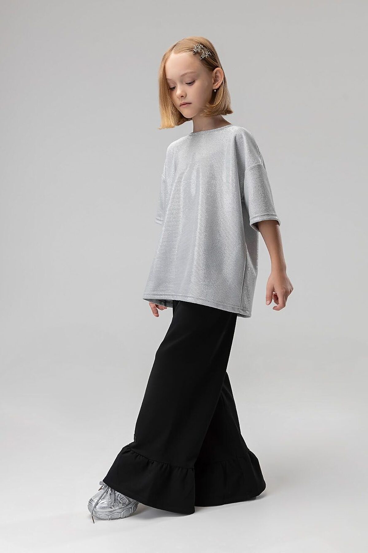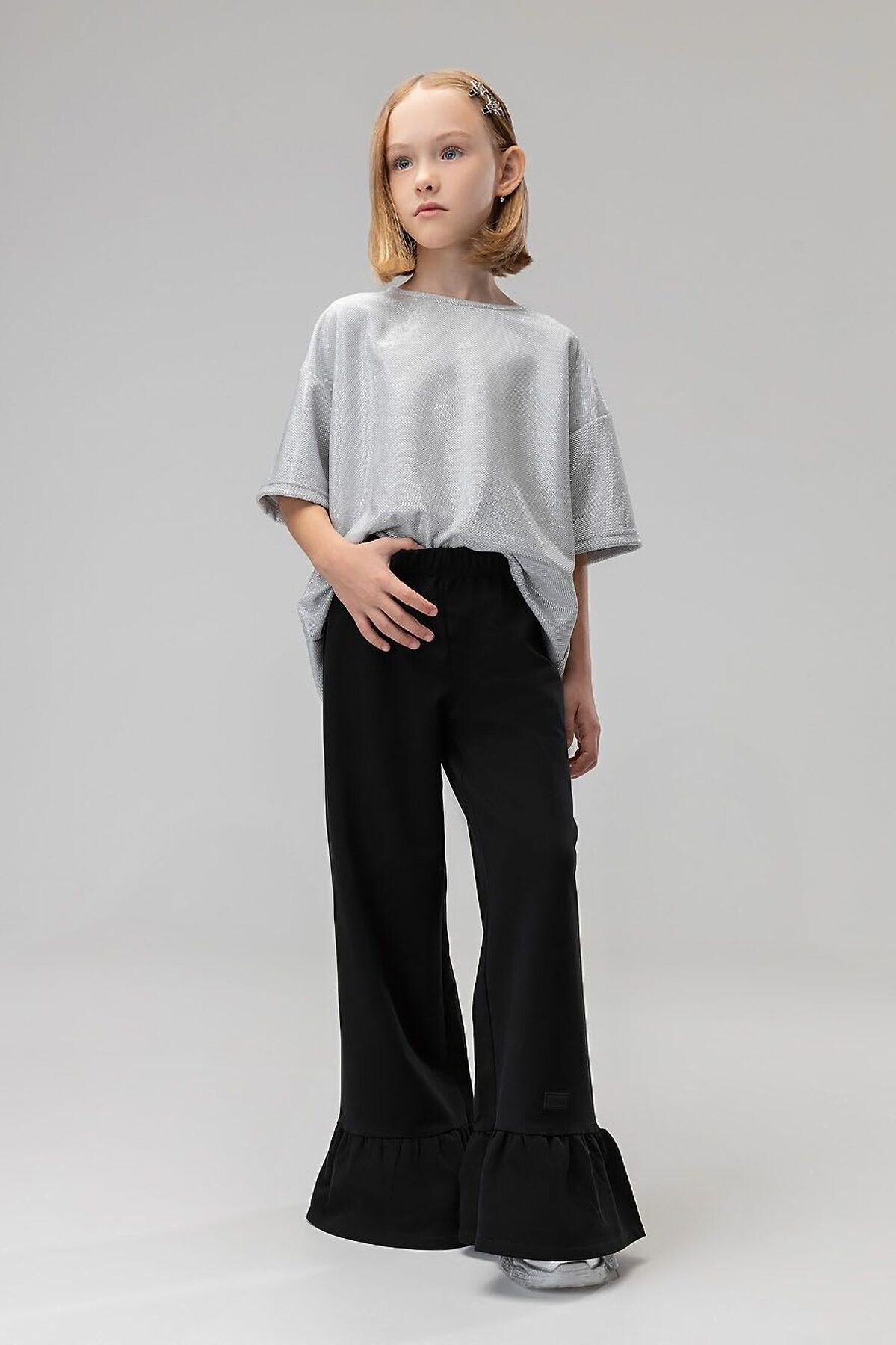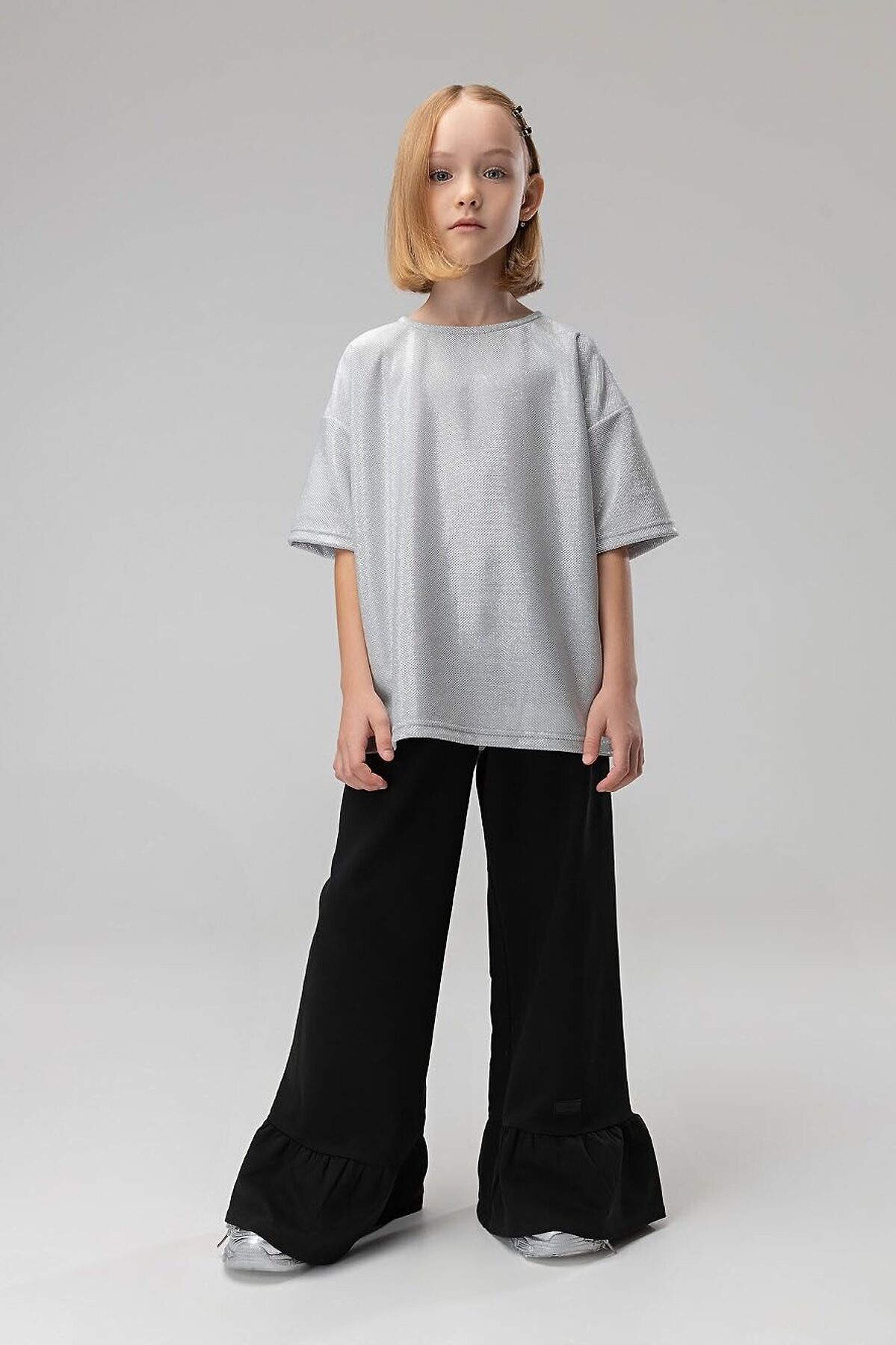 Свободная футболка со спущенным плечом с коротким рукавом. Горловина футболки округлой формы. По спинке разрез, застежка на пуговицу. Футболка блестящая с люрексом. Брюки прямые свободные на поясе с резинкой. По низу брюк воланы.