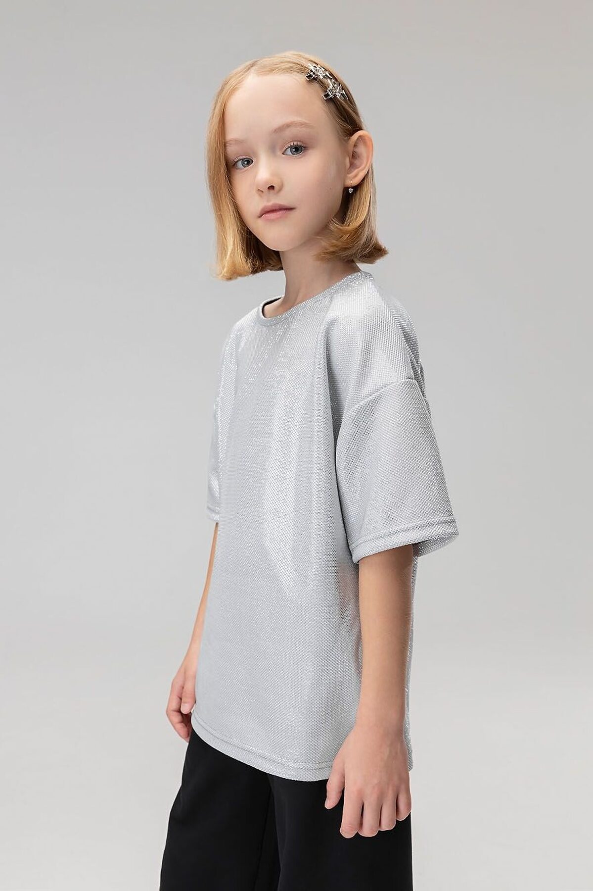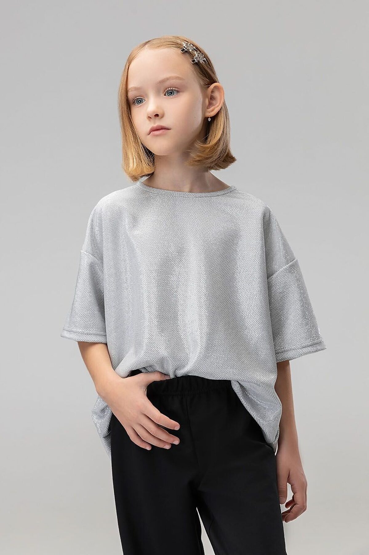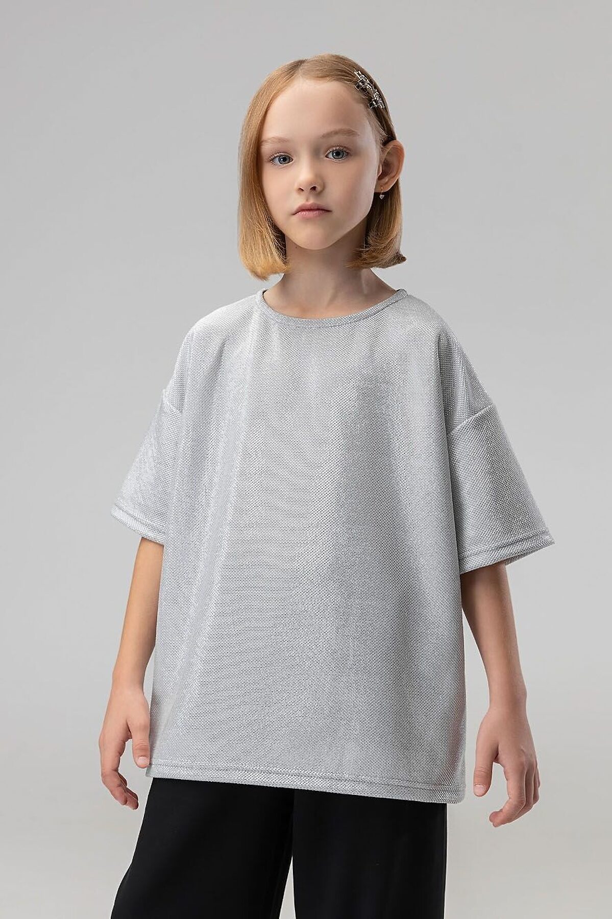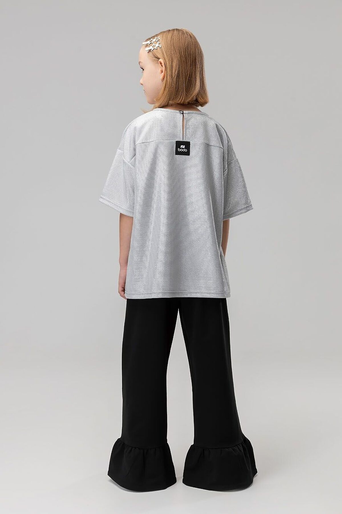 Свободная футболка со спущенным плечом с коротким рукавом. Горловина футболки округлой формы. По спинке разрез, застежка на пуговицу. Футболка блестящая с люрексом. Брюки прямые свободные на поясе с резинкой. По низу брюк воланы.