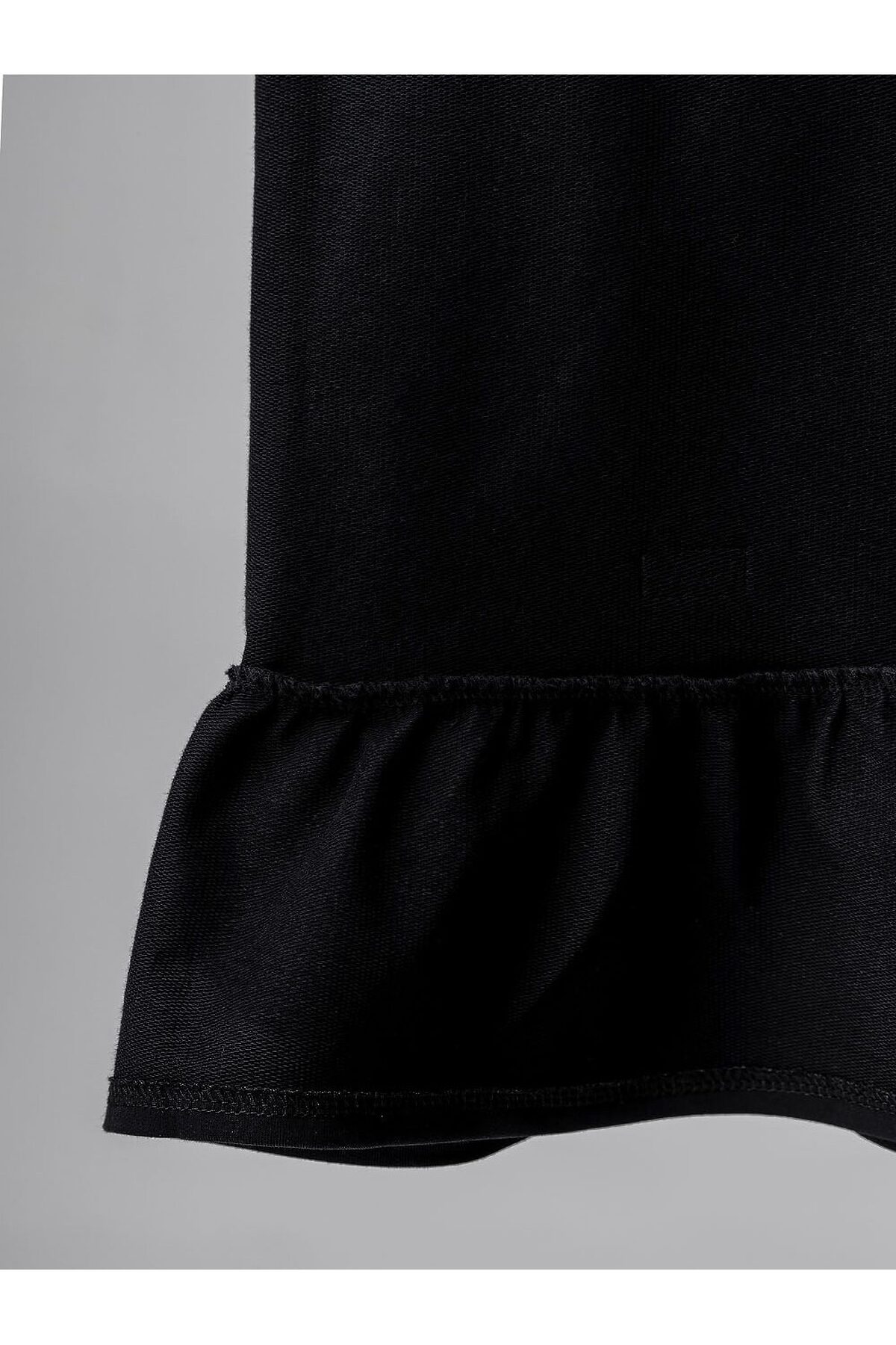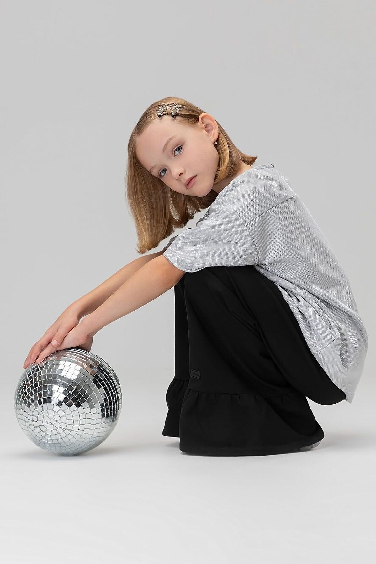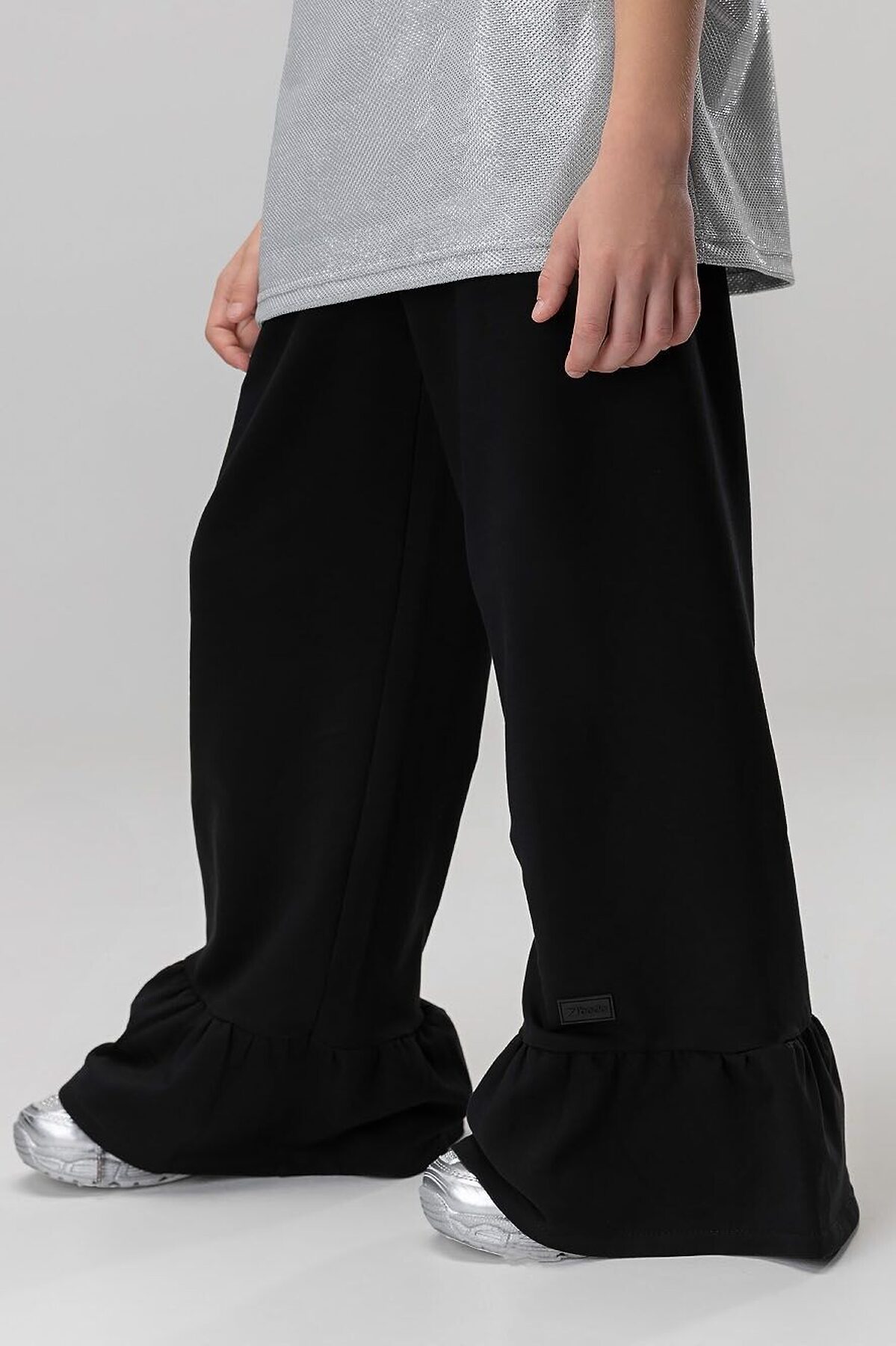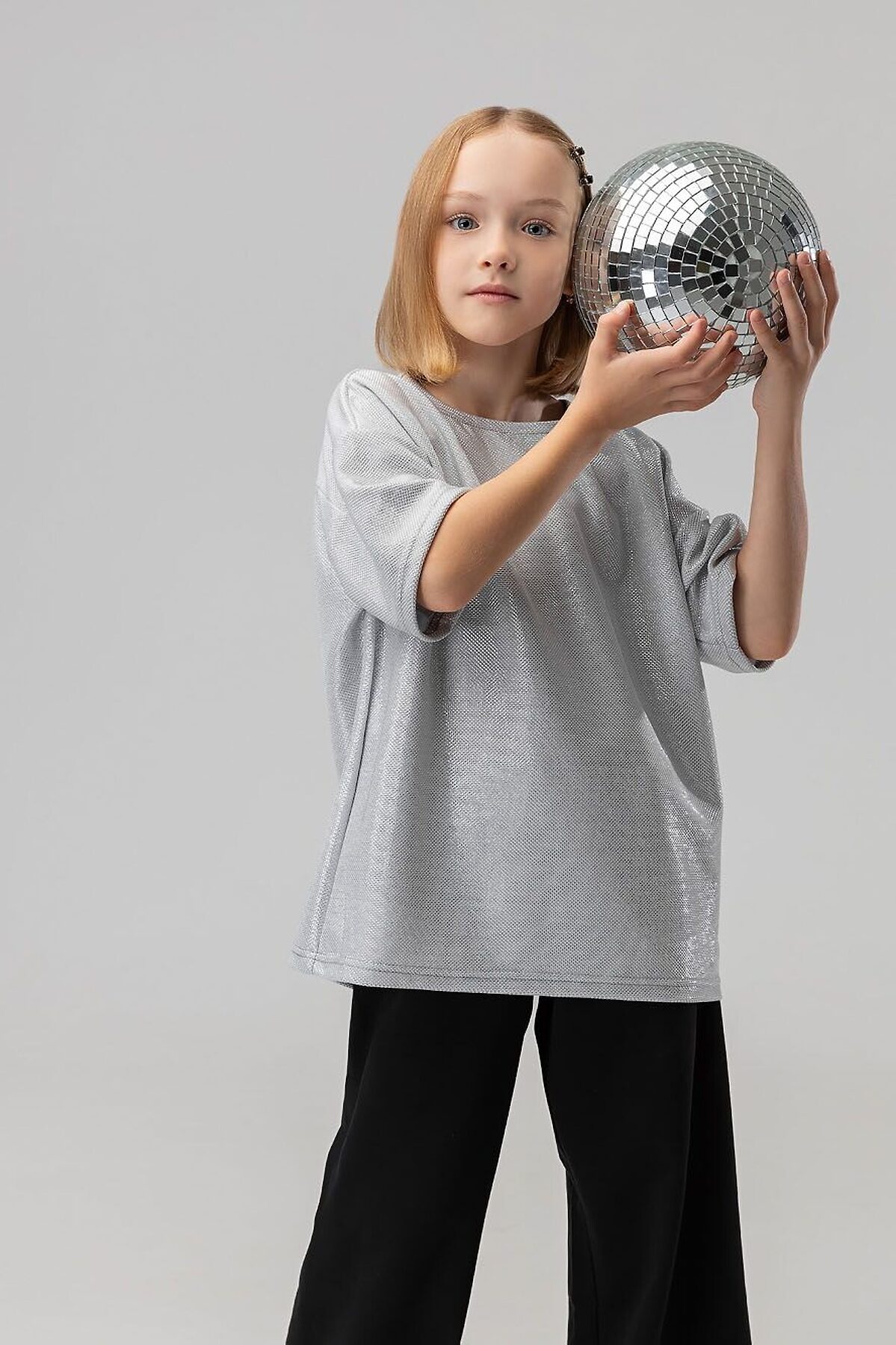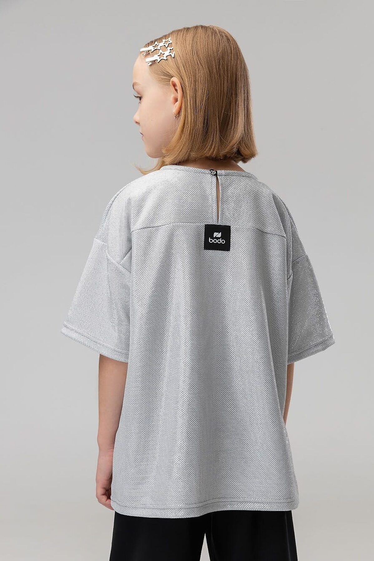 Свободная футболка со спущенным плечом с коротким рукавом. Горловина футболки округлой формы. По спинке разрез, застежка на пуговицу. Футболка блестящая с люрексом. Брюки прямые свободные на поясе с резинкой. По низу брюк воланы.