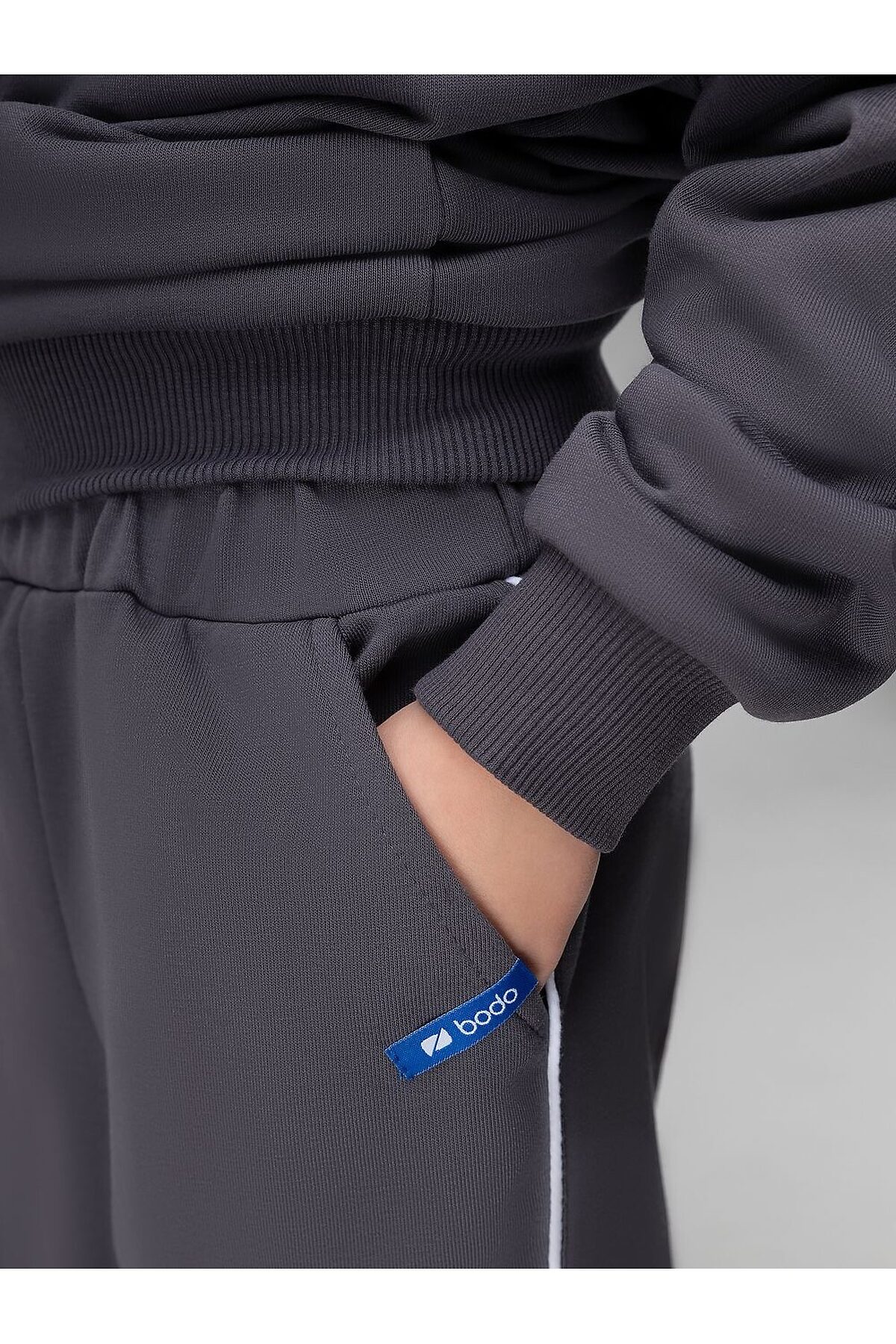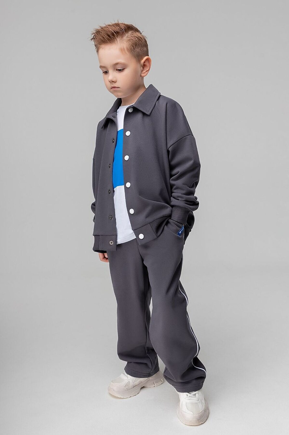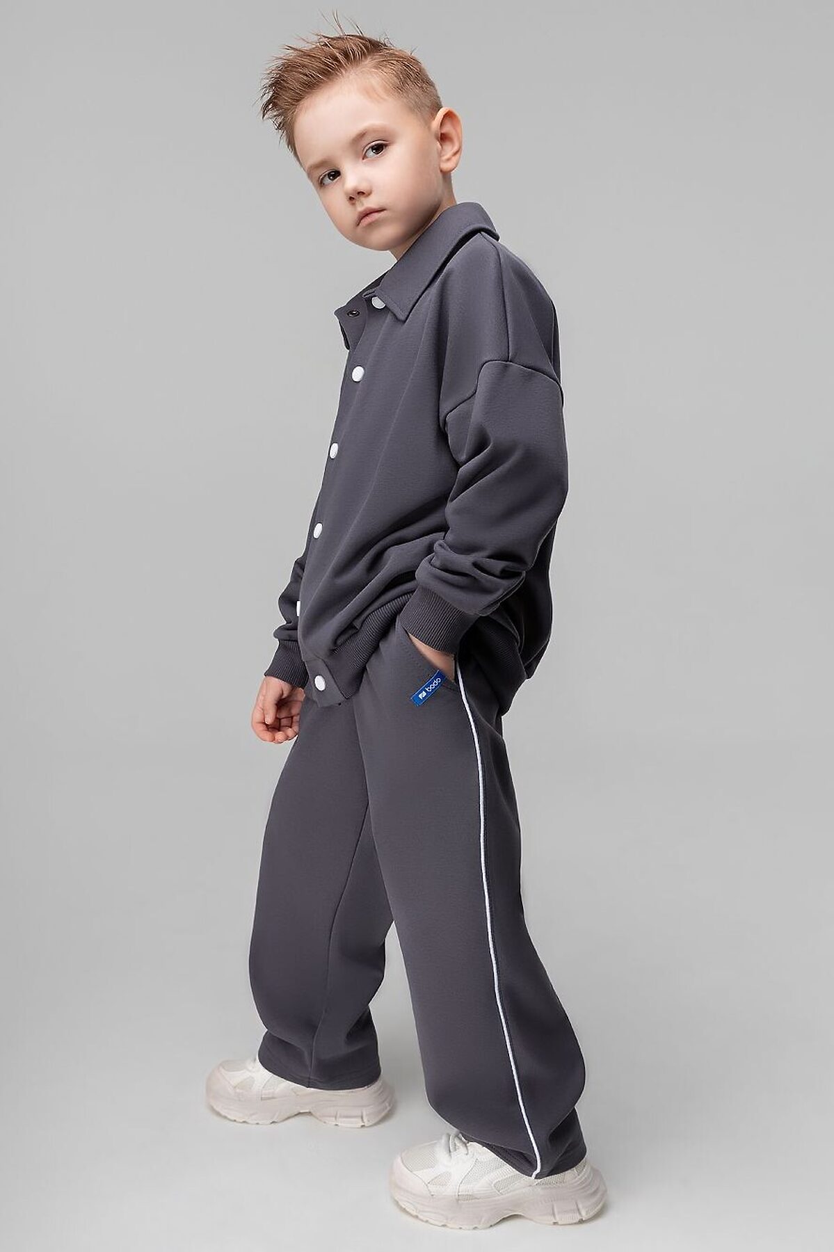 Свободная толстовка прямого силуэта на кнопках, с длинным рукавом с манжетой. Толстовка с отложным воротником. Толстовка с поясом по низу изделия. Брюки прямые свободные на поясе с внутренней резинкой. С боковыми карманами. Брюки оформлены атласным кантом по боковым швам.