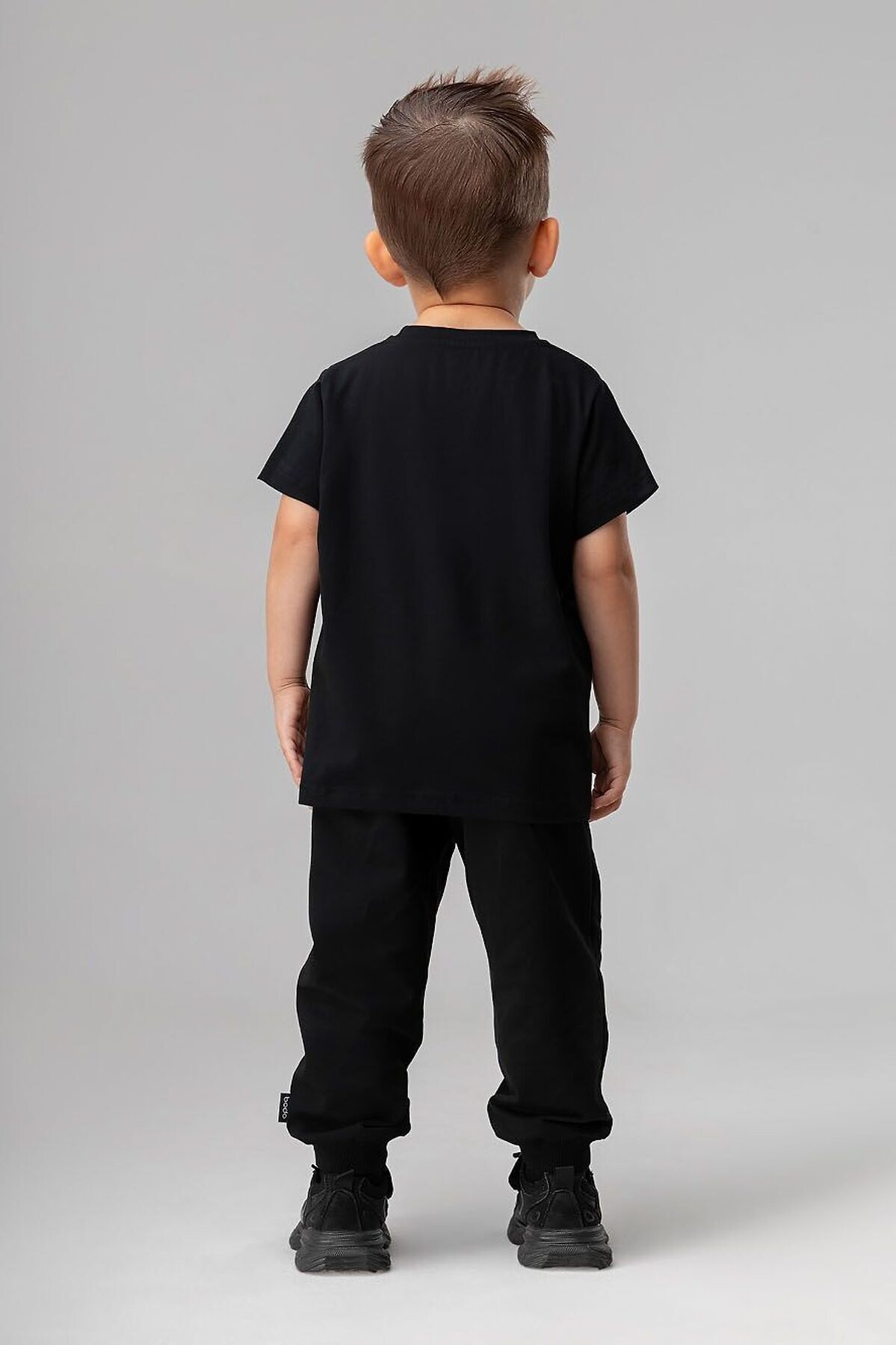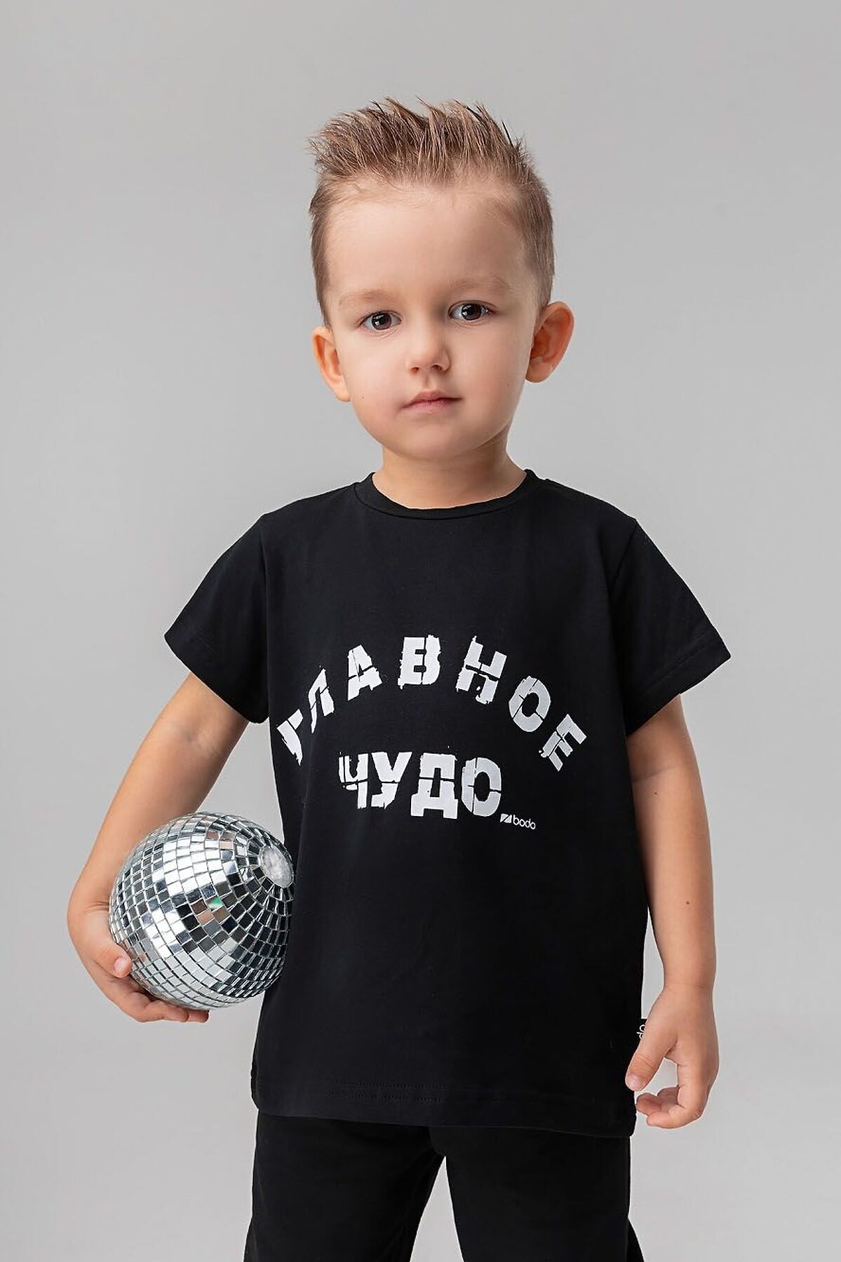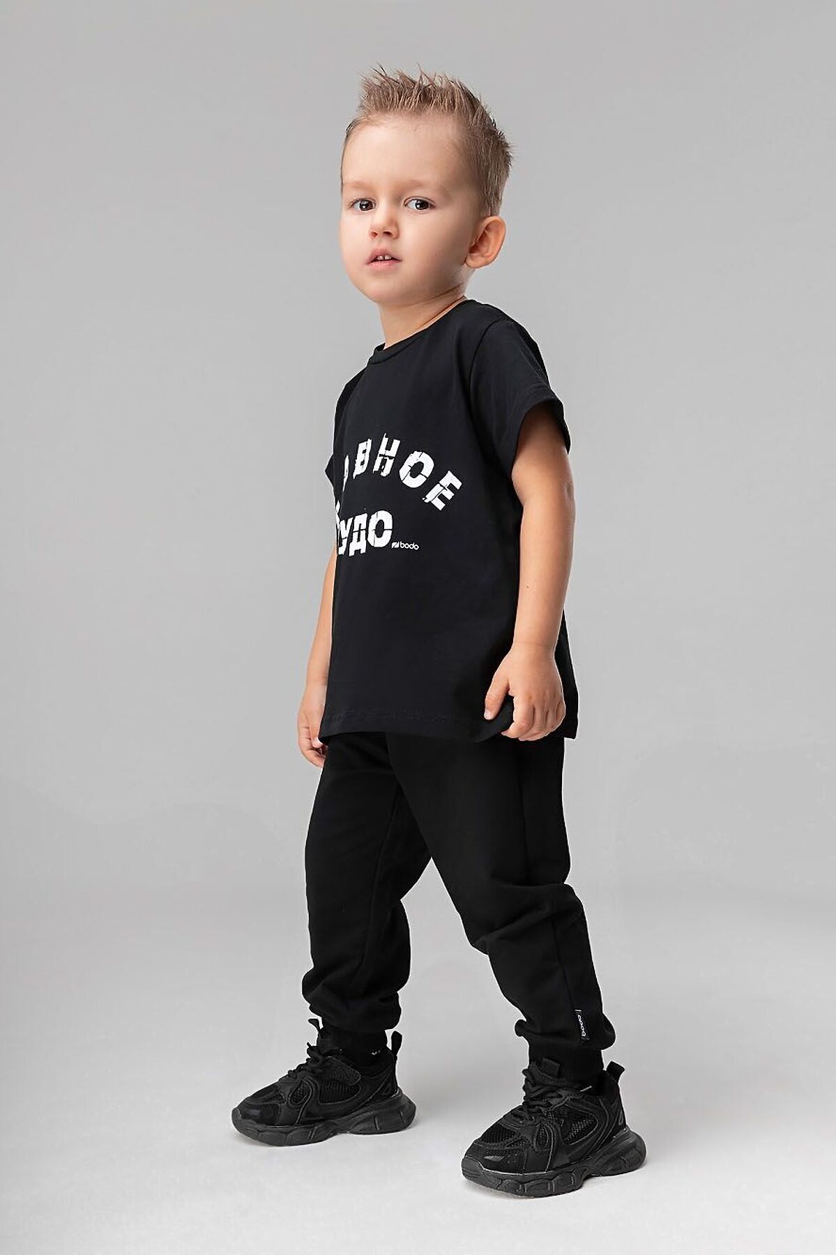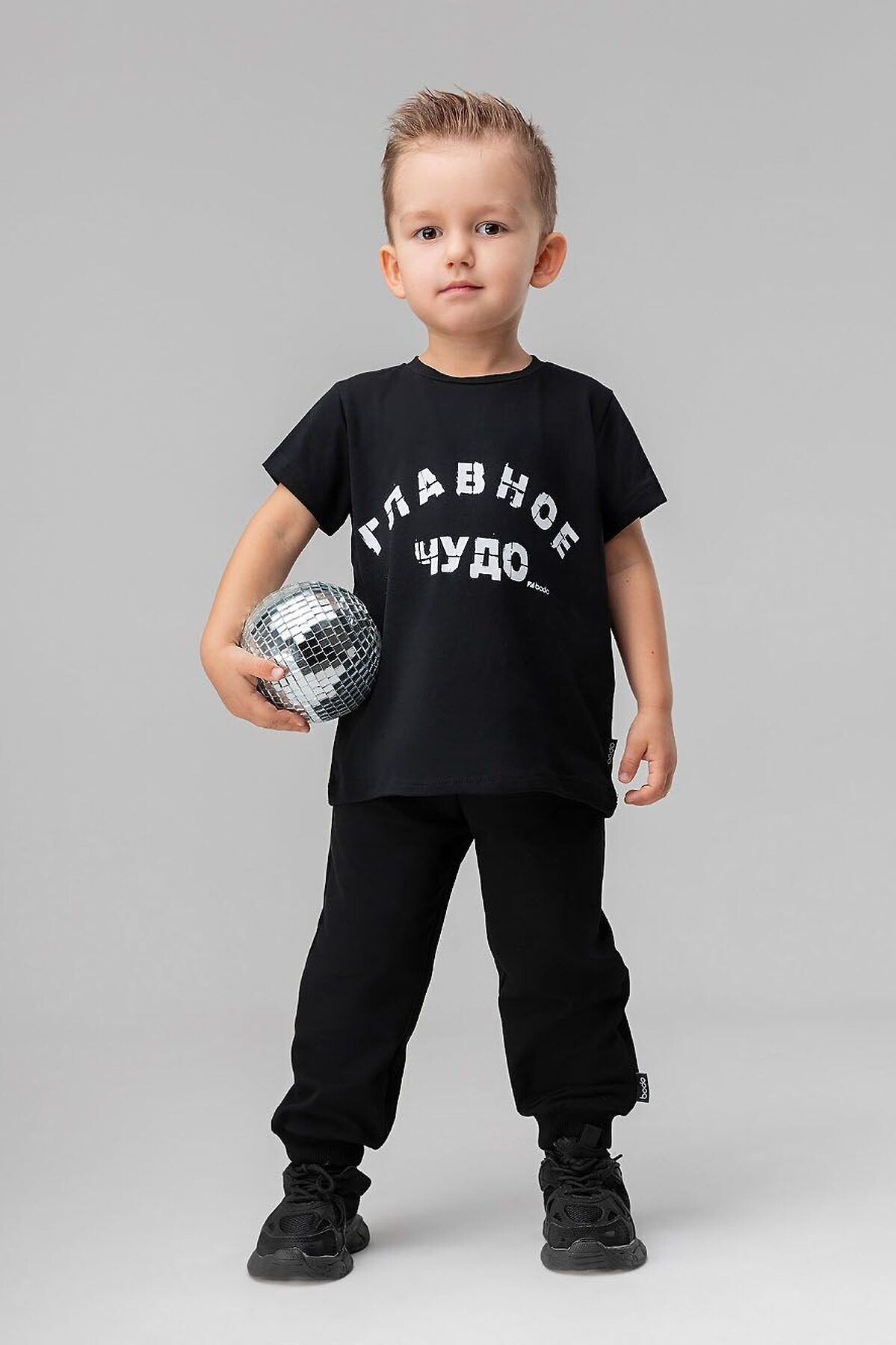 Прямая футболка с принтом "Главное чудо". Горловина округлой формы. Низ изделия прямой. Брюки прямые на поясе с внутренней резинкой. Брюки с манжетой.