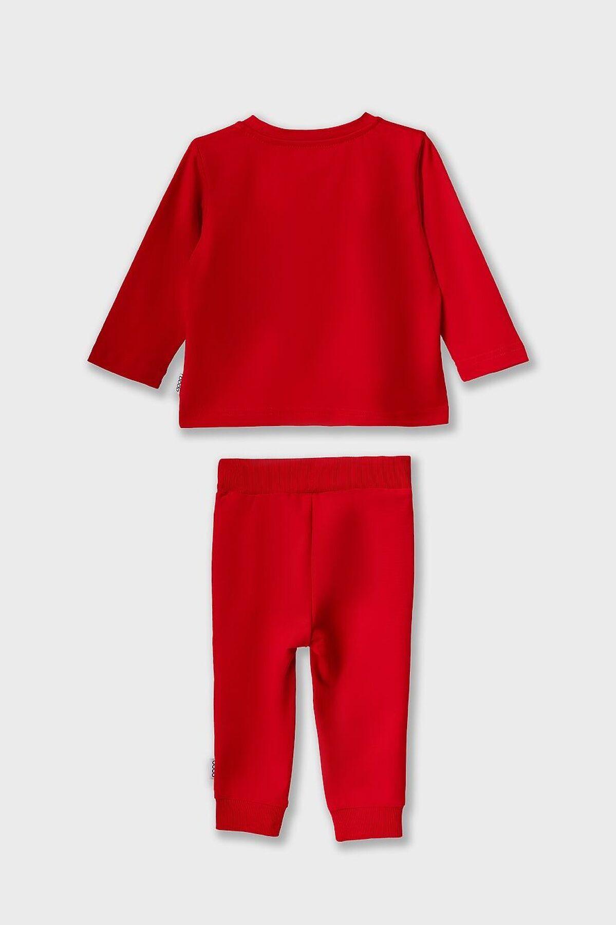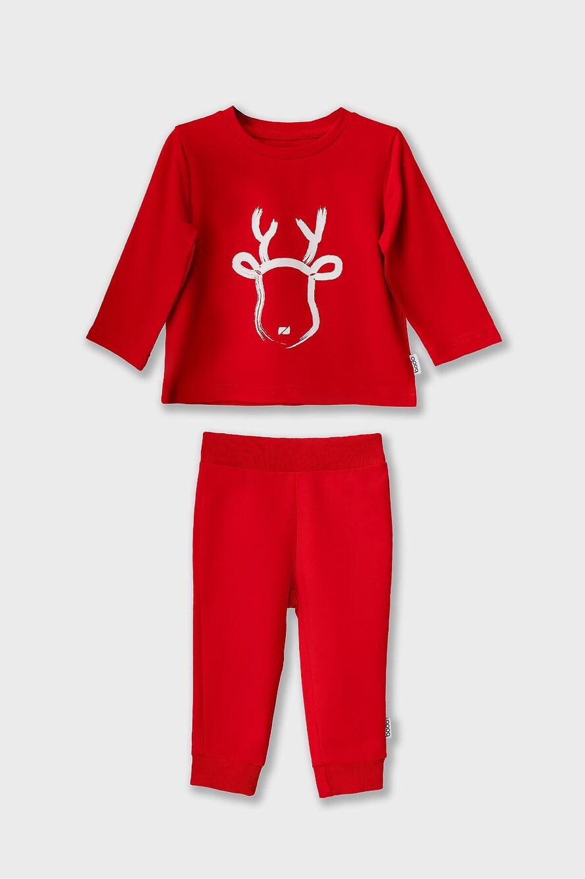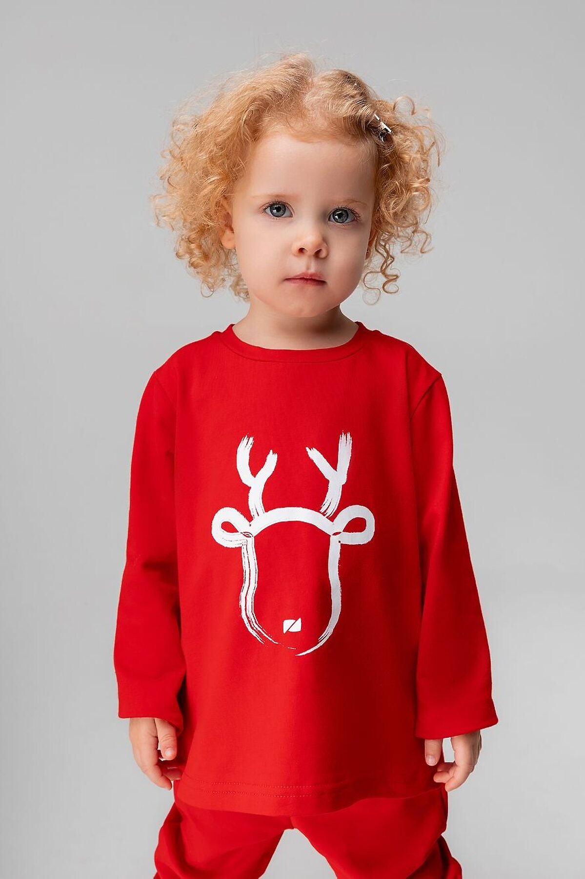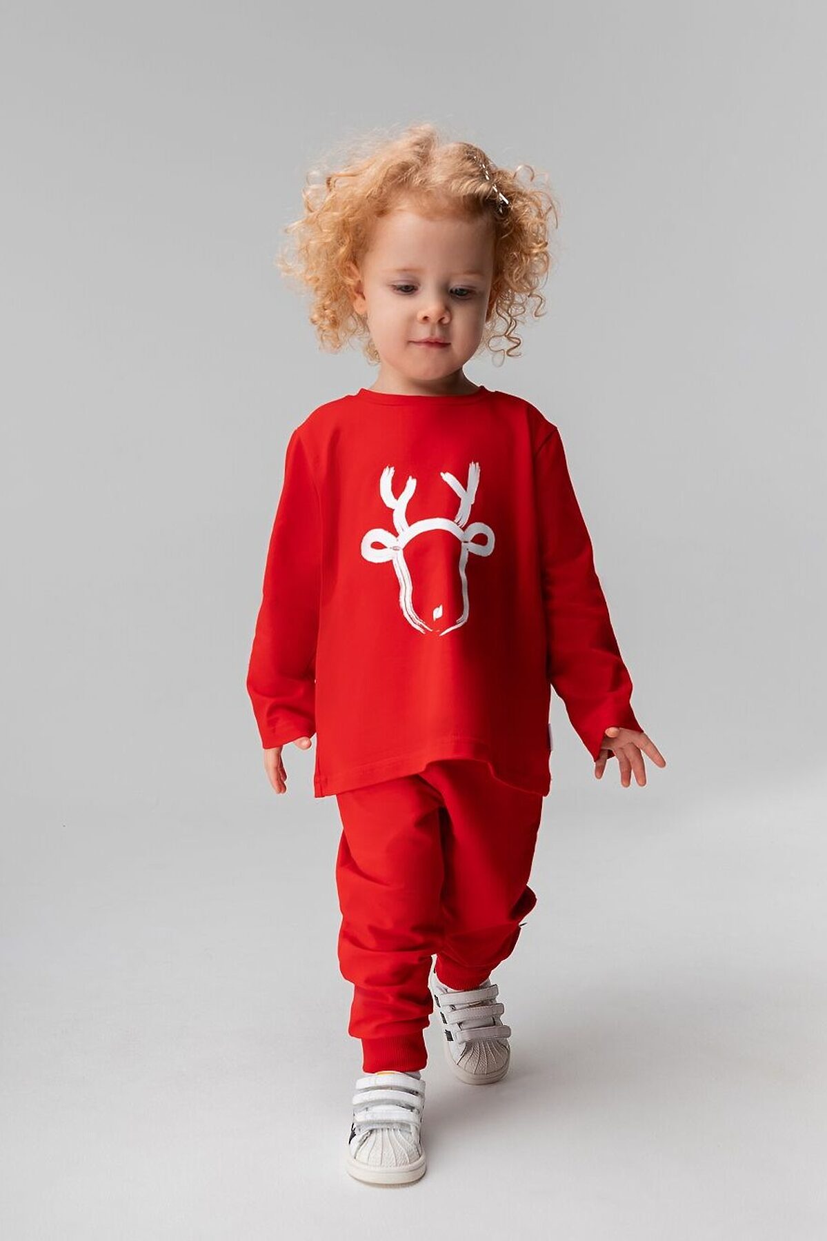 Лонгслив прямой с длинными рукавами. Горловина округлой формы. Низ изделия прямой. На полочке печать "Олень". Брюки прямые на поясе с внутренней резинкой. Брюки с манжетой.