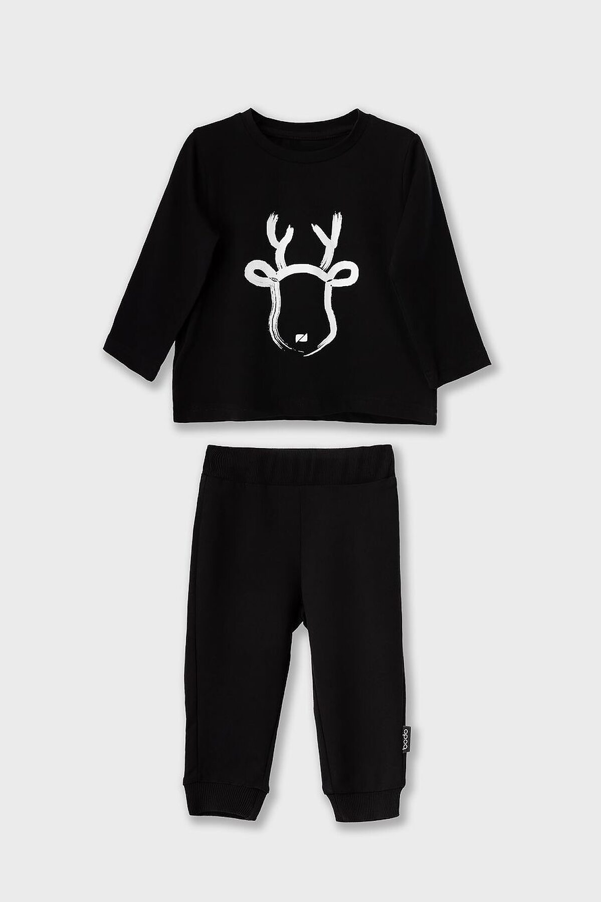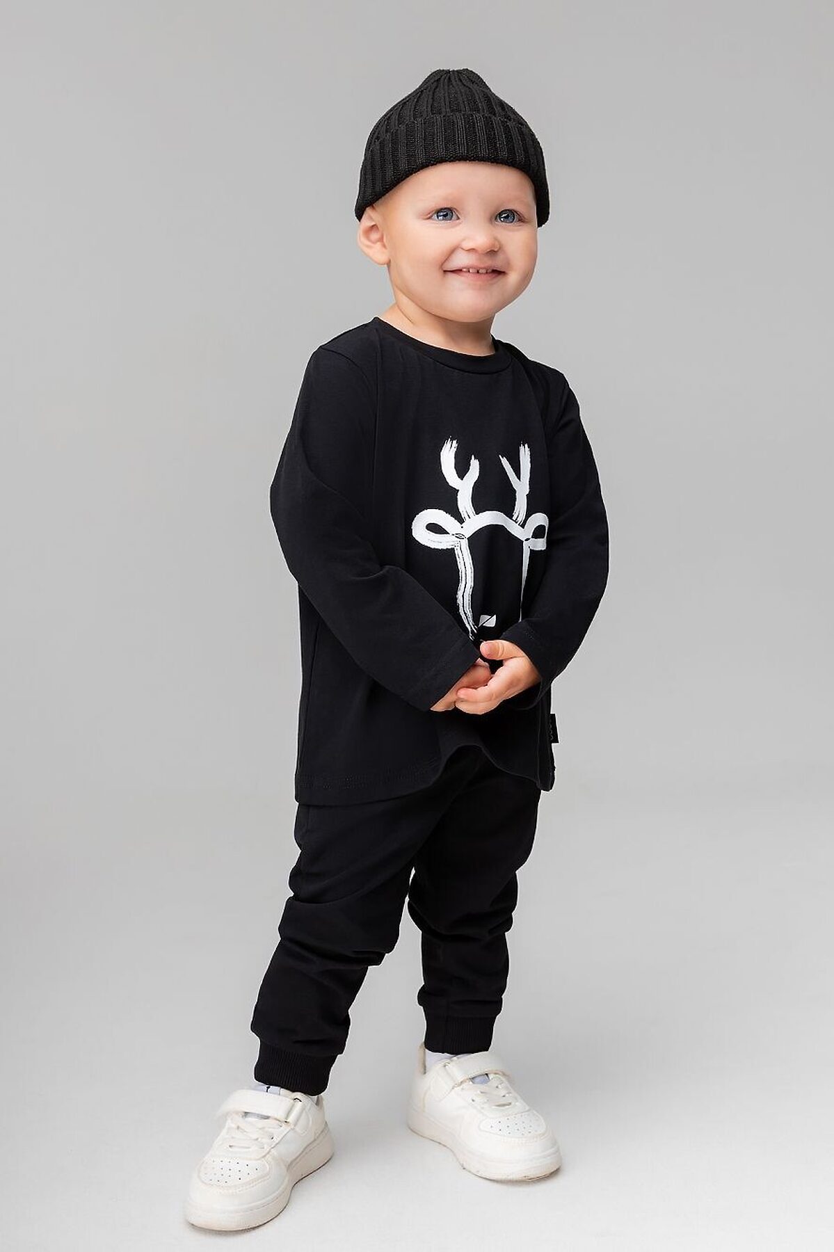 Лонгслив прямой с длинными рукавами. Горловина округлой формы. Низ изделия прямой. На полочке печать "Олень". Брюки прямые на поясе с внутренней резинкой. Брюки с манжетой.