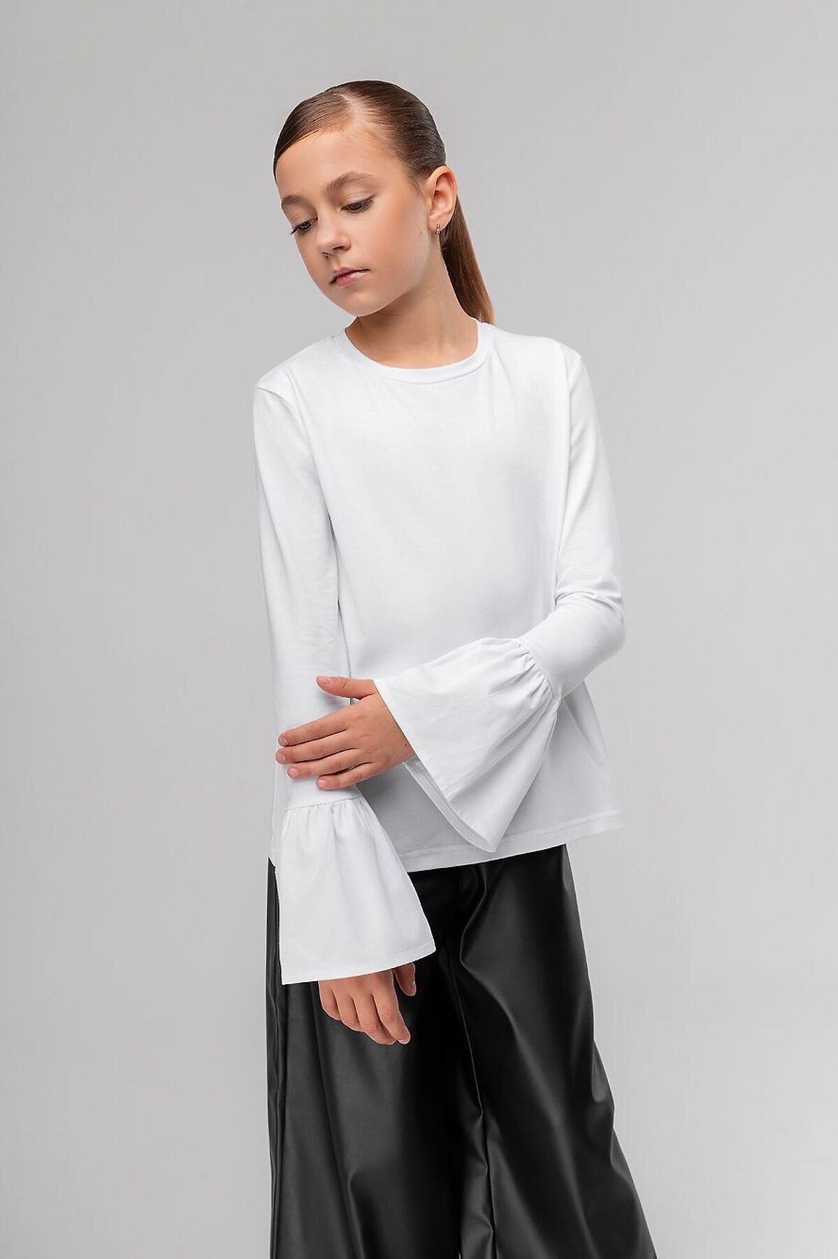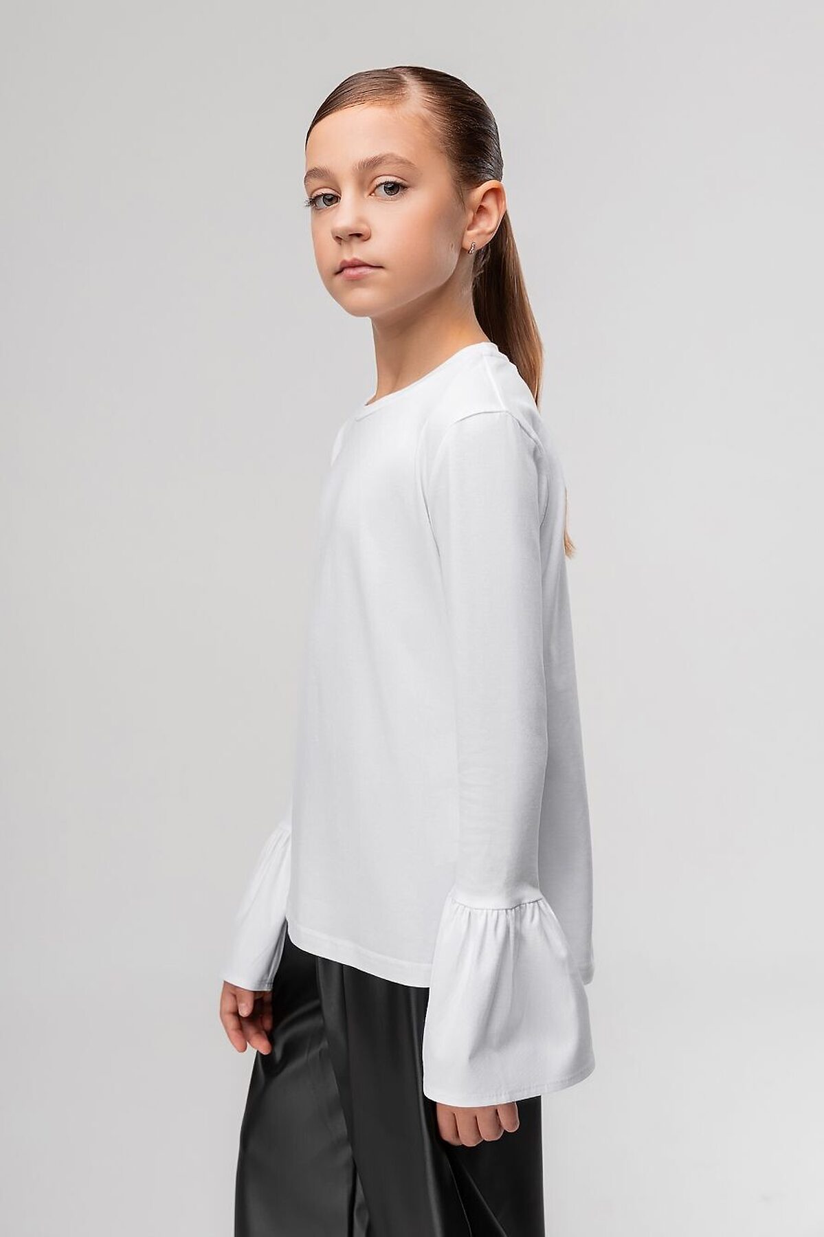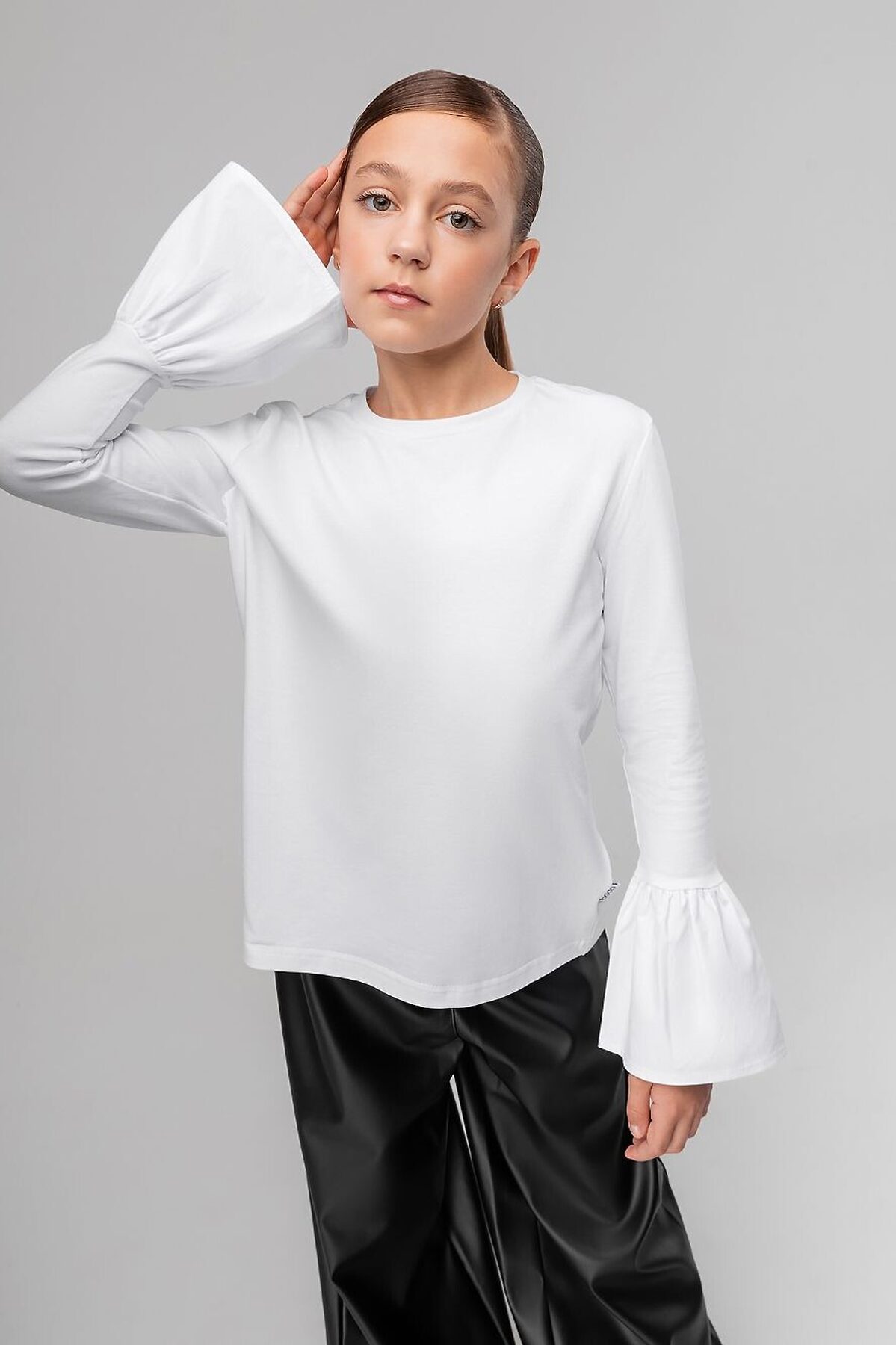 Лонгслив свободного силуэта с длинным рукавом, низ рукава оформлен воланам. Горловина футболки округлой формы. Низ изделия прямой.