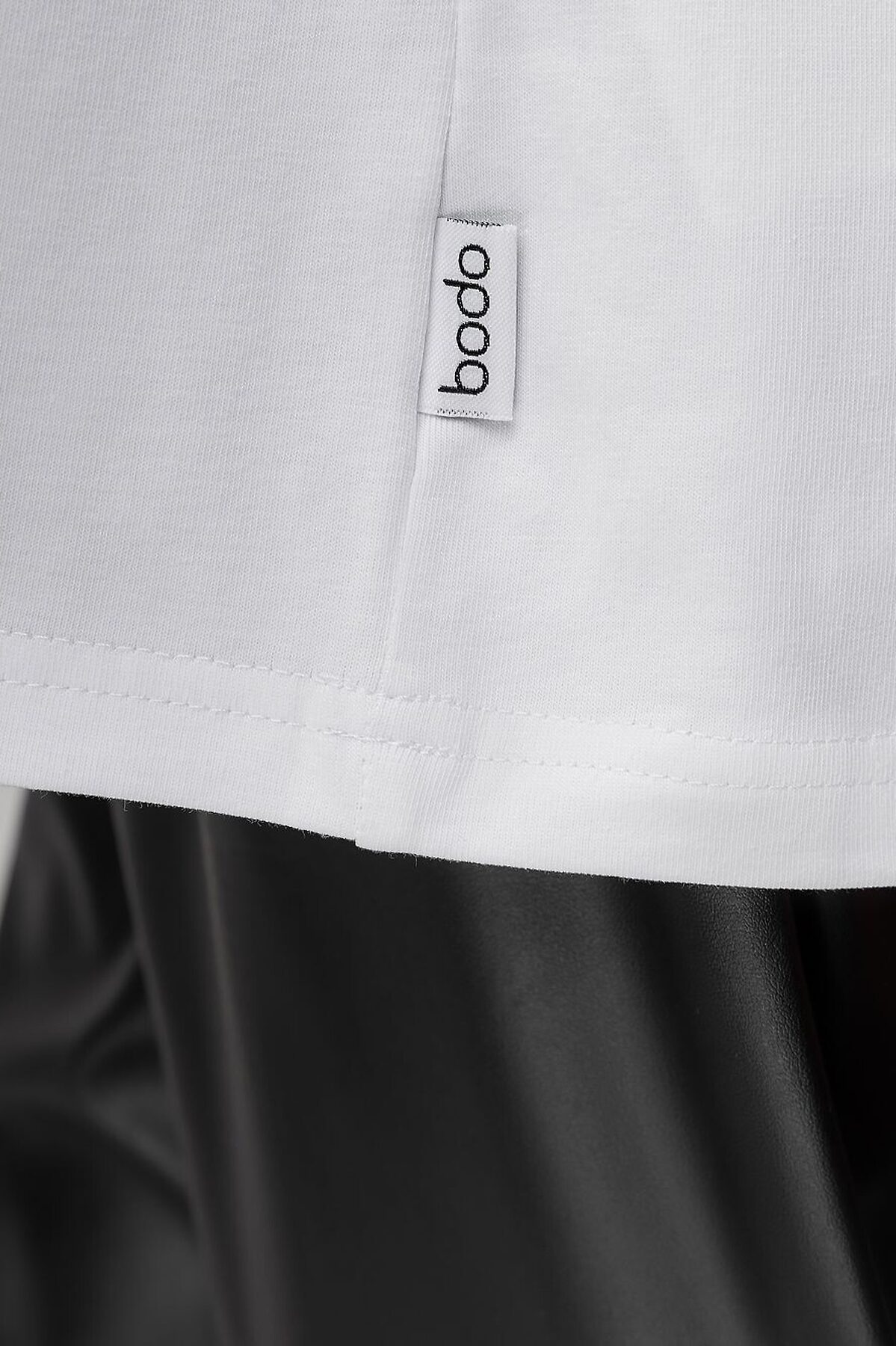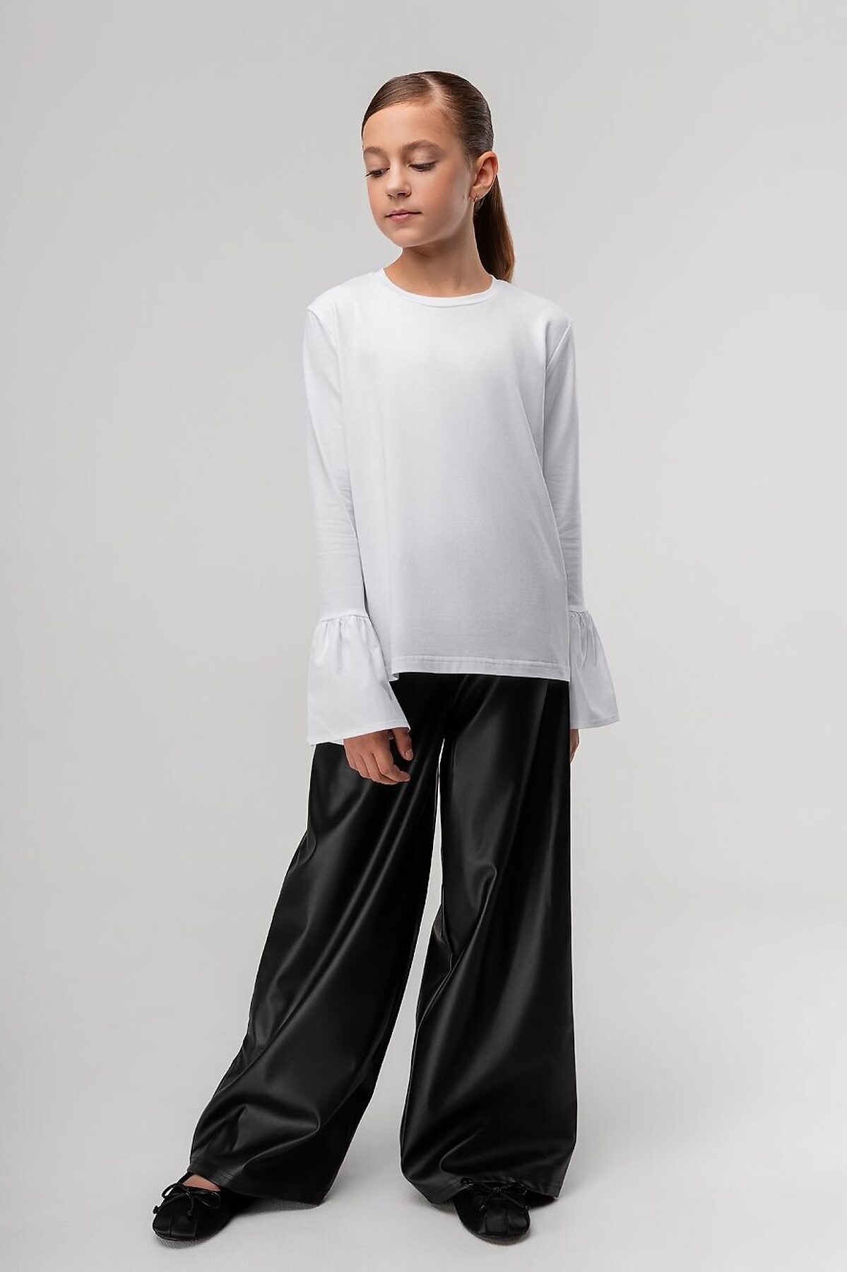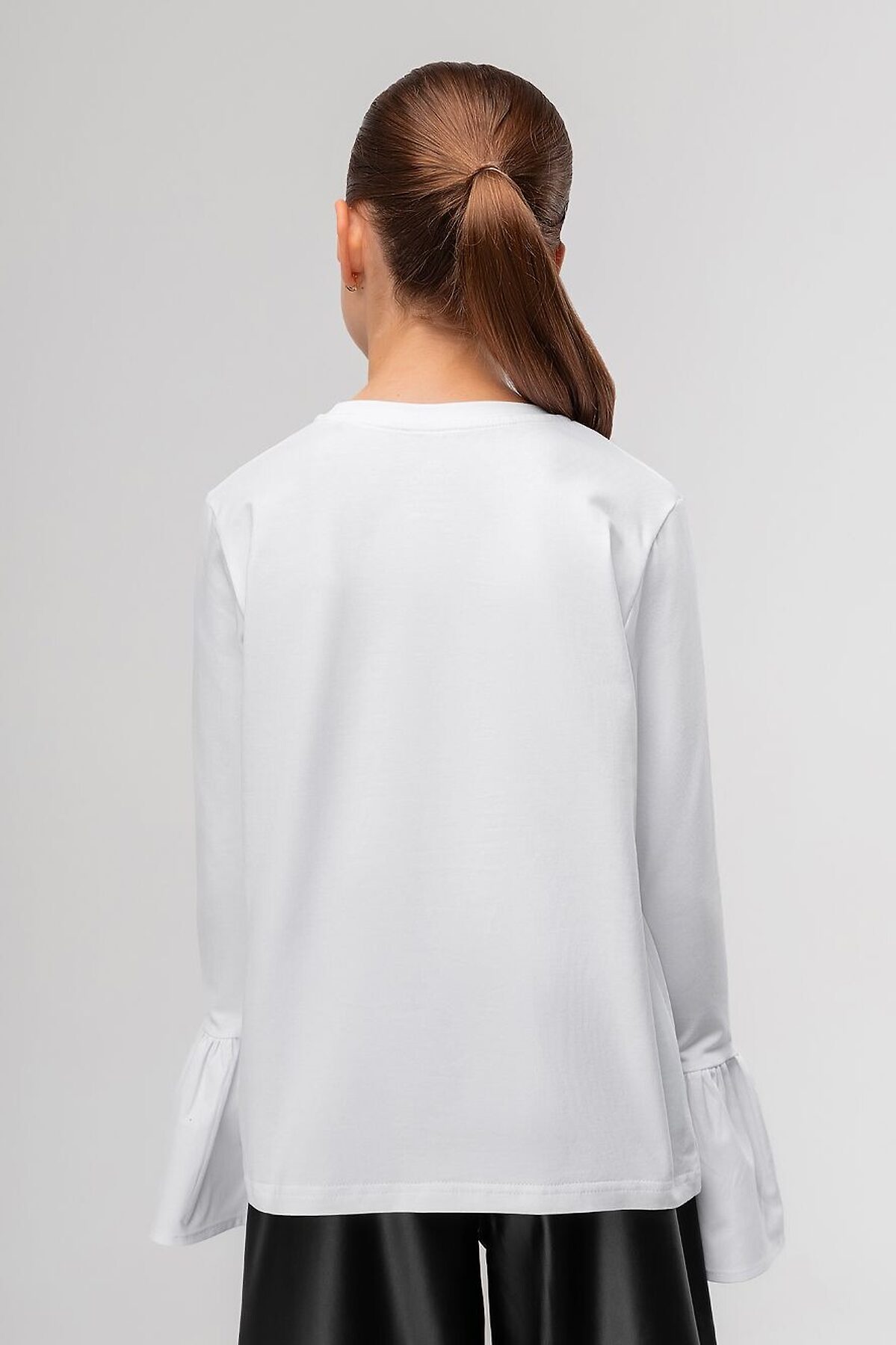 Лонгслив свободного силуэта с длинным рукавом, низ рукава оформлен воланам. Горловина футболки округлой формы. Низ изделия прямой.