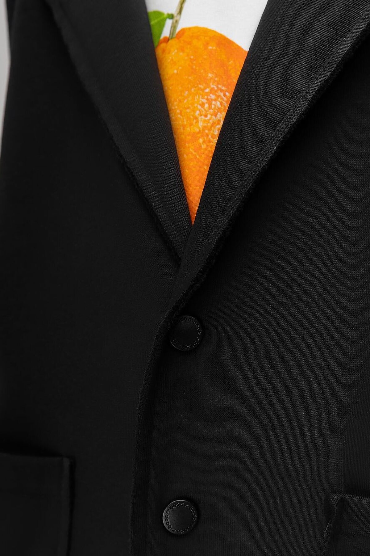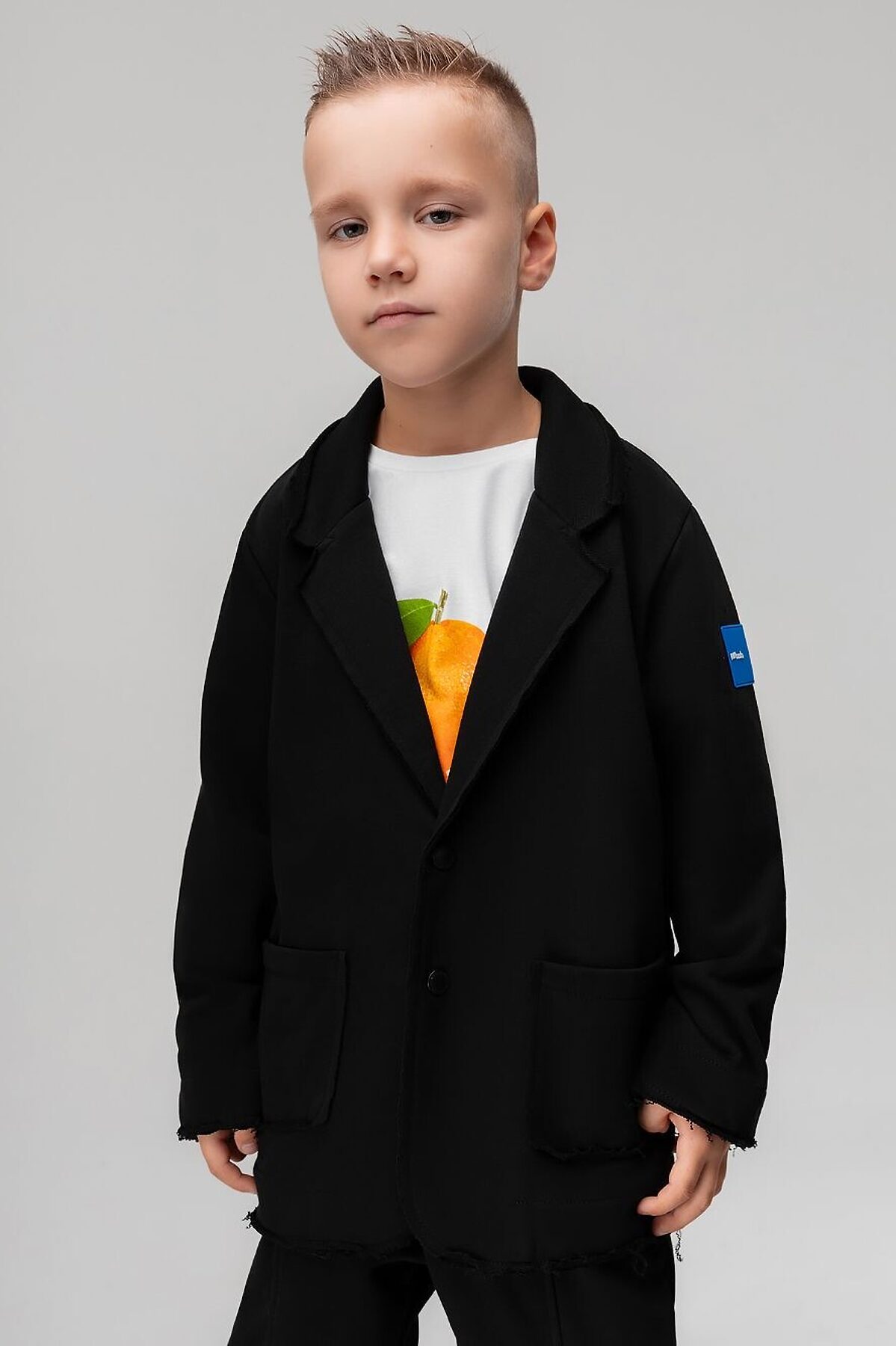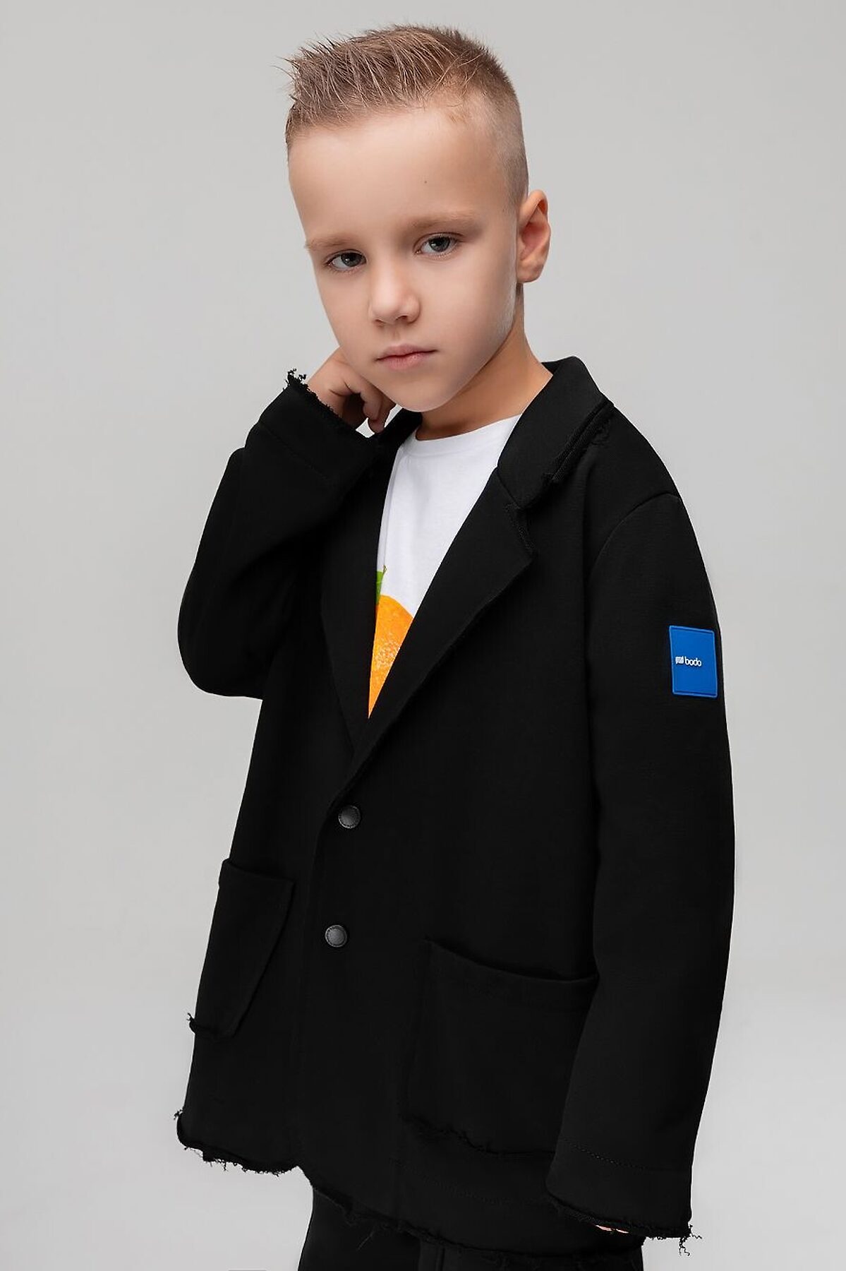 Прямой пиджак без подкладки, отложной воротник, на полочке два накладных кармана с необработанными краями.