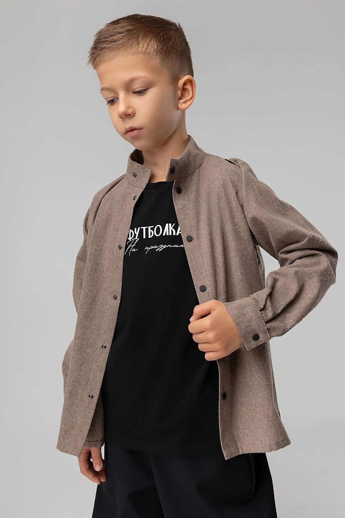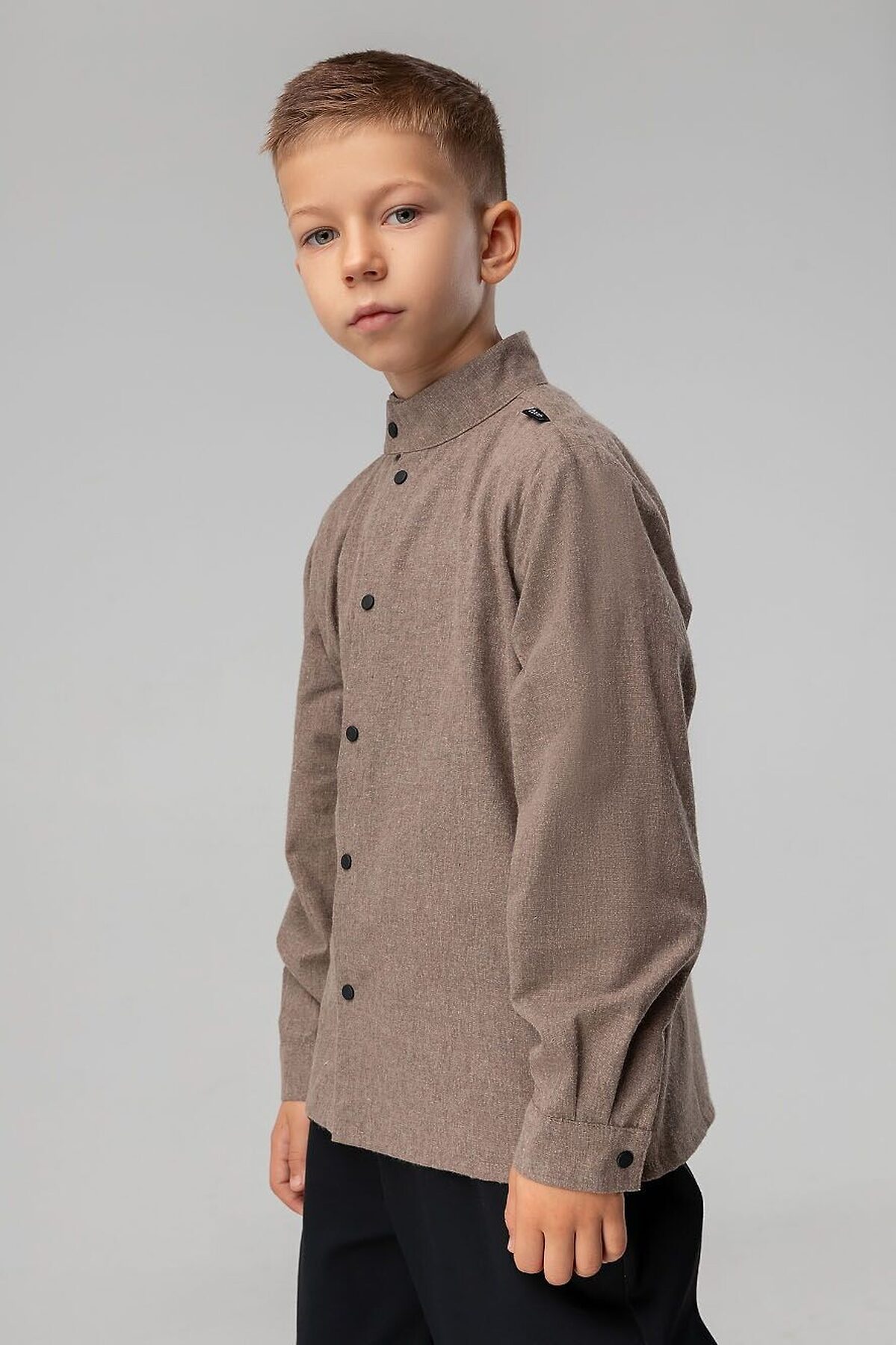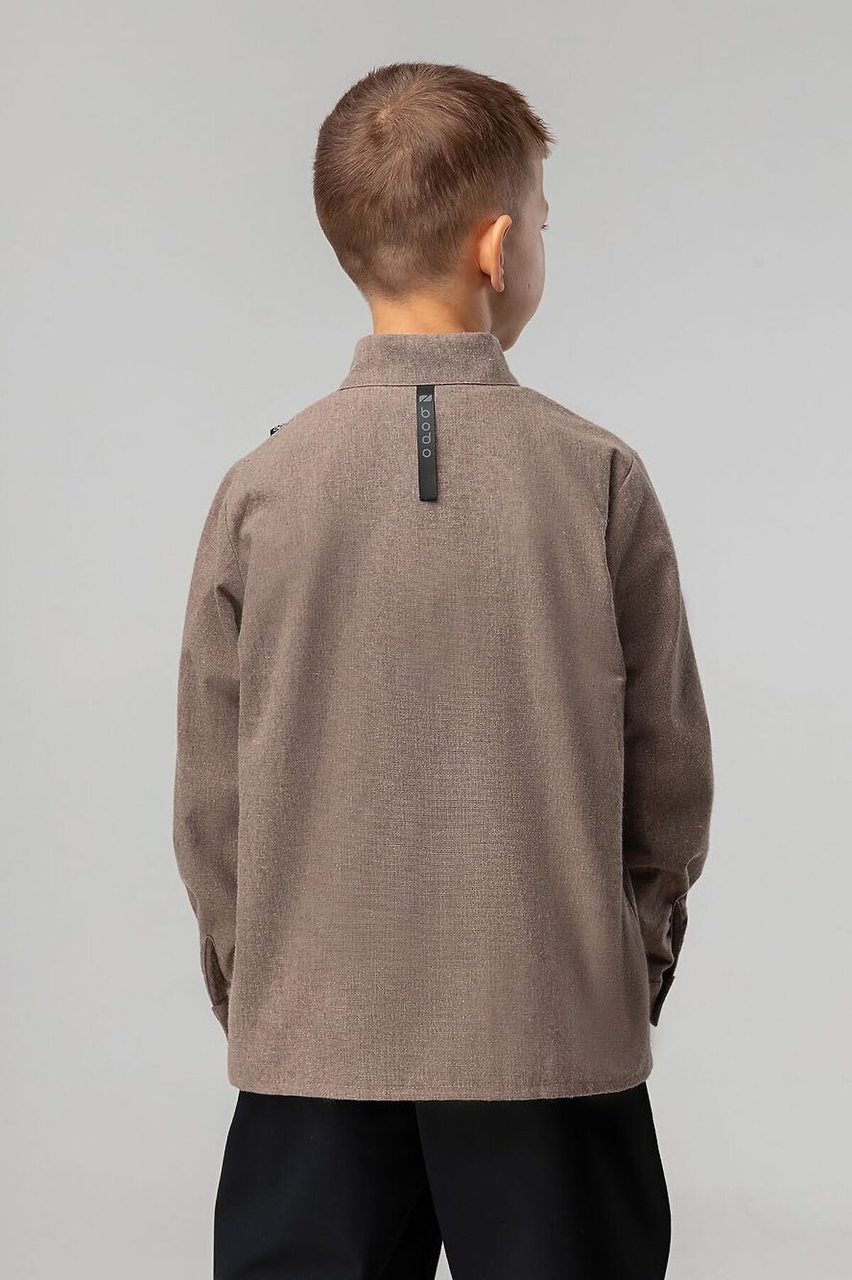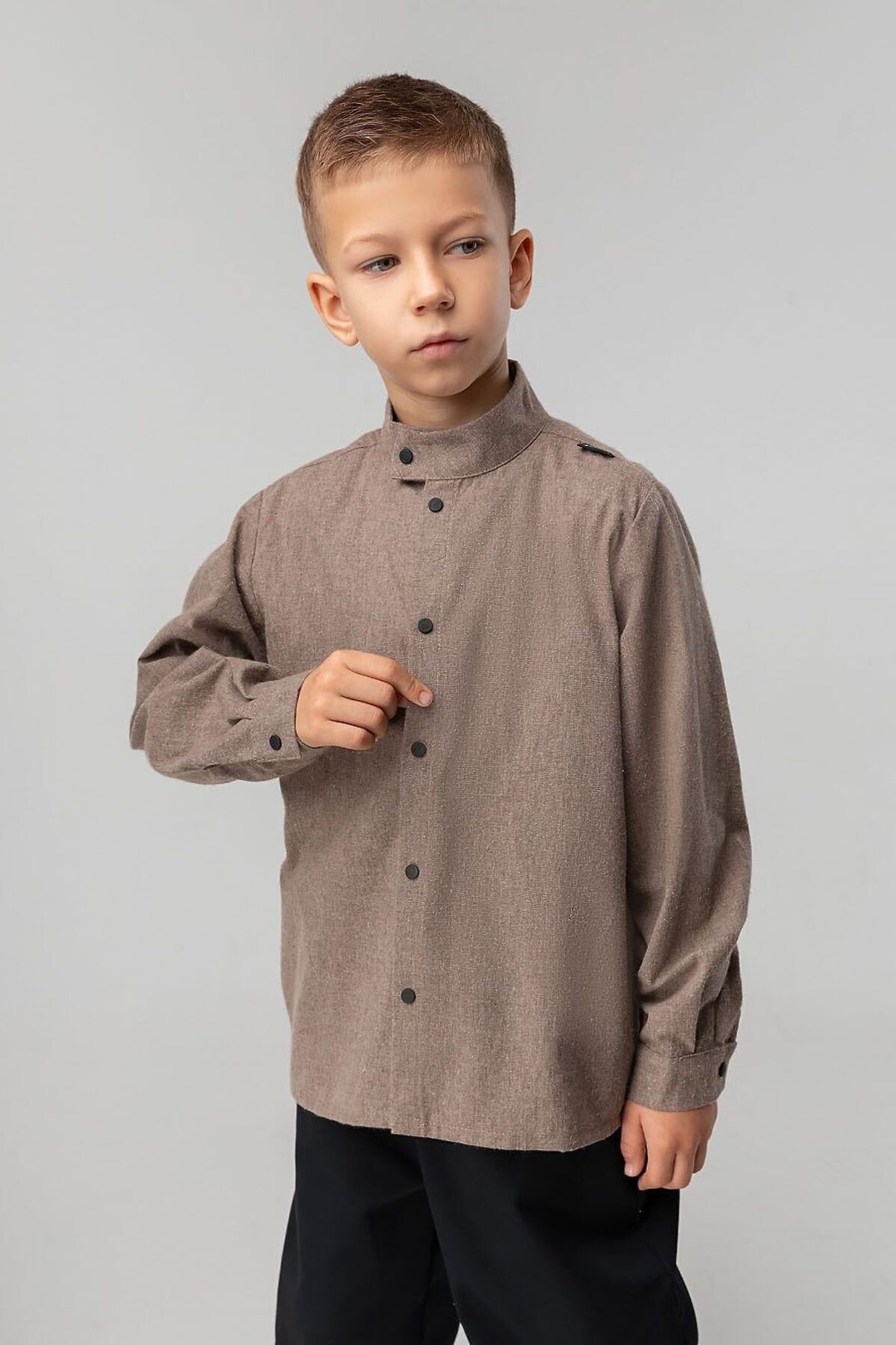 Рубашка без подкладки на кнопках, прямого силуэта, с воротником-стойка, с длинными рукавами с манжетой на кнопке. Низ изделия прямой. По низу рукава — защипы. На спинке брендированная лента