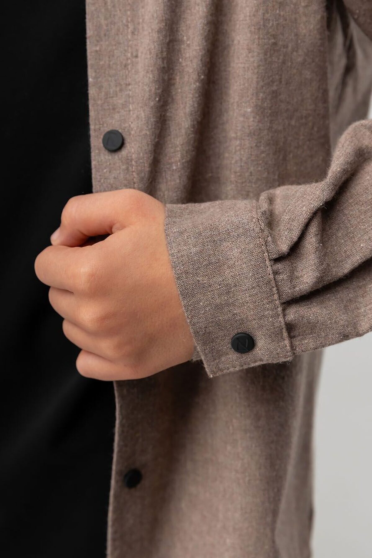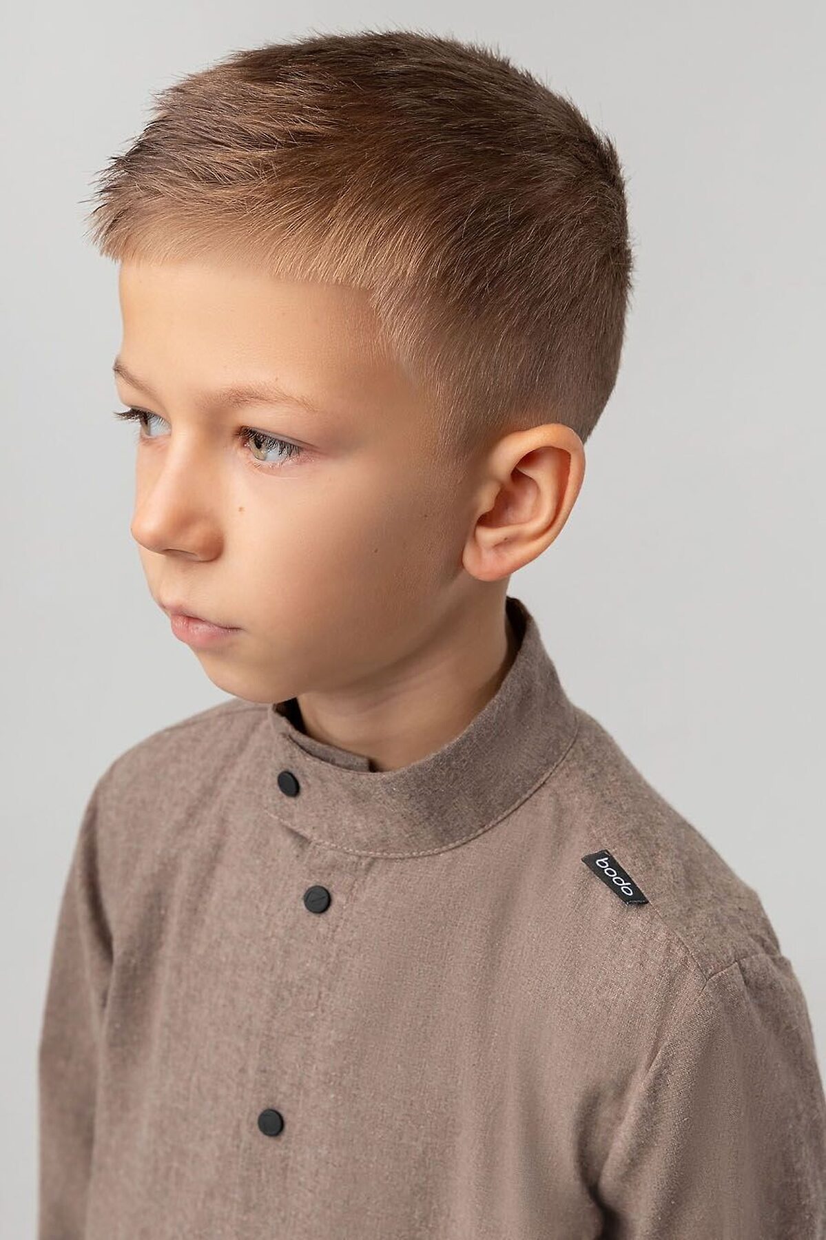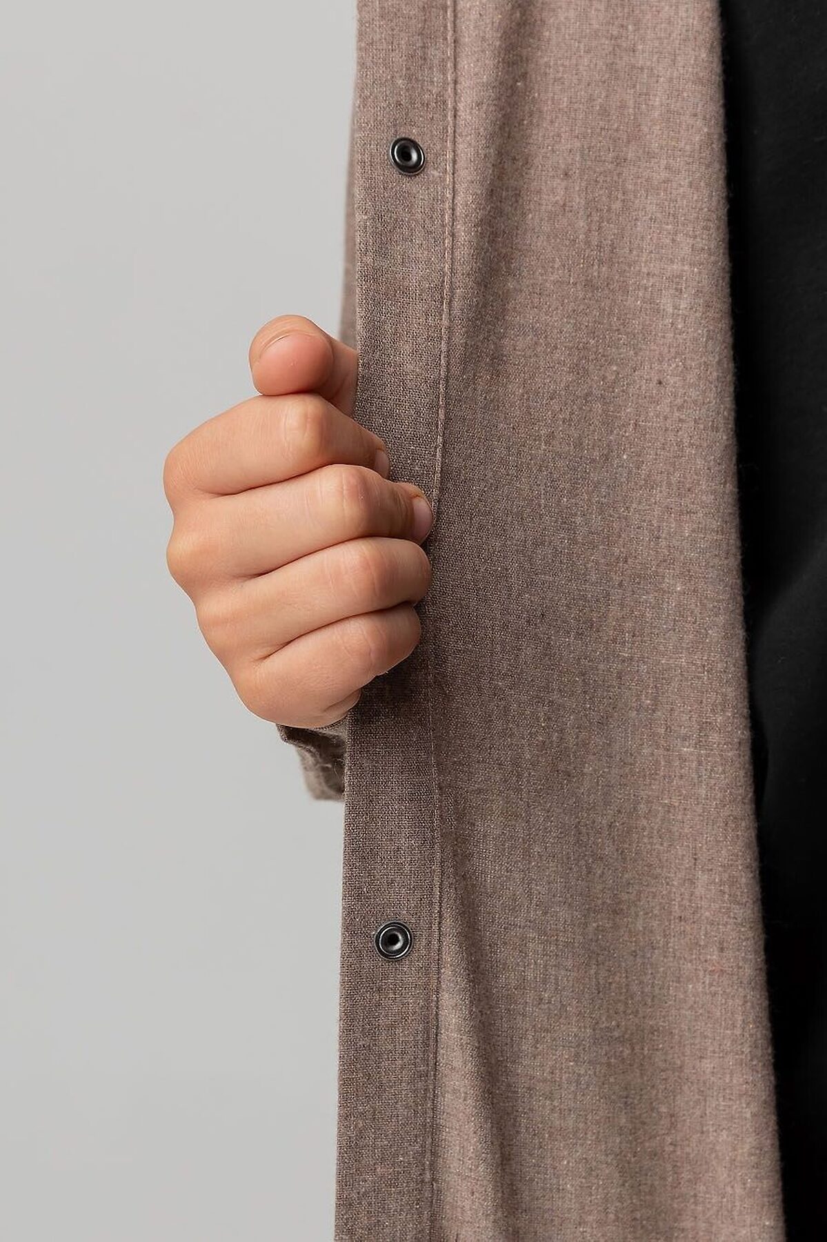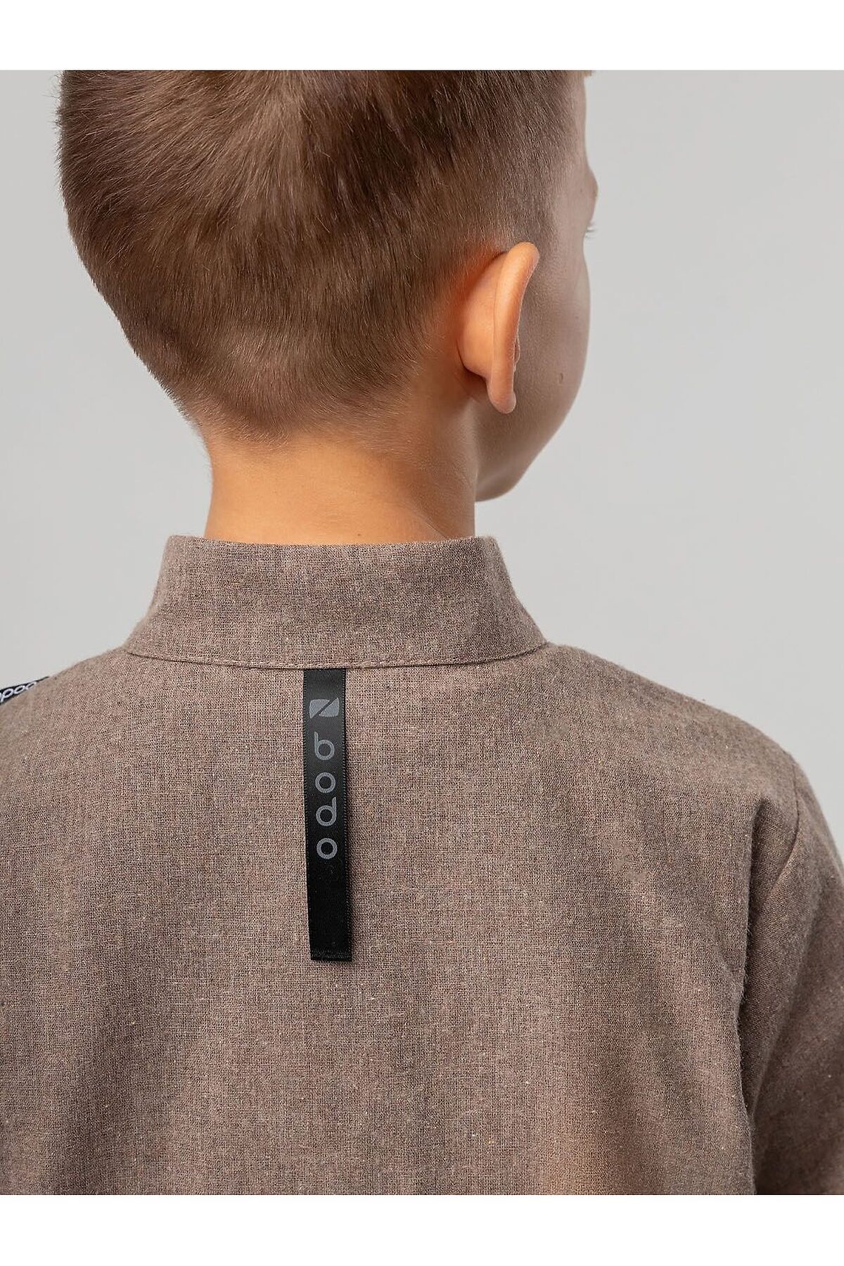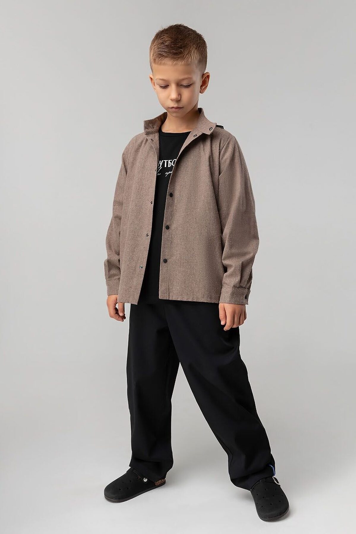 Рубашка без подкладки на кнопках, прямого силуэта, с воротником-стойка, с длинными рукавами с манжетой на кнопке. Низ изделия прямой. По низу рукава — защипы. На спинке брендированная лента