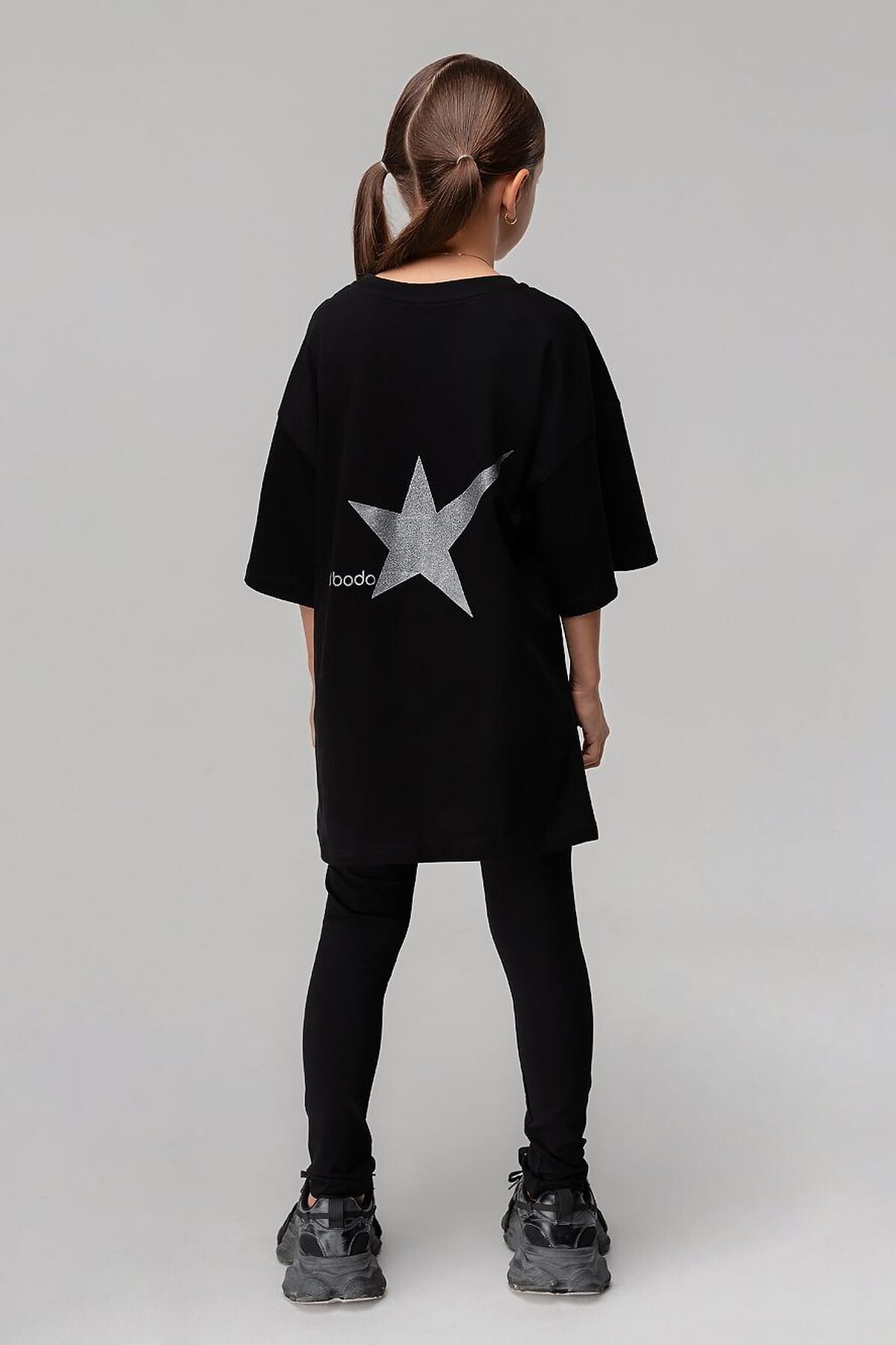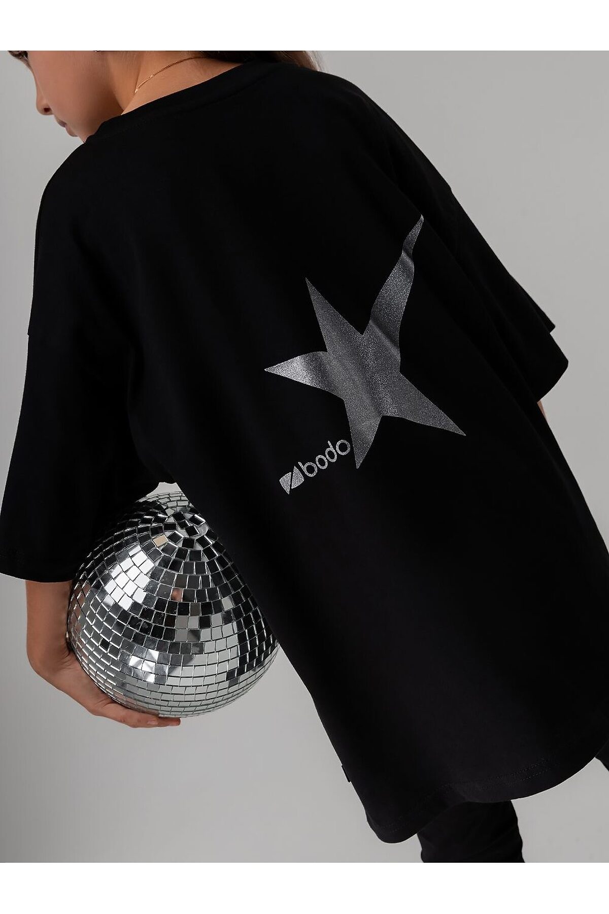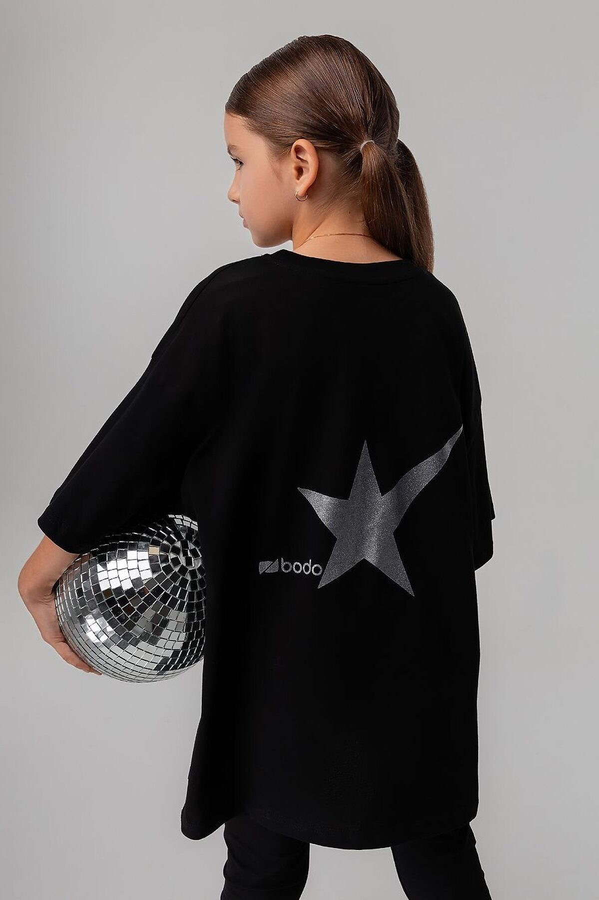Свободная футболка с коротким рукавом. Горловина футболки округлой формы. Низ изделия прямой. Принт на спинке "звезда"