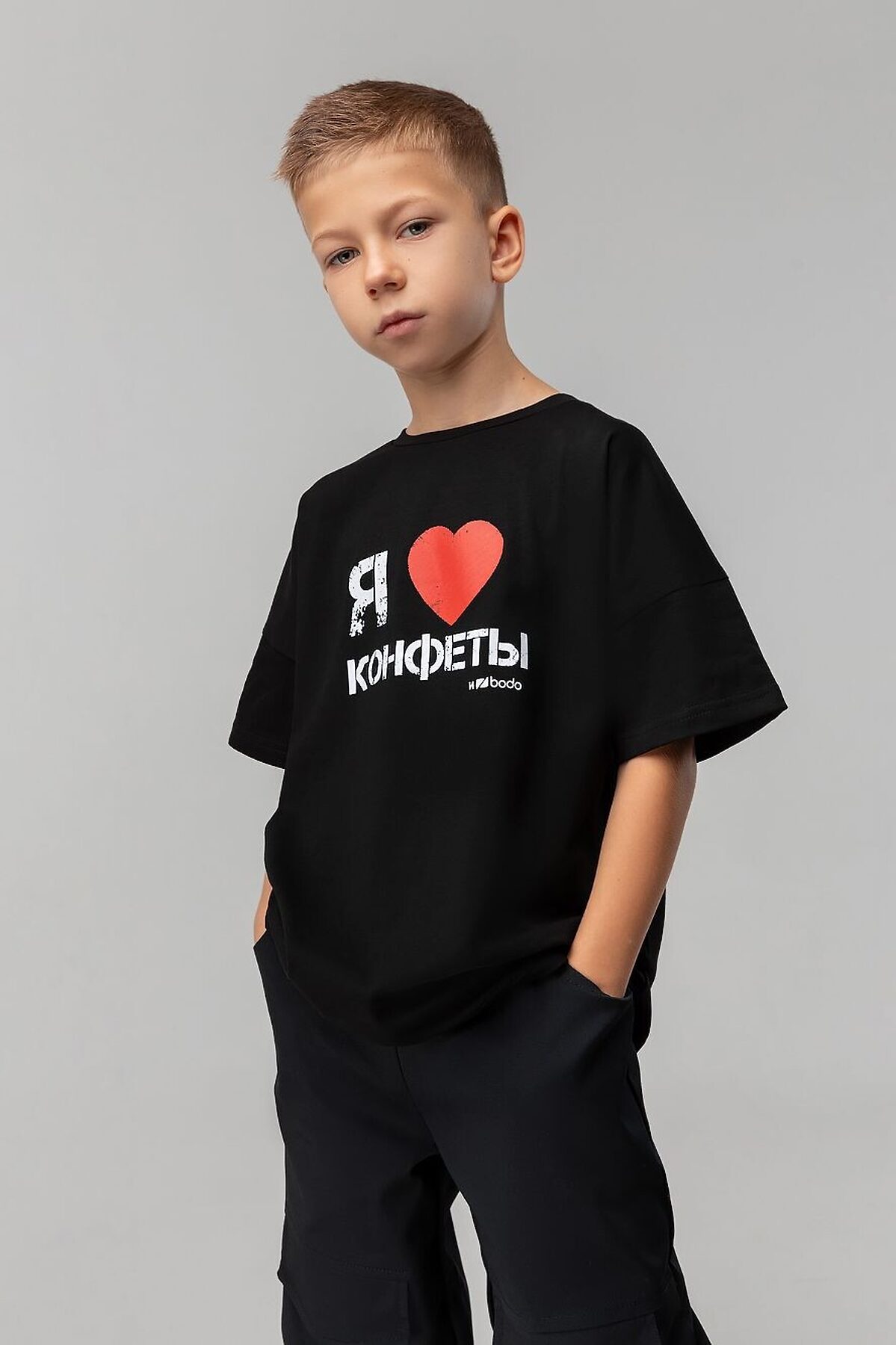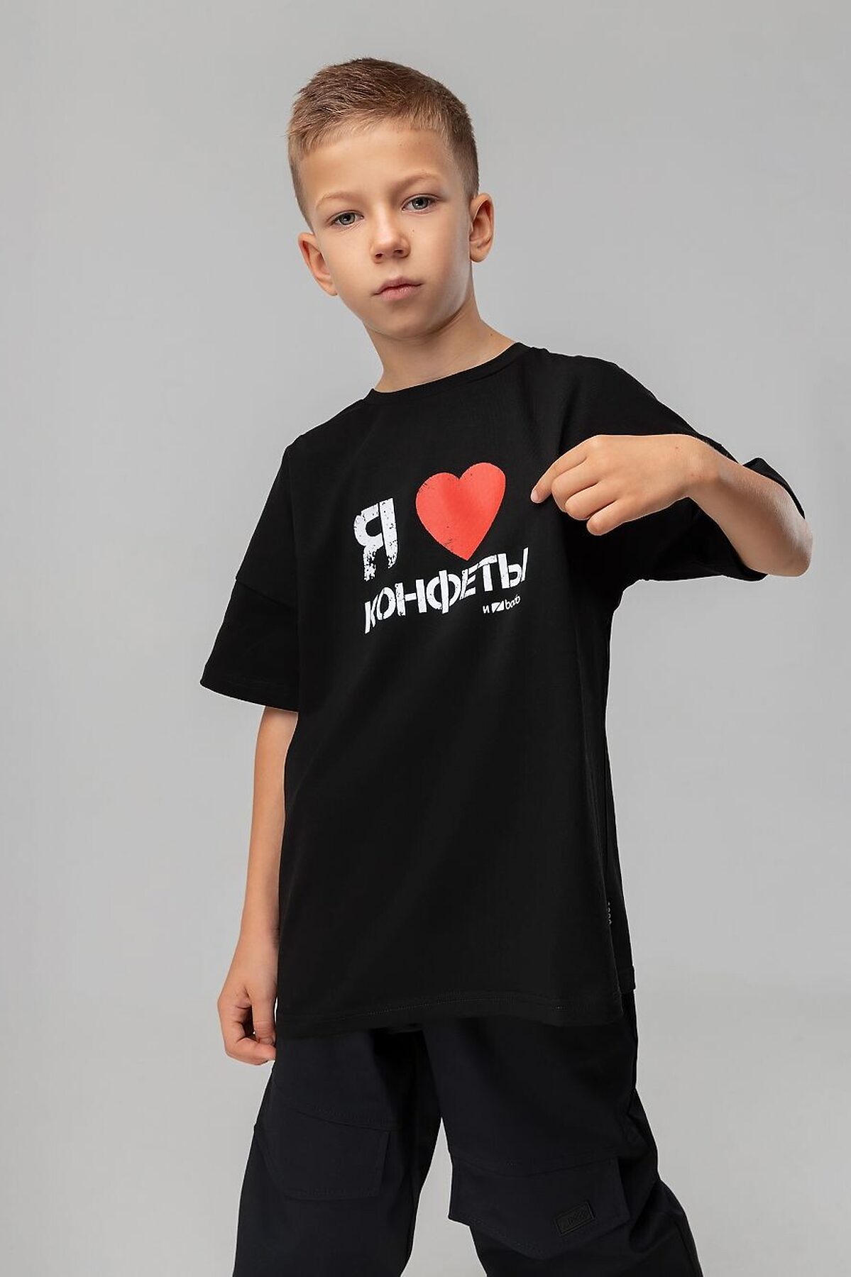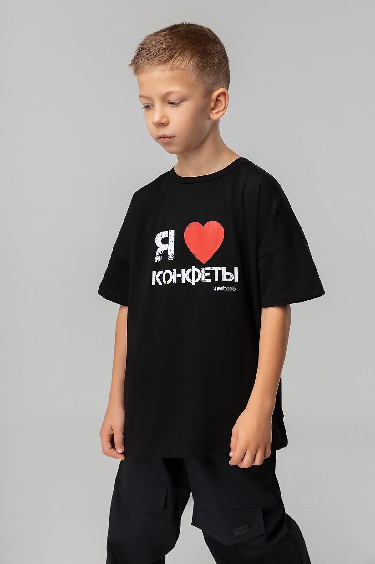 Свободная футболка с коротким рукавом. Горловина футболки округлой формы. Низ изделия прямой. Принт на полочке " Я люблю конфеты"