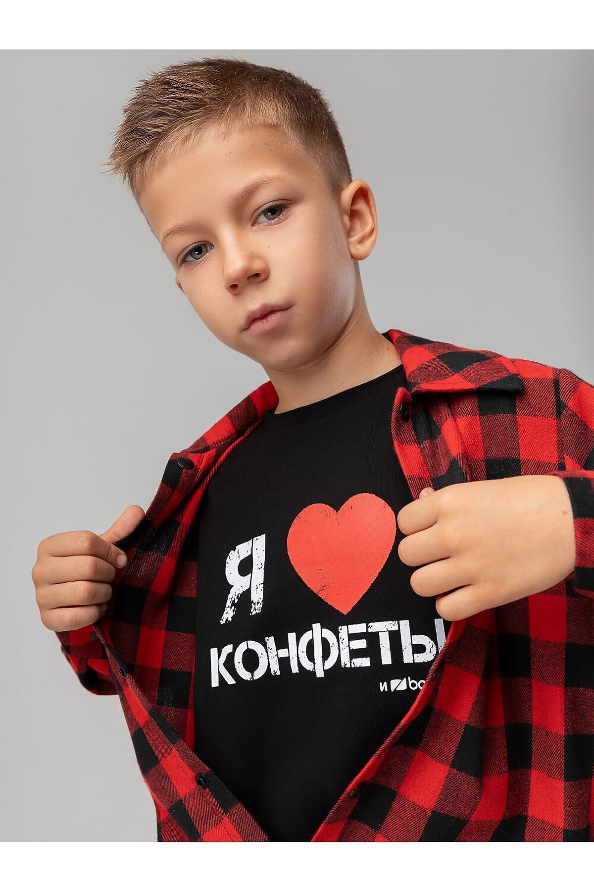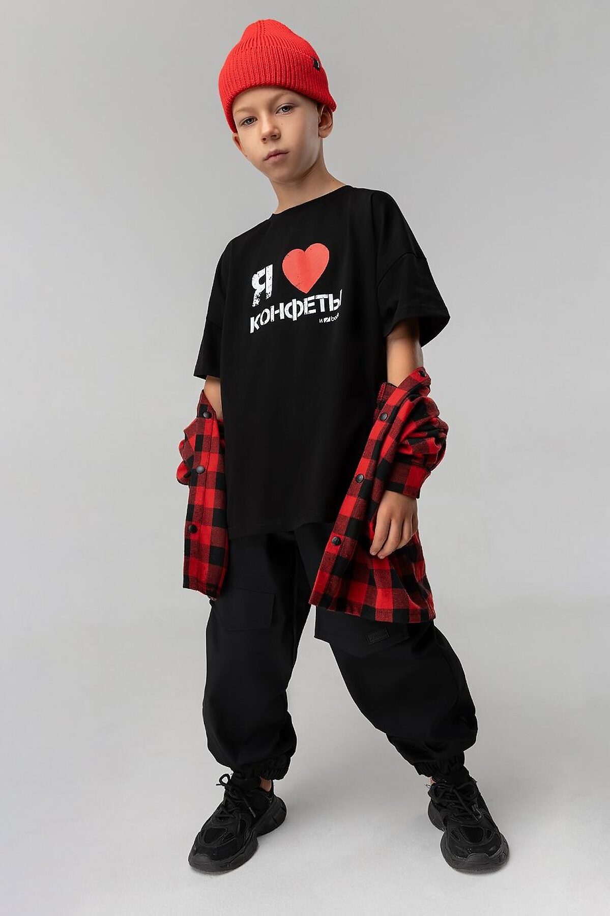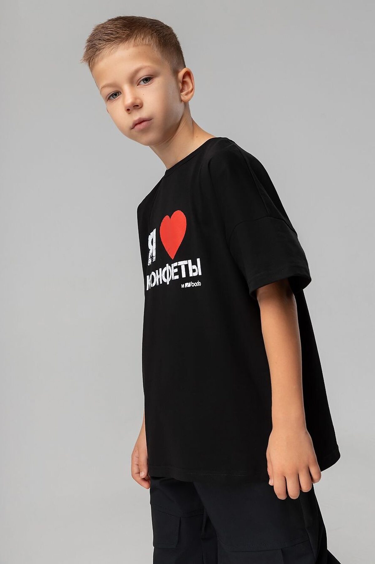 Свободная футболка с коротким рукавом. Горловина футболки округлой формы. Низ изделия прямой. Принт на полочке " Я люблю конфеты"