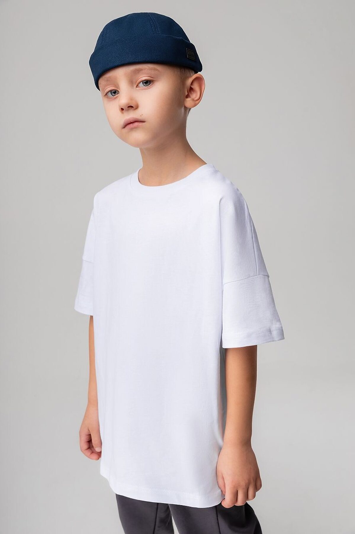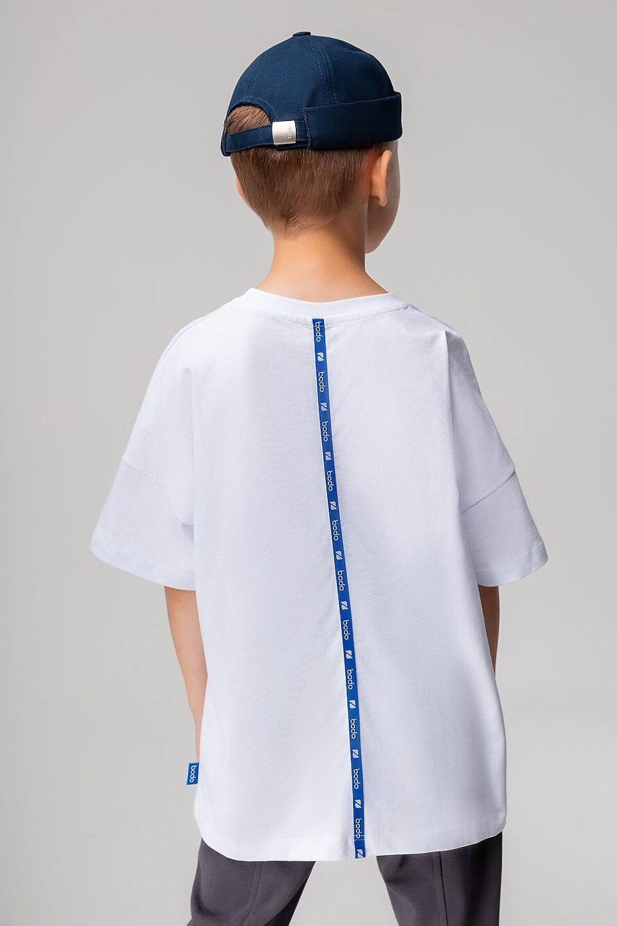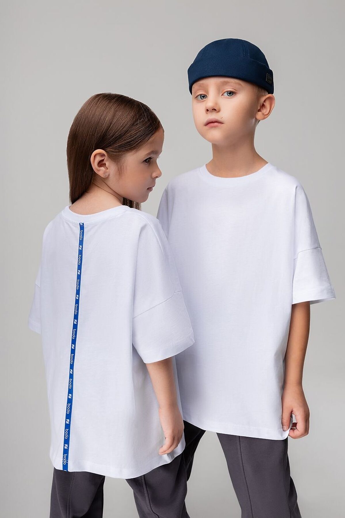 Свободная футболка с коротким рукавом. Горловина футболки округлой формы. Низ изделия прямой. На спинке брендированная лента