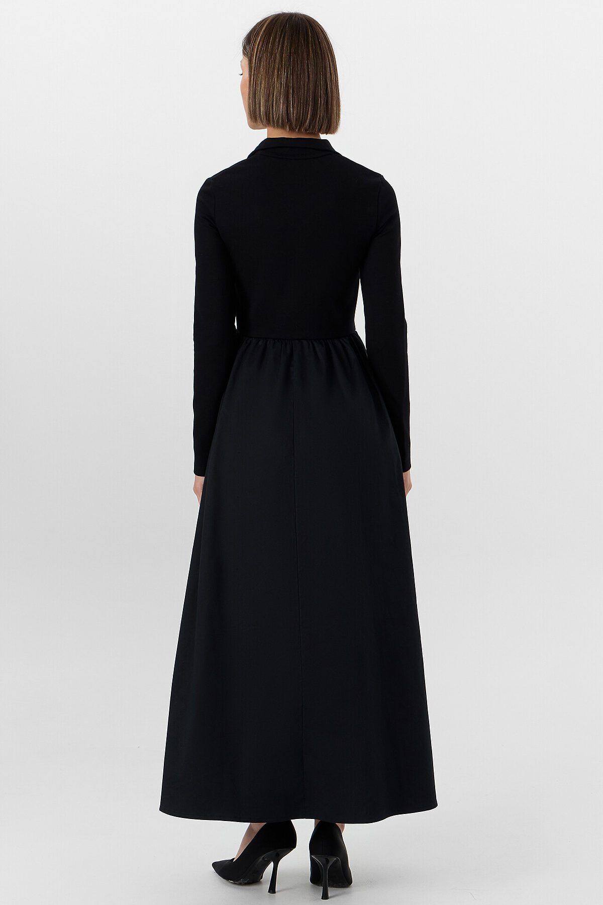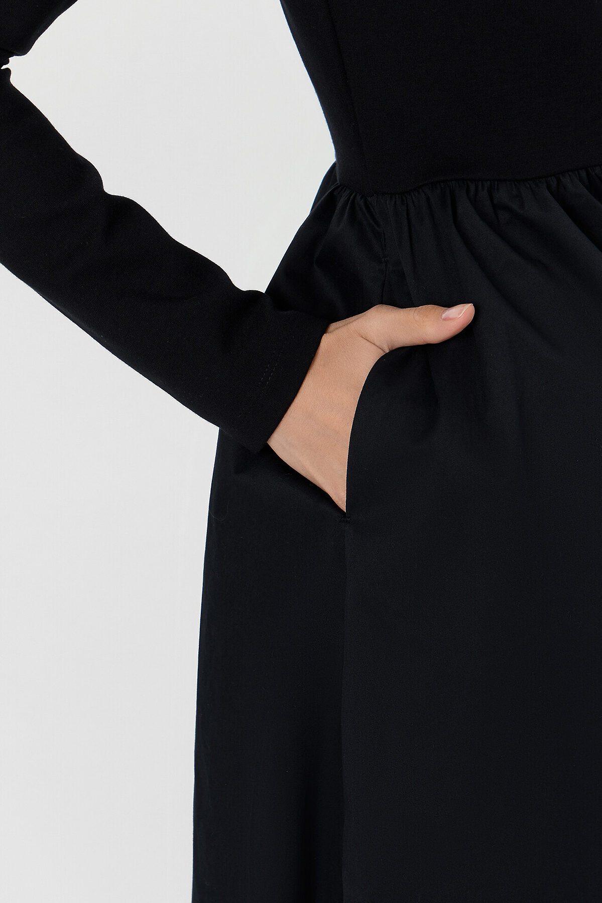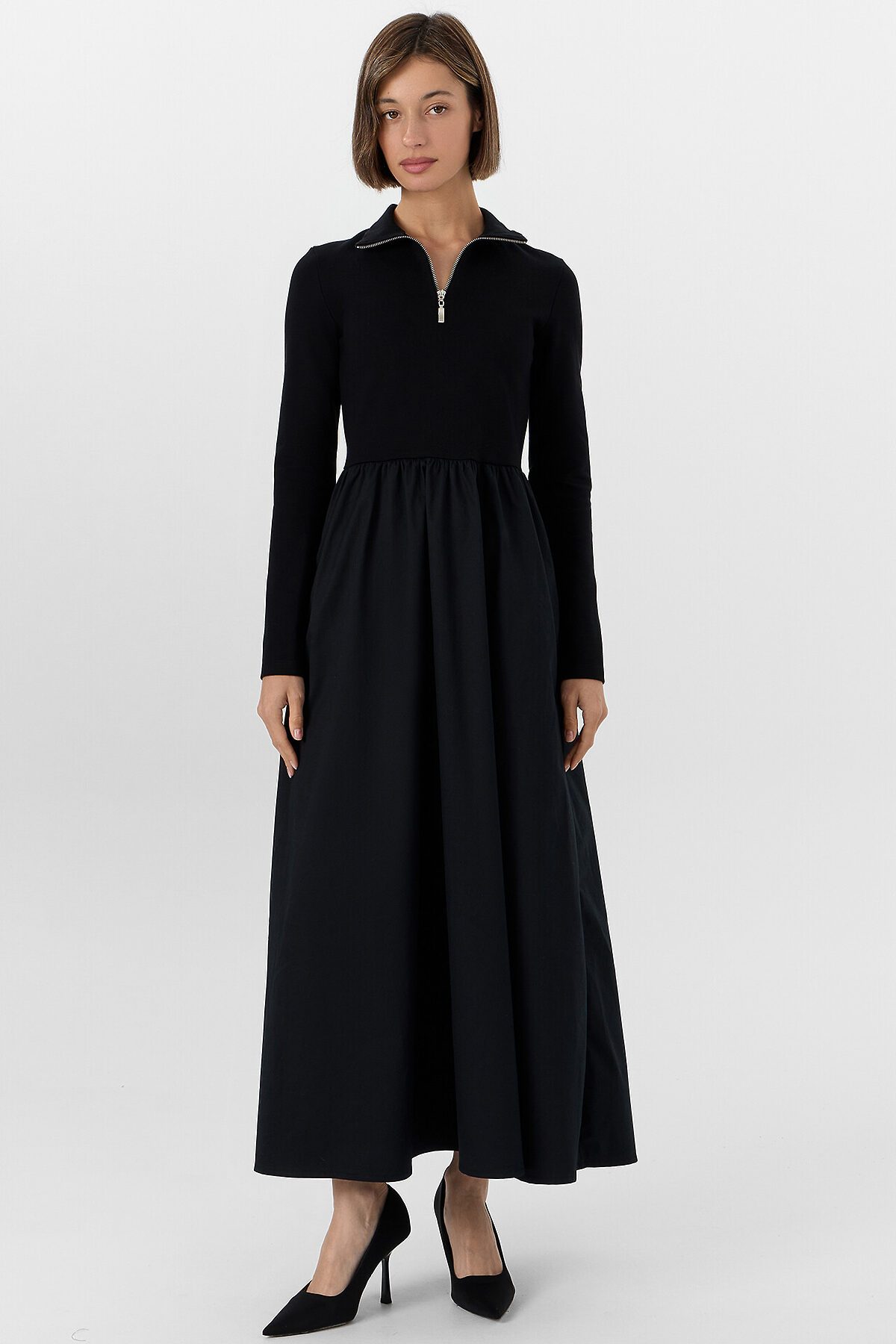 Женское платье прилегающего силуэта миди-длины создает элегантный и женственный образ. Модель отрезная по линии талии, где нижняя часть мягко собрана в складки, образуя изящный объем. Удобная круглая горловина с аккуратным воротником дополнена застежкой на молнию спереди. Длинные узкие рукава подчеркивают строгость силуэта, а функциональные боковые карманы добавляют практичности.