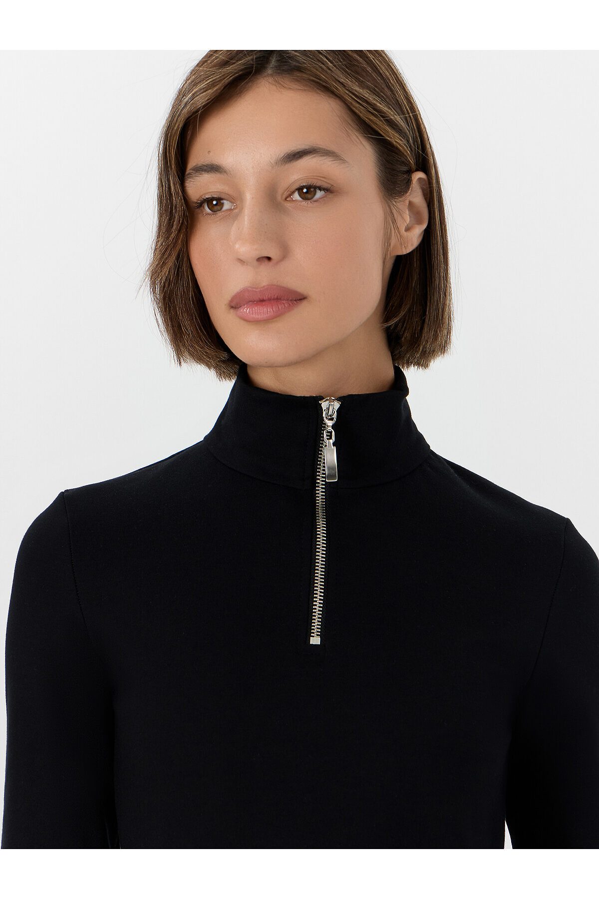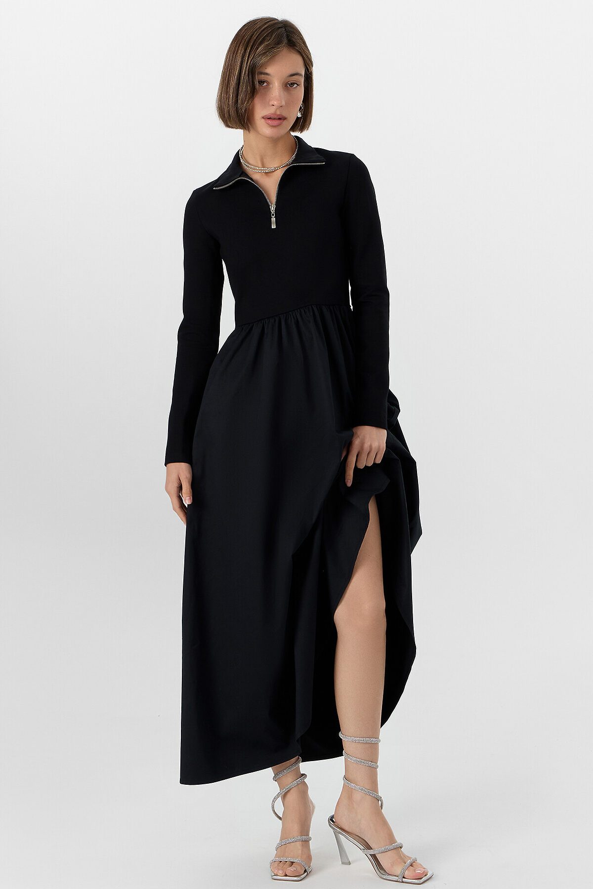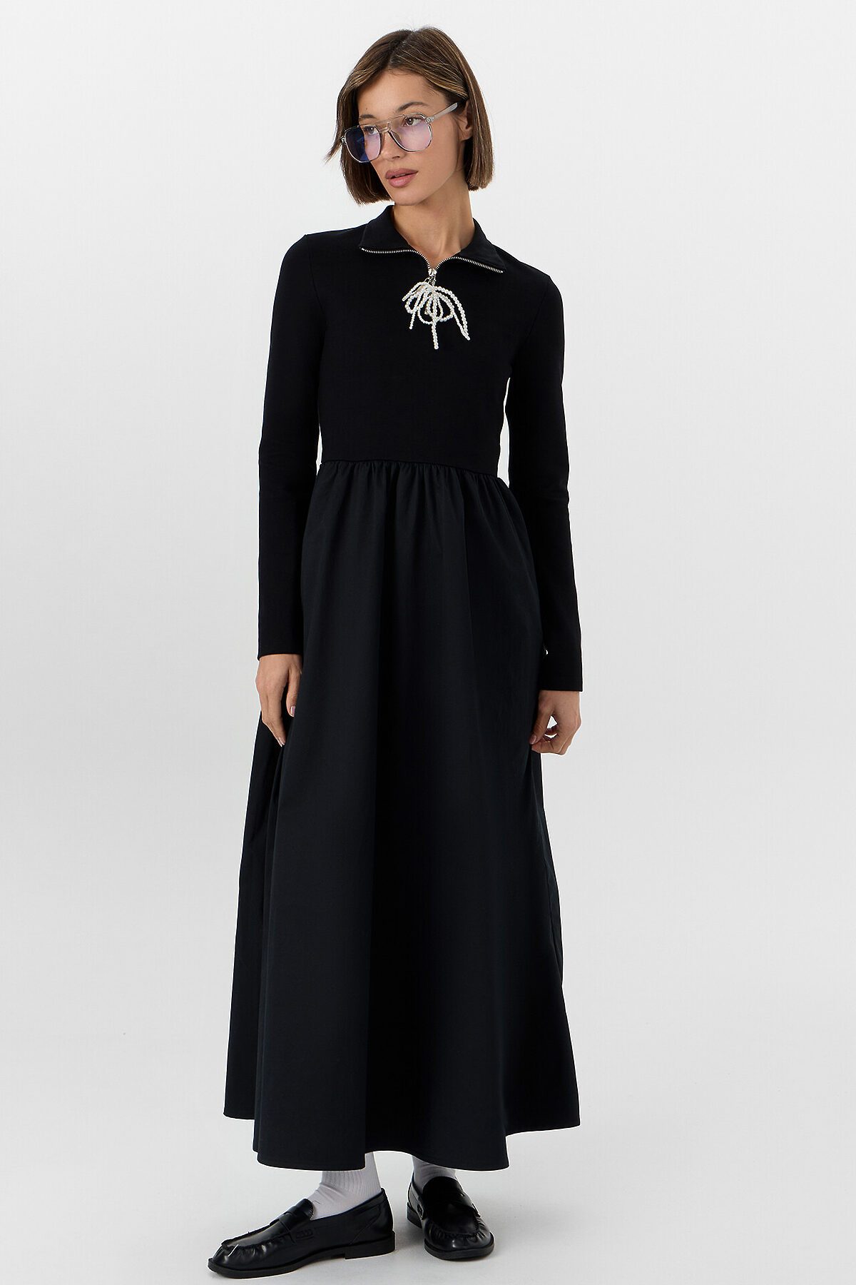 Женское платье прилегающего силуэта миди-длины создает элегантный и женственный образ. Модель отрезная по линии талии, где нижняя часть мягко собрана в складки, образуя изящный объем. Удобная круглая горловина с аккуратным воротником дополнена застежкой на молнию спереди. Длинные узкие рукава подчеркивают строгость силуэта, а функциональные боковые карманы добавляют практичности.