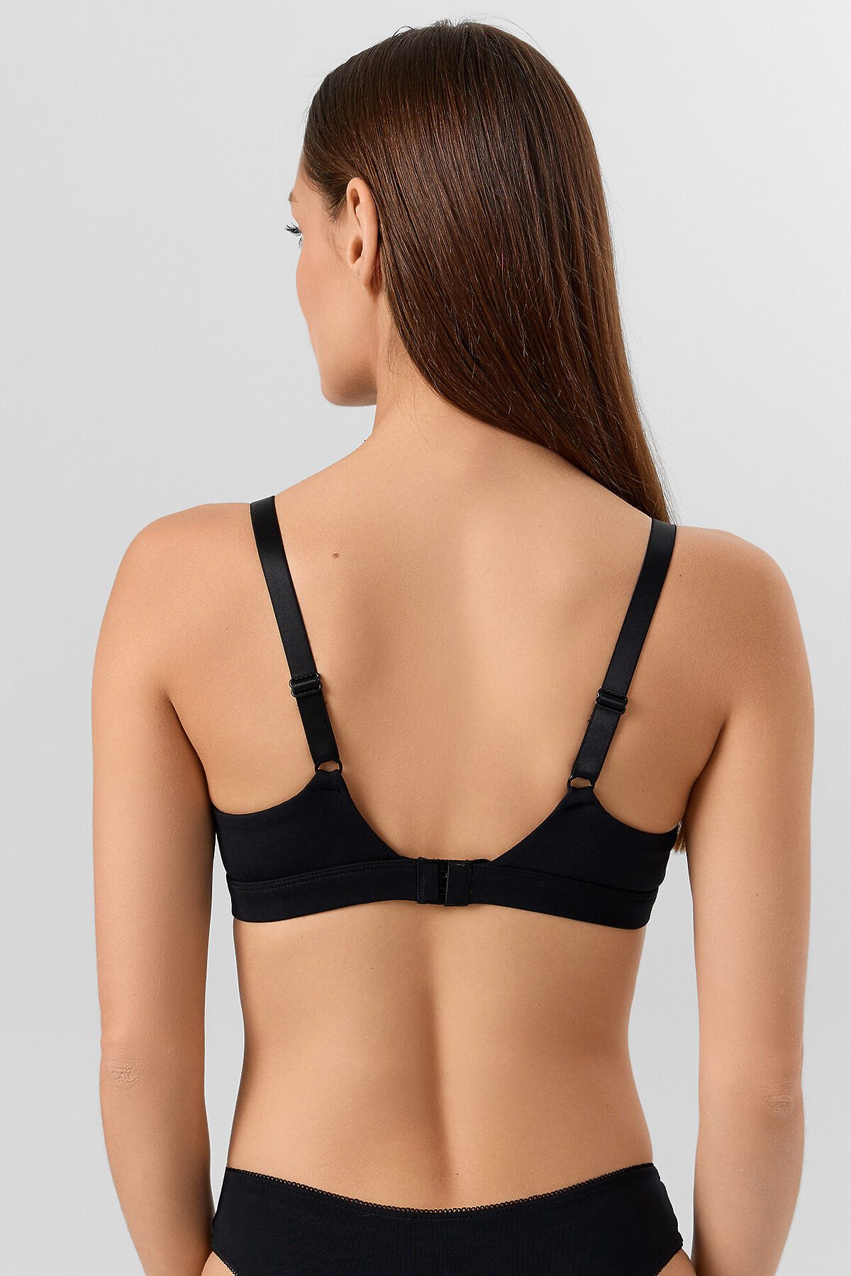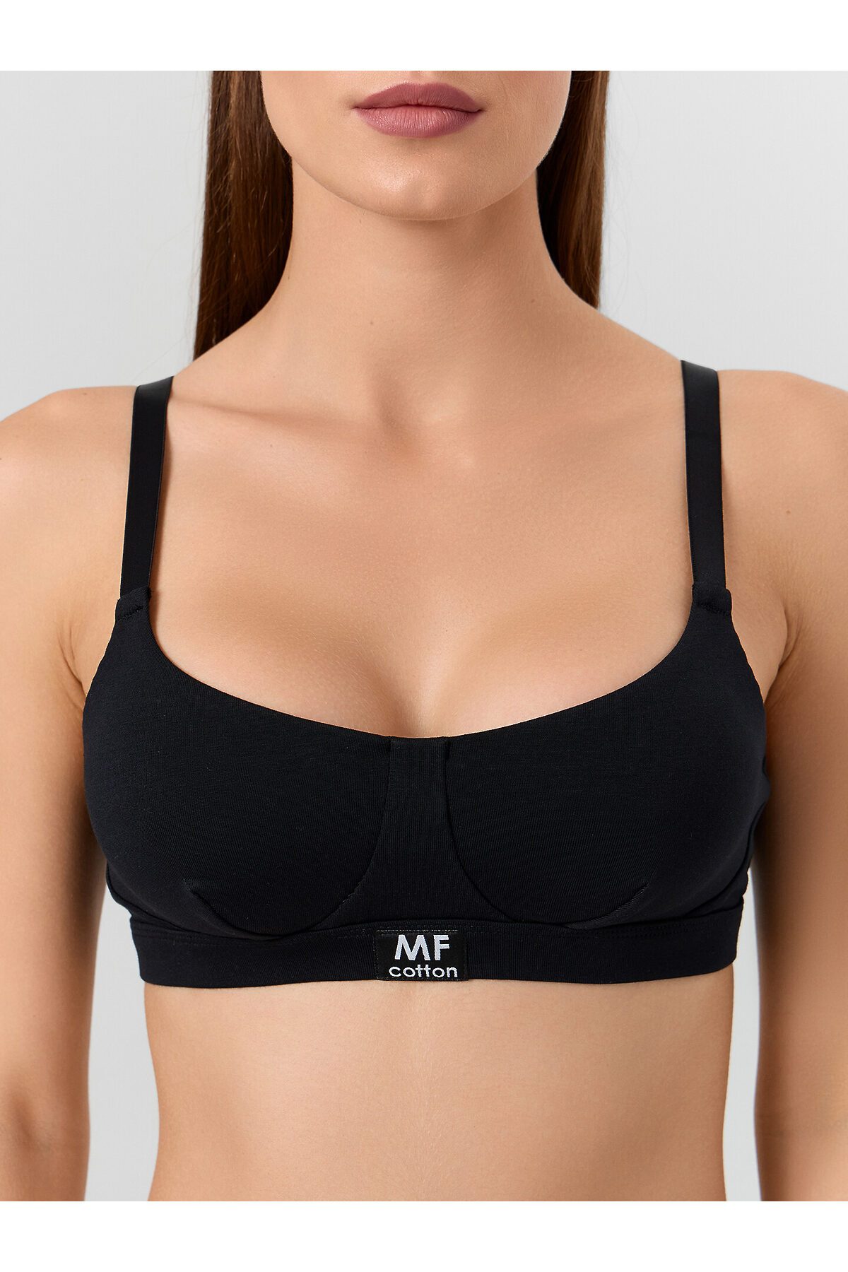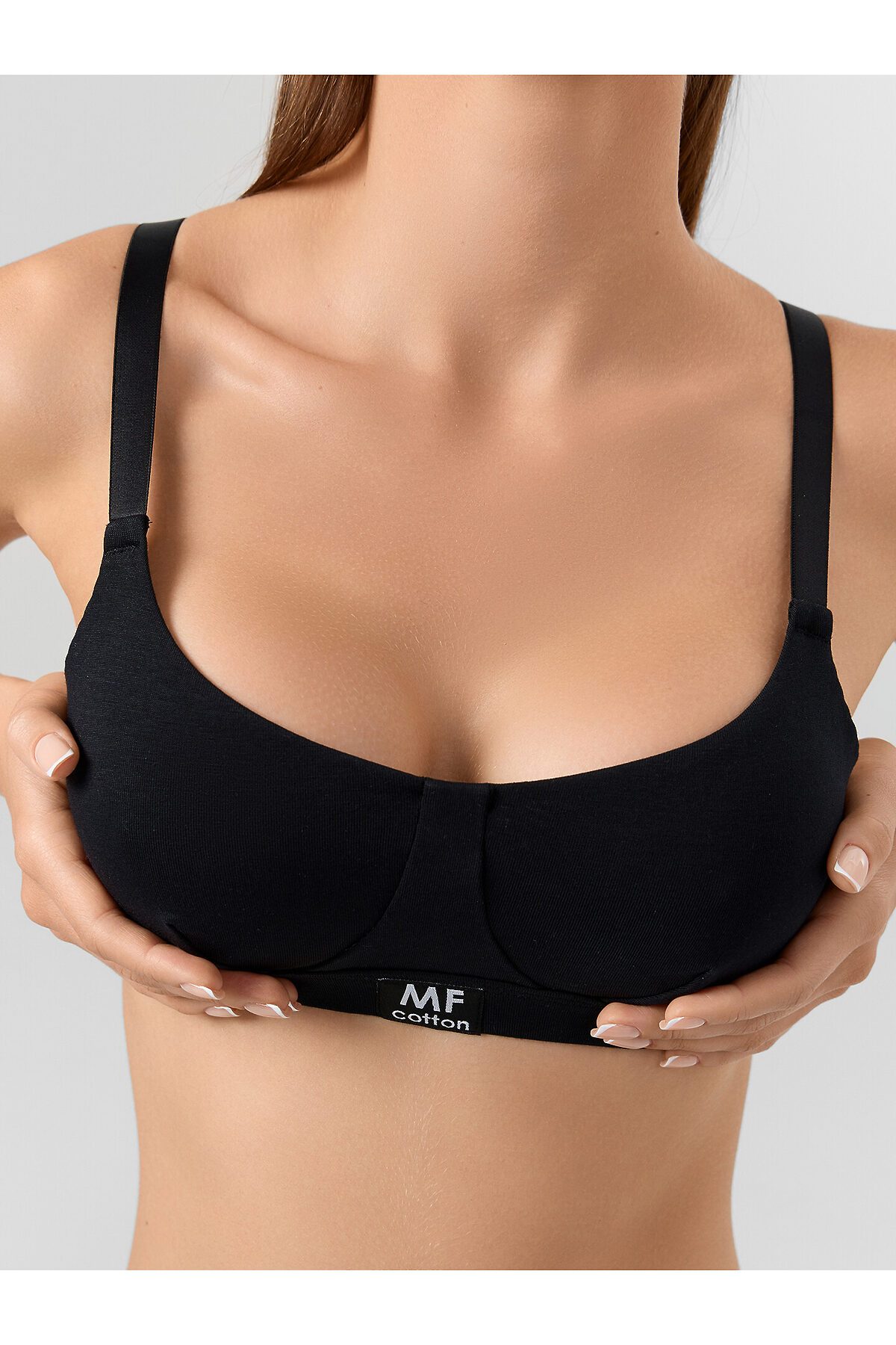 Бюстгальтер с мягкими чашками, без каркасов. Чашки выполнены из хлопка, на подкладке из хлопка. Чашки с вытачками. Чашки обтачаны подкладкой по линии декольте и пойме, внутри жилка. Ластовица выполнена из хлопка на подкладке из хлопка с монокапроном внутри. Отрезные бочки из хлопка на подкладке из хлопка. Верхний срез бочка обработан жесткой тесьмой, по размерам (внутренняя обработка, по лицевой стороне строчки нет). Нижний срез стана обработан обтачкой из хлопка с внутренней резиной. Бретель с регулировкой по размерам. Застежка двойная.