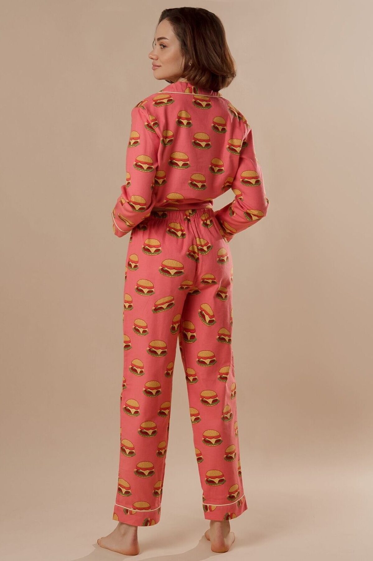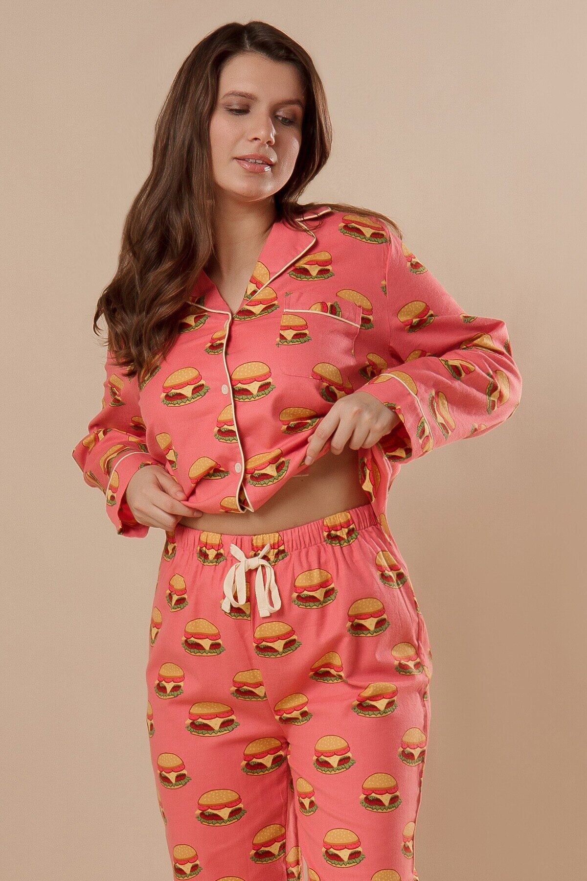 Домашняя пижама от торговой марки Индефини. В комплекте рубашка и брюки. Рубашка из хлопка, оранжево-персикового цвета, с принтом, с длинными рукавами, с воротником-отворотом, с кармашком на груди, с обрамлением, на пуговичках, прямая, свободного кроя. Брюки из хлопка, оранжево-персикового цвета, с принтом, прямые, свободного кроя, с обрамлением, на мягкой резинке, с регулирующей лентой.