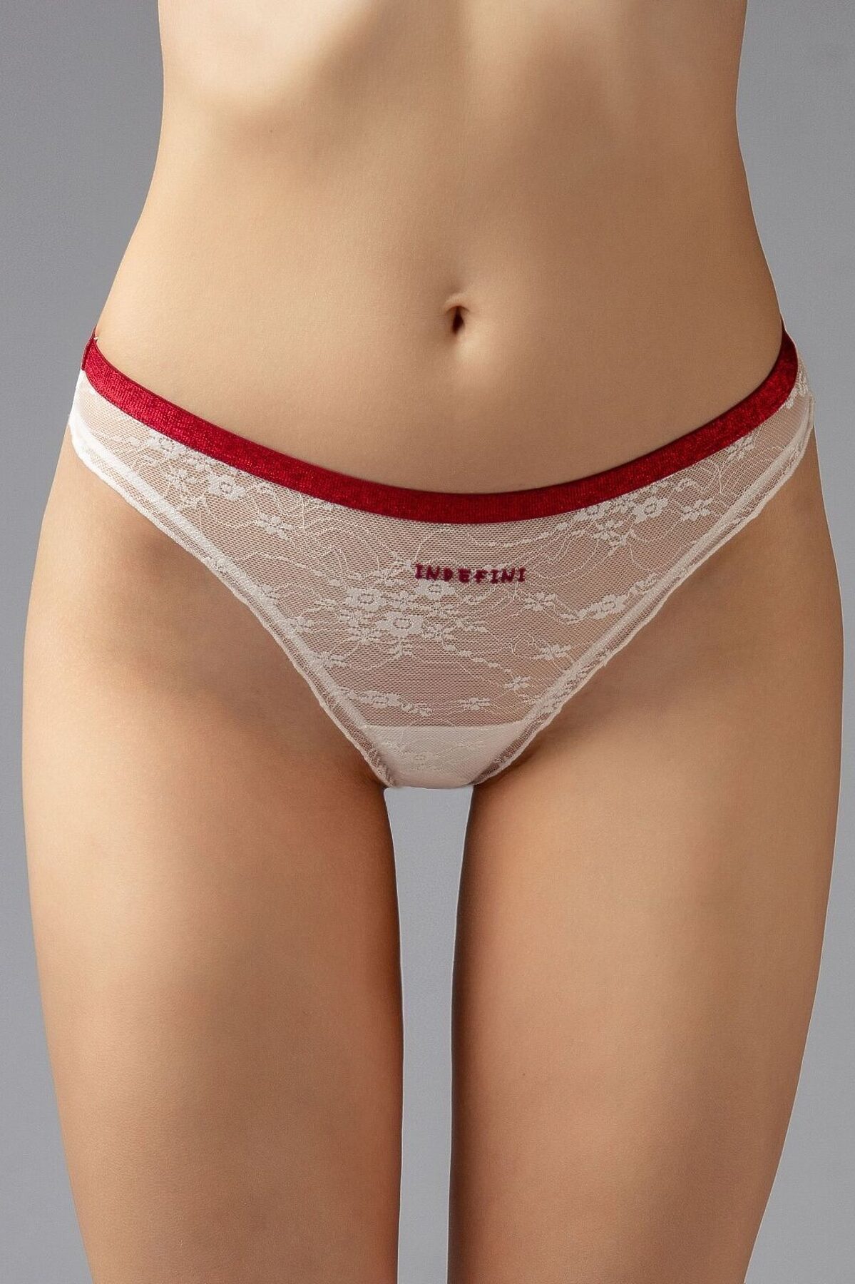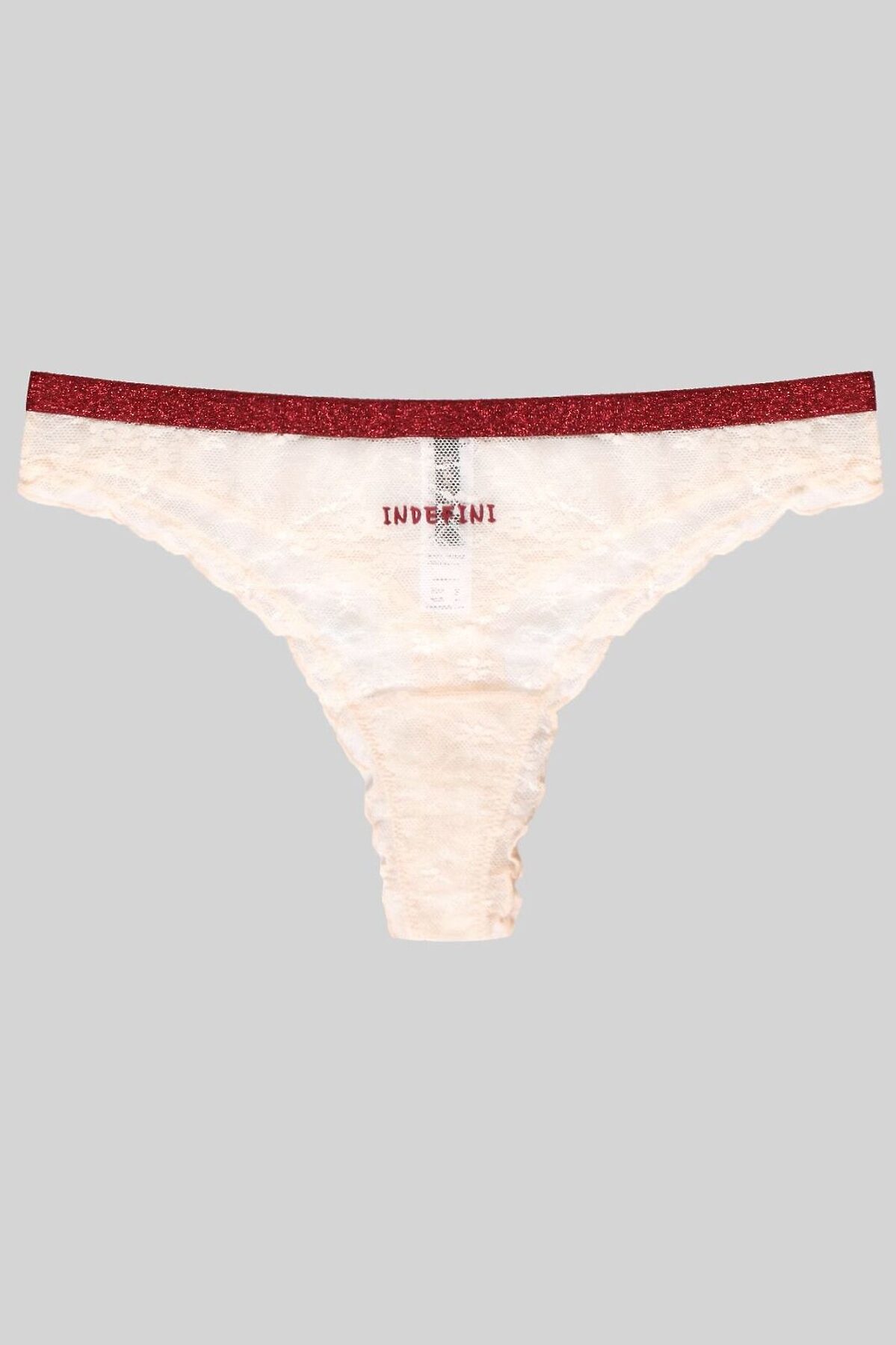Женские трусы от торговой марки Индефини. Трусы-стринги из кружевной ткани, персикового цвета, с принтом, с кружевными вставками, на мягкой резинке, средней посадки.